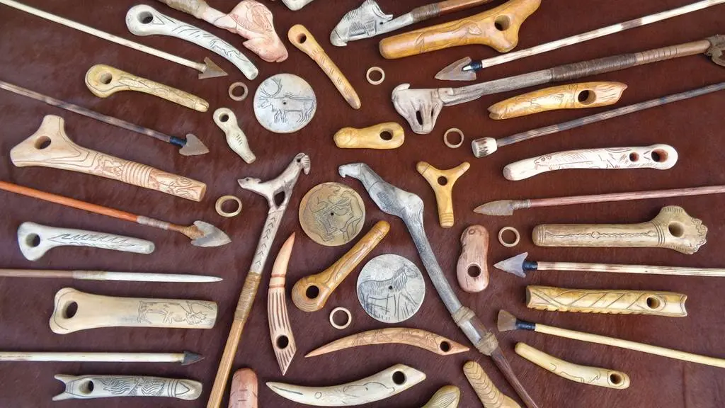 Collections d'objets ornés du quotidien préhistorique et les plus anciennes armes de chasse retrouvés à Bruniquel et en Europe.