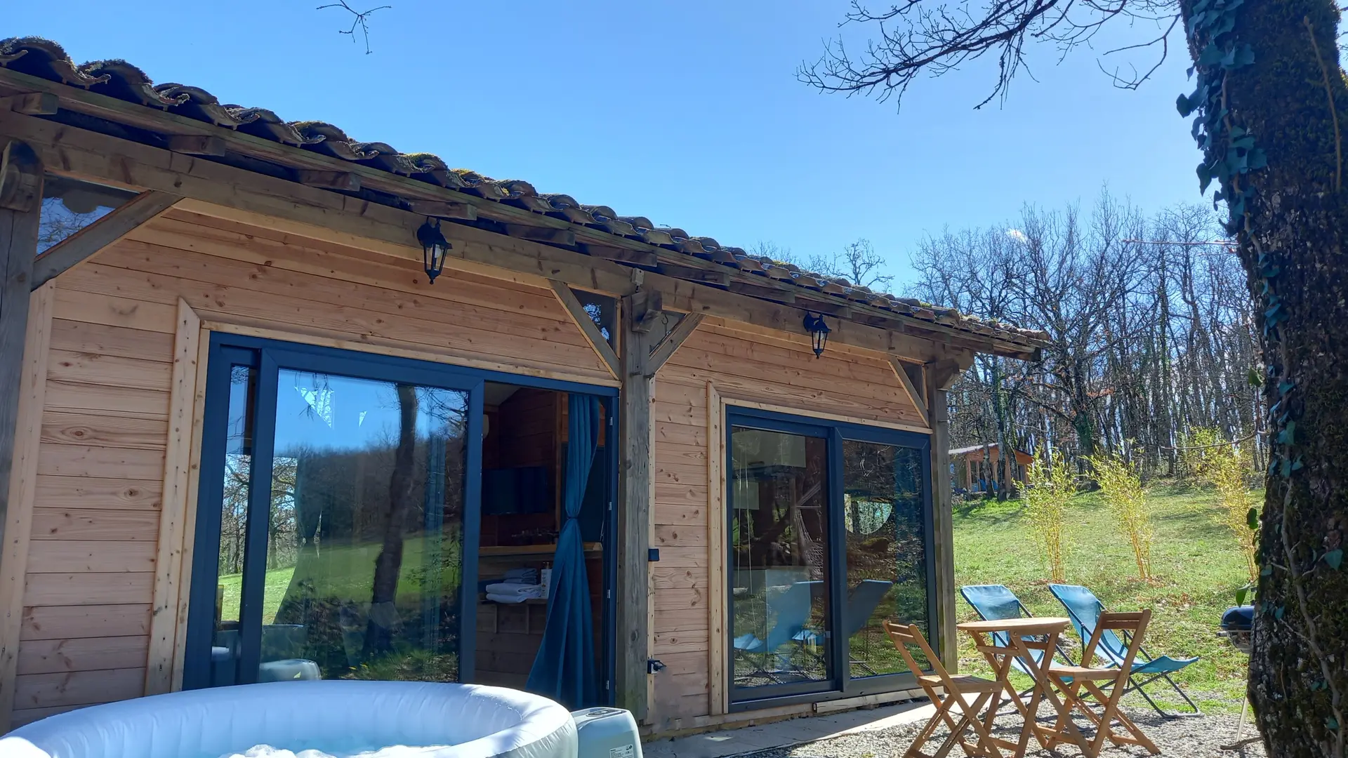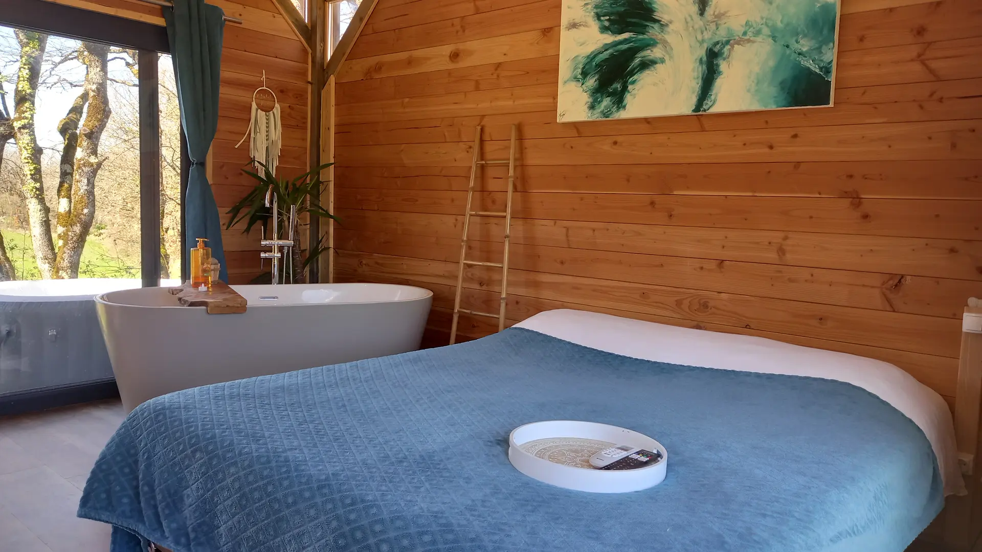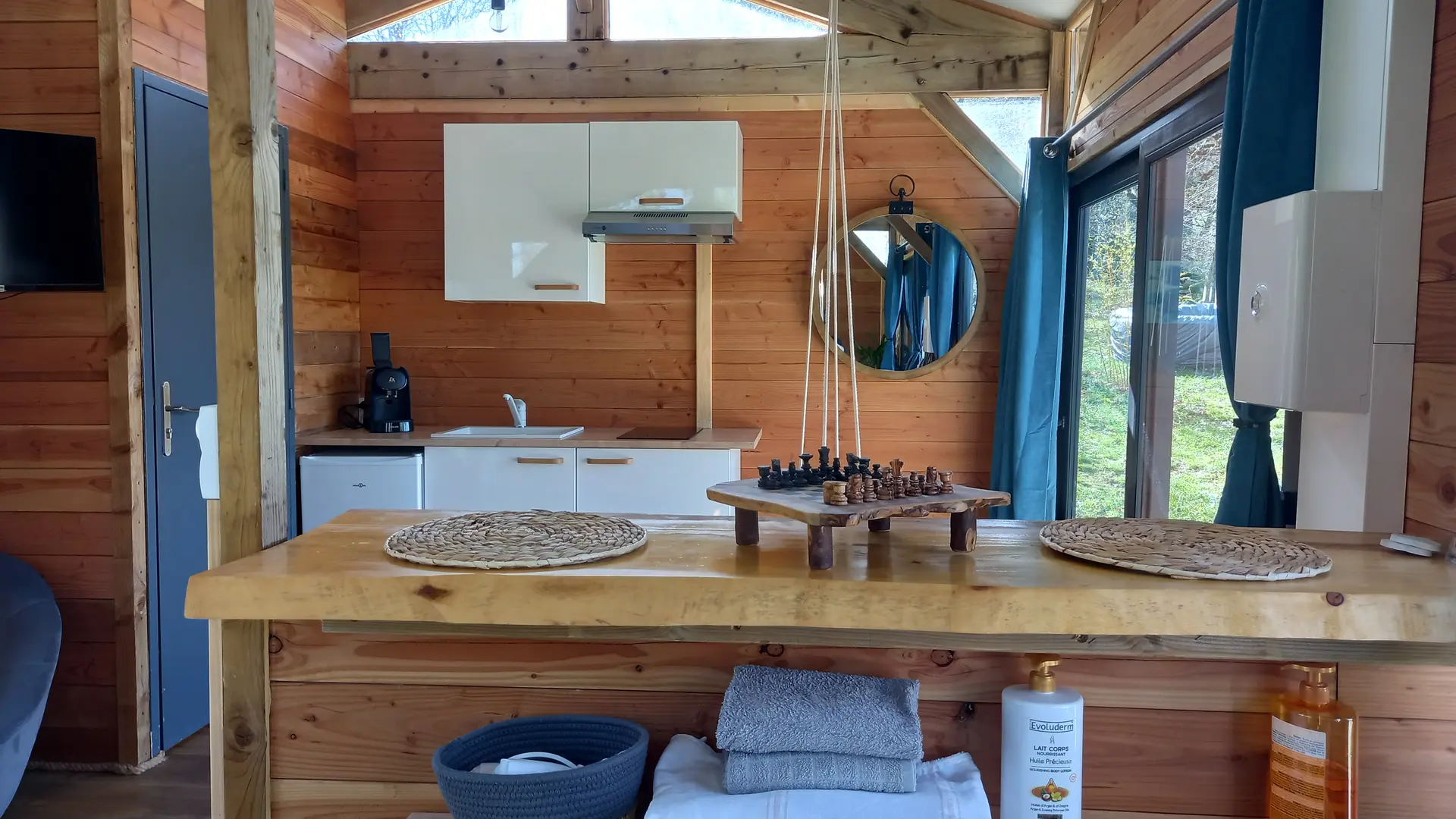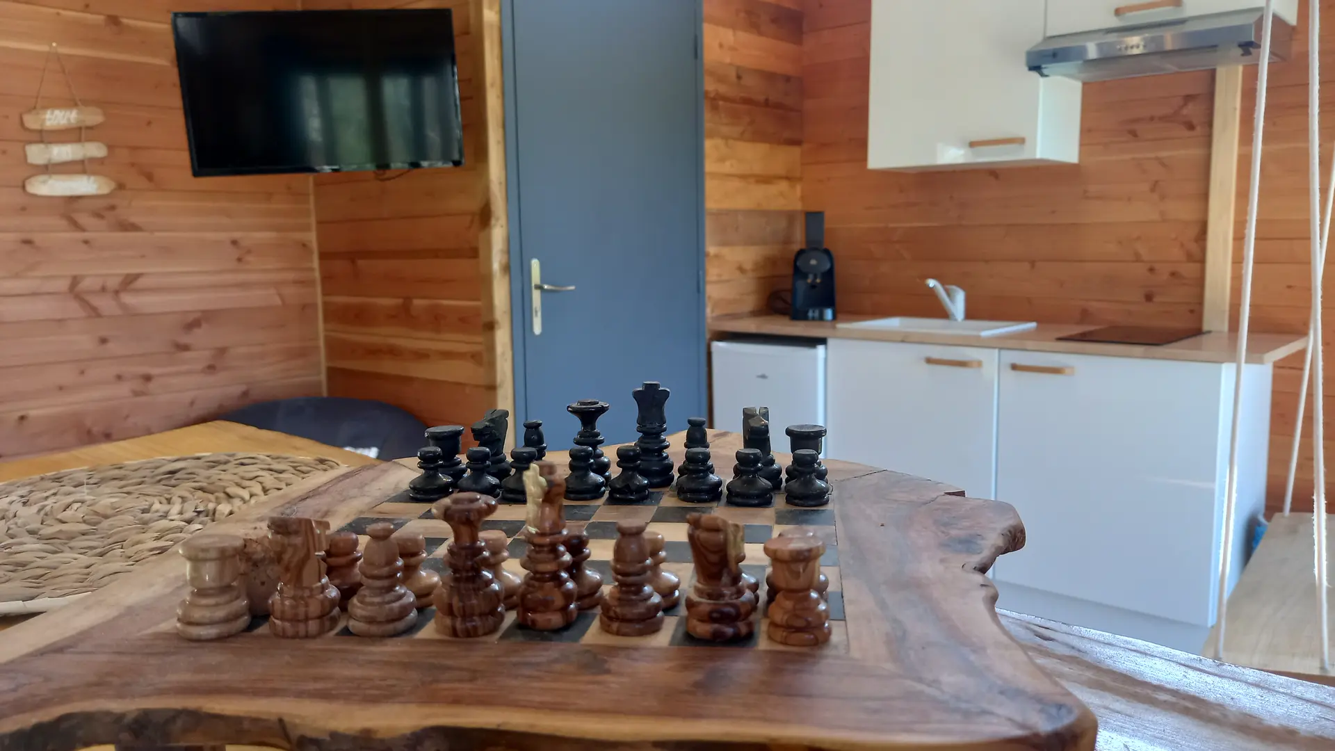 Le chalet Dalo est équipé d'un espace cuisine avec deux plaques de cuisson, réfrigérateur, cafetière, grille pain et barbecue, d'un espace nuit avec 1 lit 160x200, baignoire, TV écran plat et fauteuils. Pour des moments hors du commun, profitez de votre spa privatif sur la terrasse.