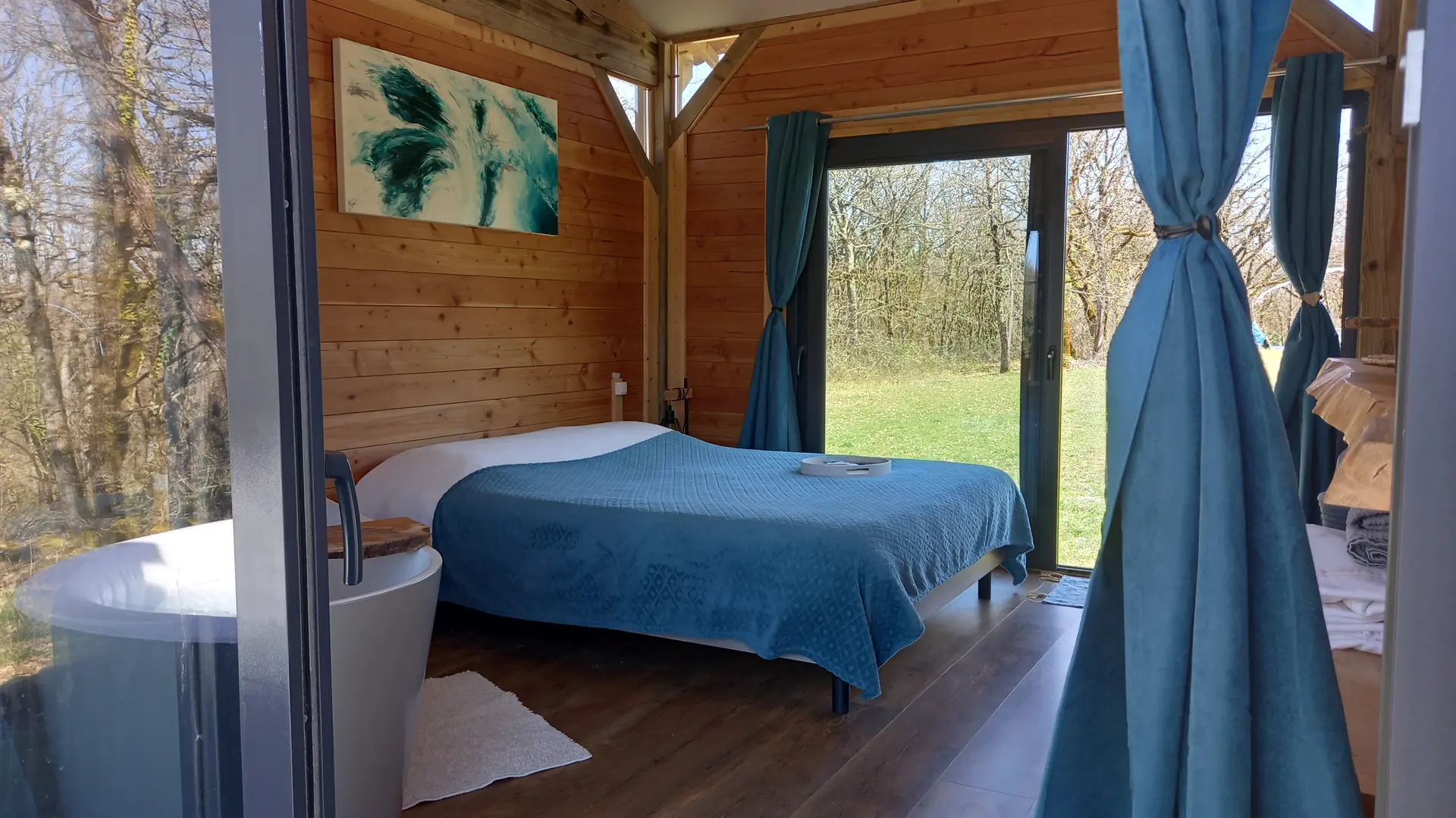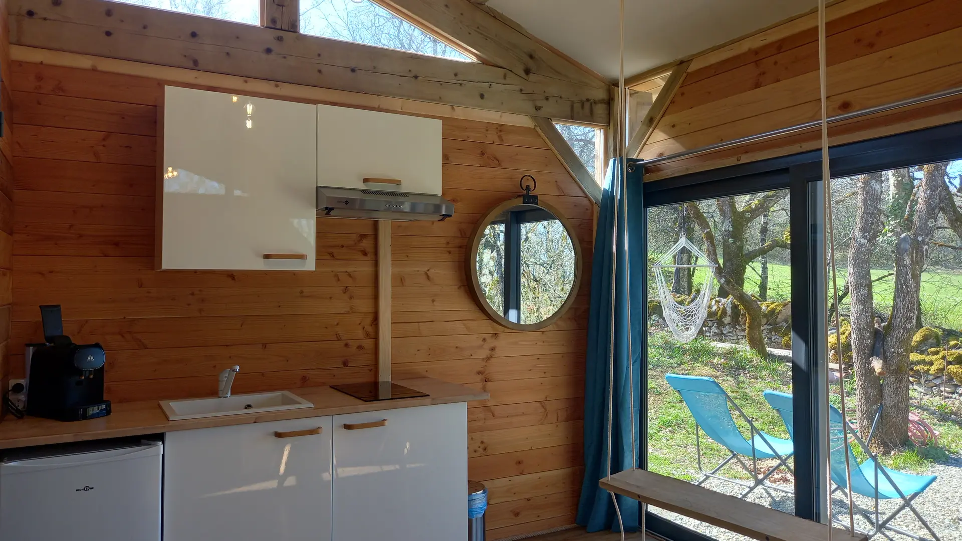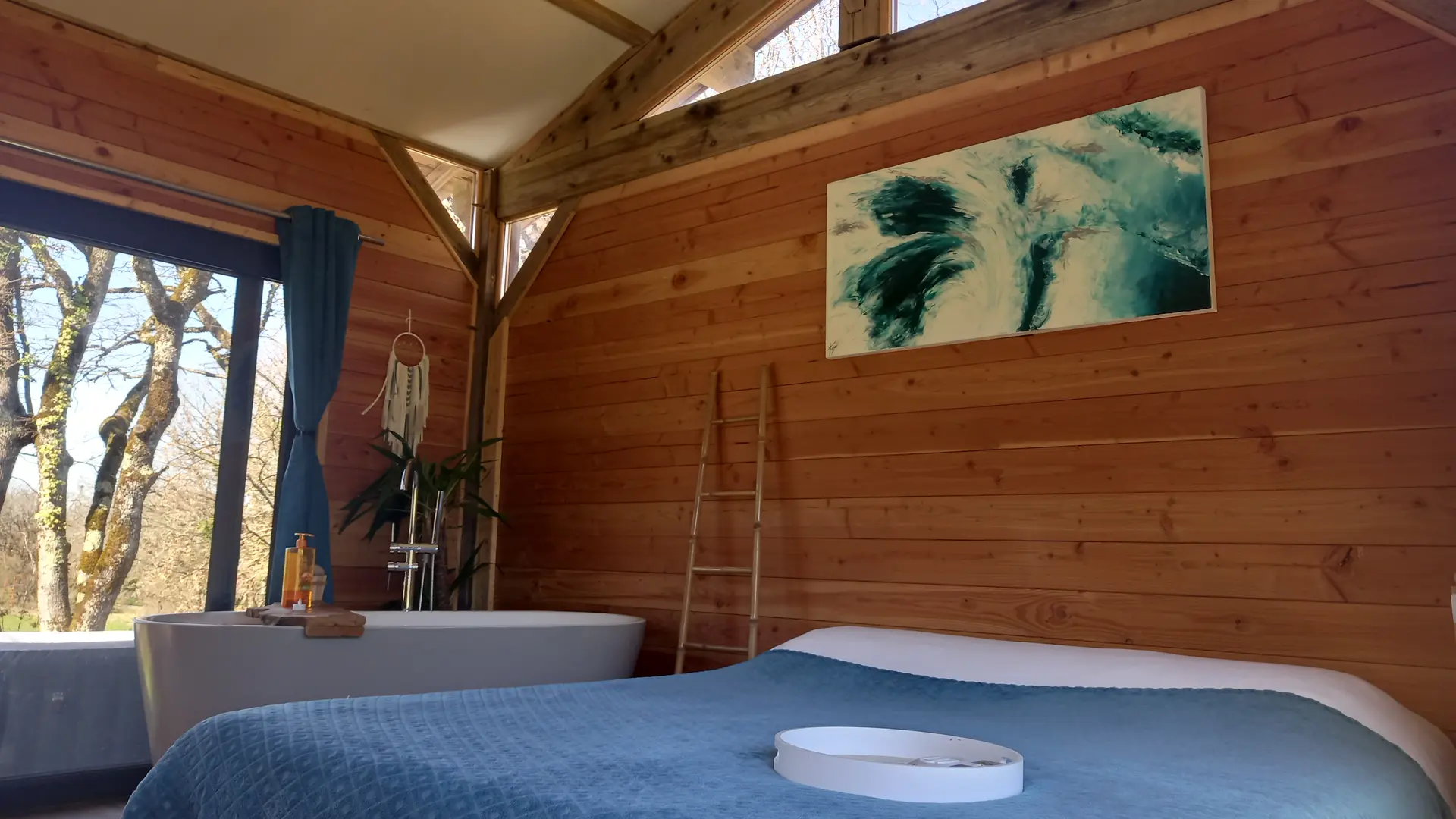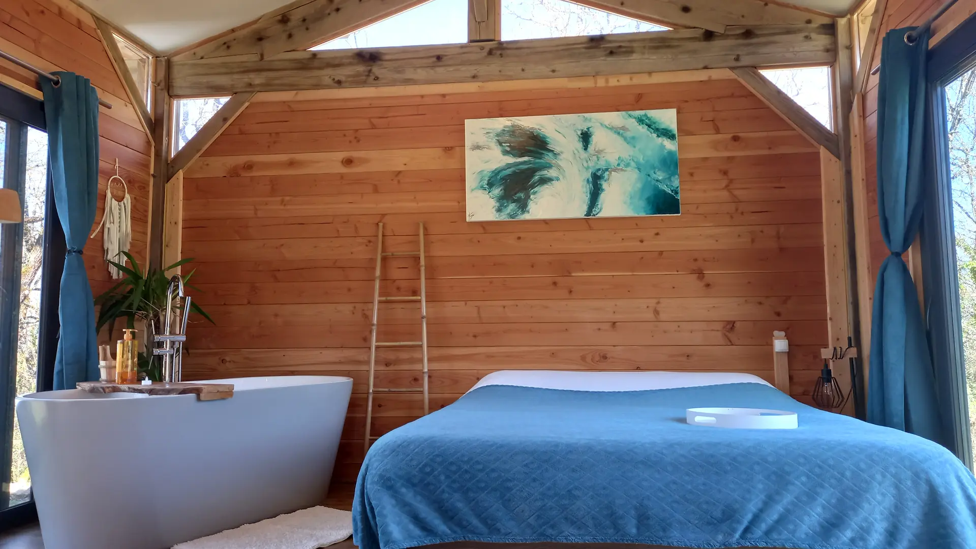 Le chalet Dalo est équipé d'un espace cuisine avec deux plaques de cuisson, réfrigérateur, cafetière, grille pain et barbecue, d'un espace nuit avec 1 lit 160x200, baignoire, TV écran plat et fauteuils. Pour des moments hors du commun, profitez de votre spa privatif sur la terrasse.