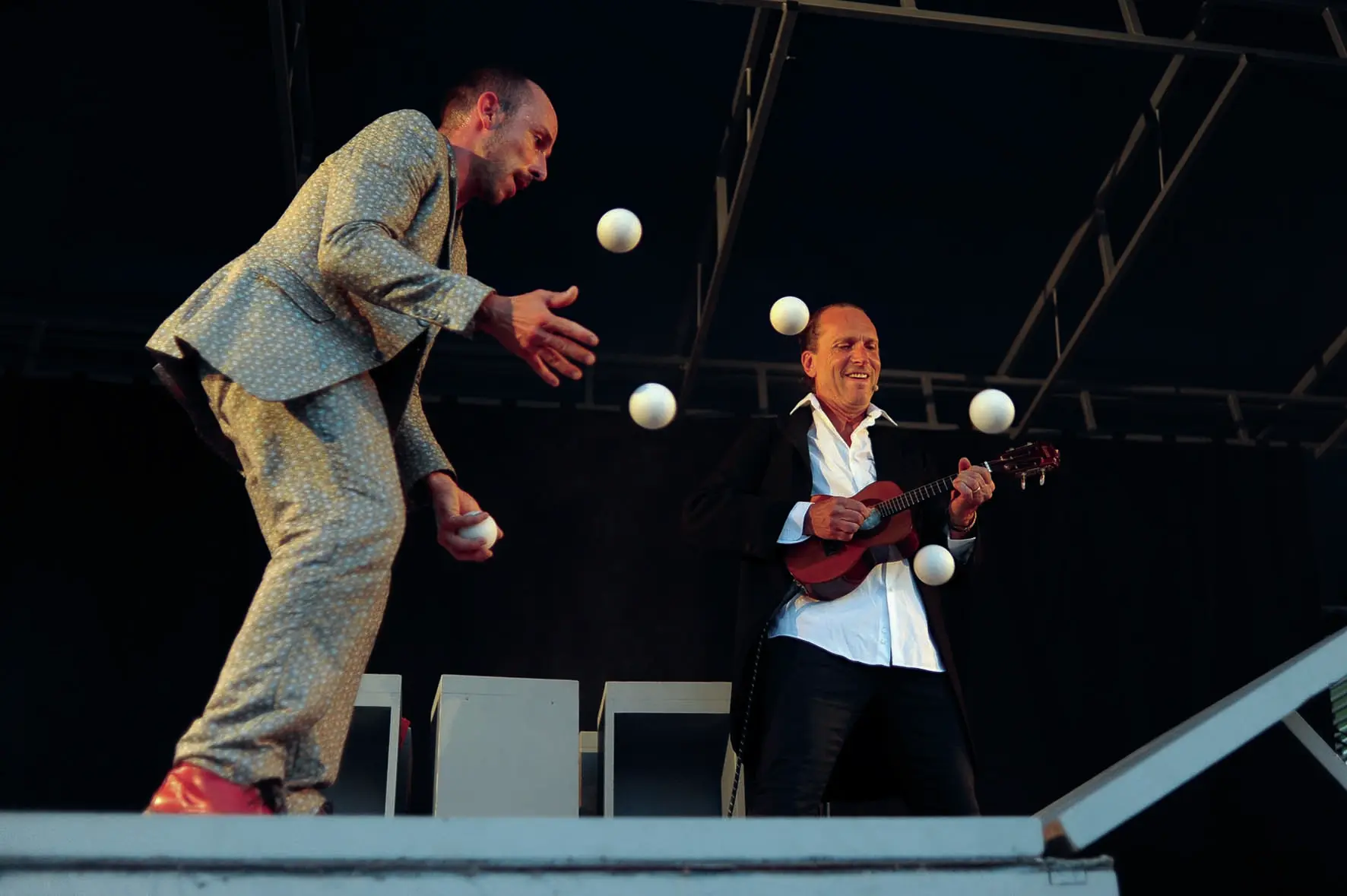 Un musicien, un jongleur... deux allumés du son, de la zique, du show, et de la jongle! Les menottes véloces et les savates agiles, ils partent en transe au son des balles tambours et de la mini guitare chantée.