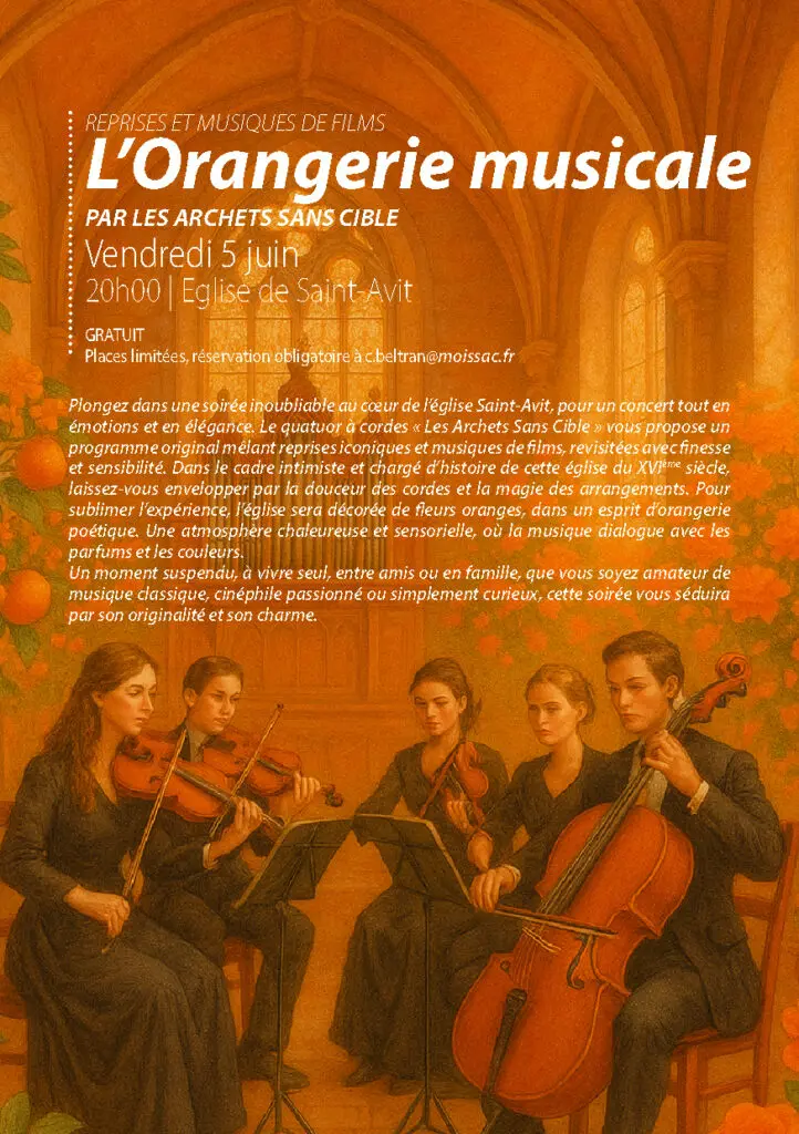 Dans le cadre intimiste et chargé d’histoire de cette église du XVIème siècle, laissez-vous envelopper par la douceur des cordes et la magie des arrangements. Pour sublimer l’expérience, l’église sera décorée de fleurs oranges, dans un esprit d’orangerie poétique. Une atmosphère chaleureuse et sensorielle, où la musique dialogue avec les parfums et les couleurs.