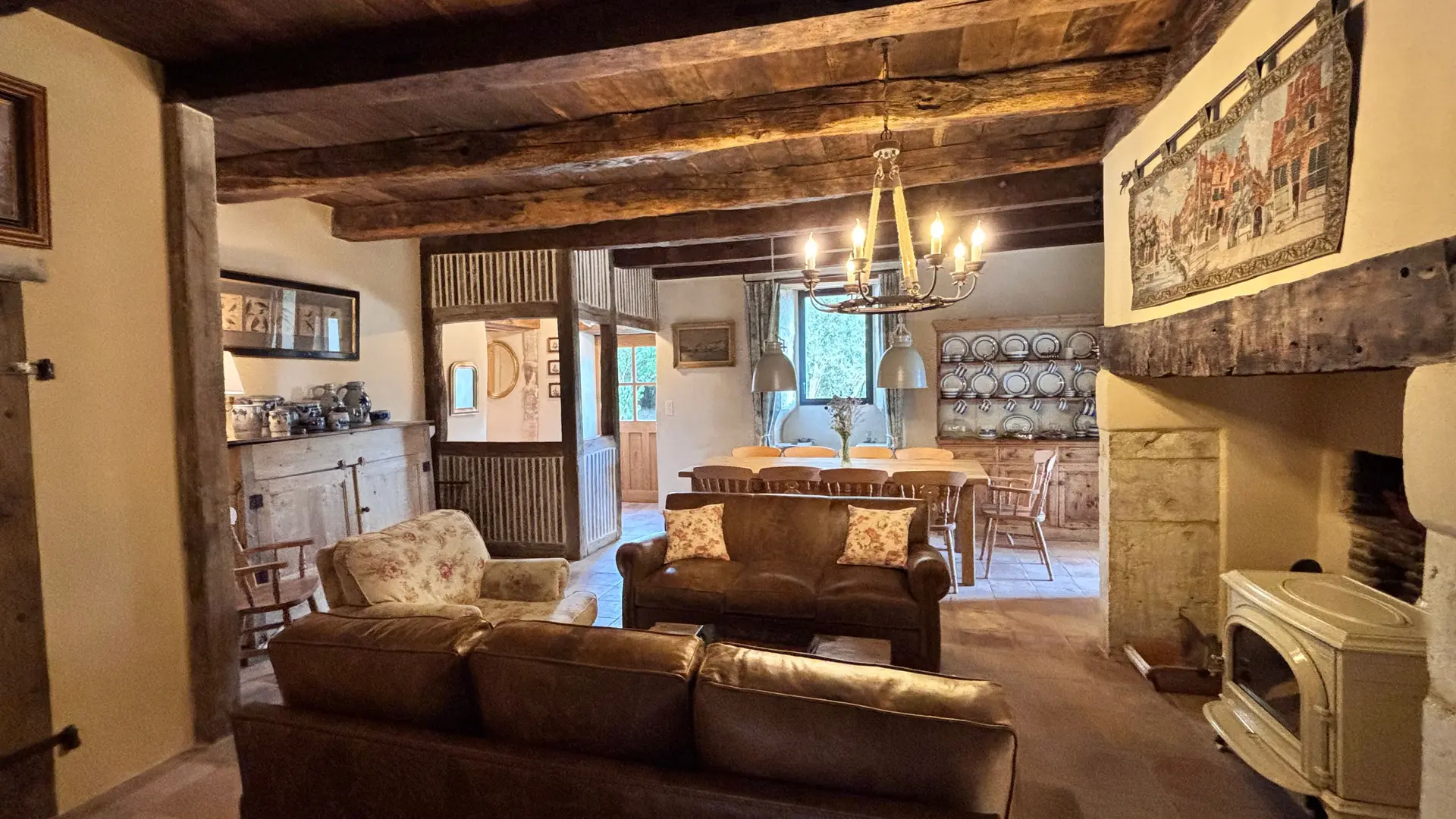 Dès la porte d'entrée, on ressent l'ambiance chaleureuse de la pièce à vivre avec la partie séjour et salon (table et chaises, poêle à bois, canapés fauteuils), on descend une marche pour aller dans la cuisine lumineuse par ses 3 baies vitrées (un immense plan de travail avec équipement haut de gamme (2 lave-vaisselle, piano de cuisine avec four, évier, réfrigérateur, congélateur), et à l'opposé la bibliothèque fournie avec TV espace bureau. A partir du sas d'entrée façon colombages anciens, la chambre parentale avec 1 lit 180, une salle d'eau, un wc indépendant. Sur ce dégagement une buanderie avec lave-linge sèche-linge, centrale vapeur. Au 1er étage, 3 sublimes chambres avec chacune une salle d'eau et wc privatifs. La chambre avec mezzanine pour enfant (bureau et jeux à disposition), 1 lit 180, une grande salle de bains (baignoire centrale et douche) wc. Cette chambre à sa terrasse privative avec salon de jardin et transats. La chambre verte avec 1 lit 180, salle d'eau et wc privatifs et la chambre bleue avec 2 lits 0,90 rapprochables, salle d'eau et wc privatifs. Chaque chambre raconte un univers tout comme chaque objet héritage de famille ou merveilleuse trouvaille. Logement entièrement climatisé, linge de lit de toilette compris et lits faits à l'arrivée. Wifi. A l'extérieur, terrasse couverte avec barbecue salon de jardin. Une autre terrasse façon kiosque pour apprécier le point de vue avec table chaises et salon de détente. Jeux extérieurs pétanque. Piscine à débordement en cours de travaux finie pour avril 2026. Location de vélos (route et VTT) à la demande en option.