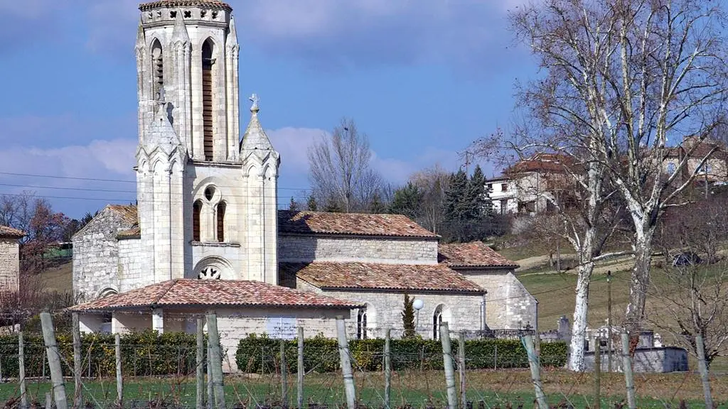 L’église a été reconstruite au XVe siècle, après le long conflit franco-anglais, comme en témoigne l’ange portant le blason des rois de France. Le plan adopté est très caractéristique des reconstructions de cette période : nefs unique, chapelles latérales…