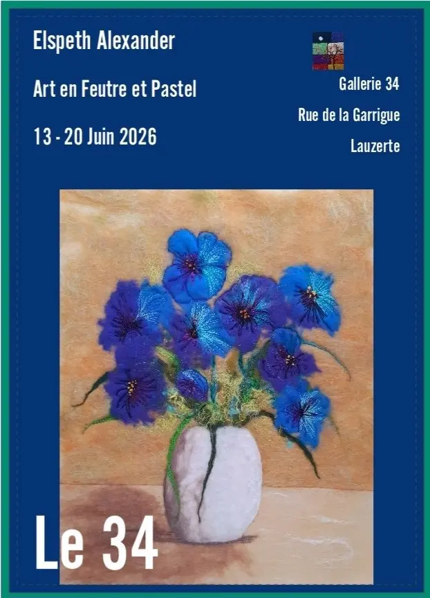 La Galerie 34 de Lauzerte accueille les œuvres d'art en feutre et pastel de l'artiste Elspeth Alexander Du 13 au 20 juin Galerie 34 - 34 rue de la Garrigue Horaires d’ouverture : de 10h à 18h Entrée libre