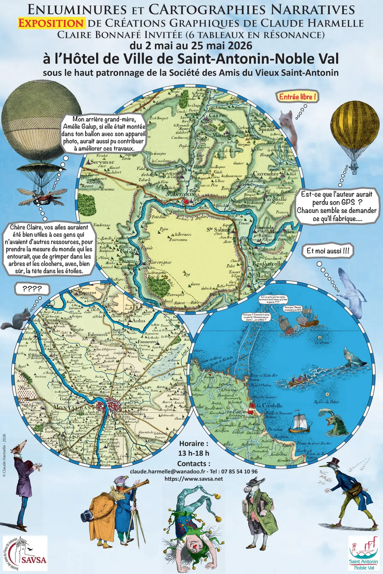 Une exposition d’enluminures contemporaines inspirées des cartes de Cassini : territoires parcourus, hommages, récits et facéties. Avec la participation amicale de la peintre Claire Bonnafé.