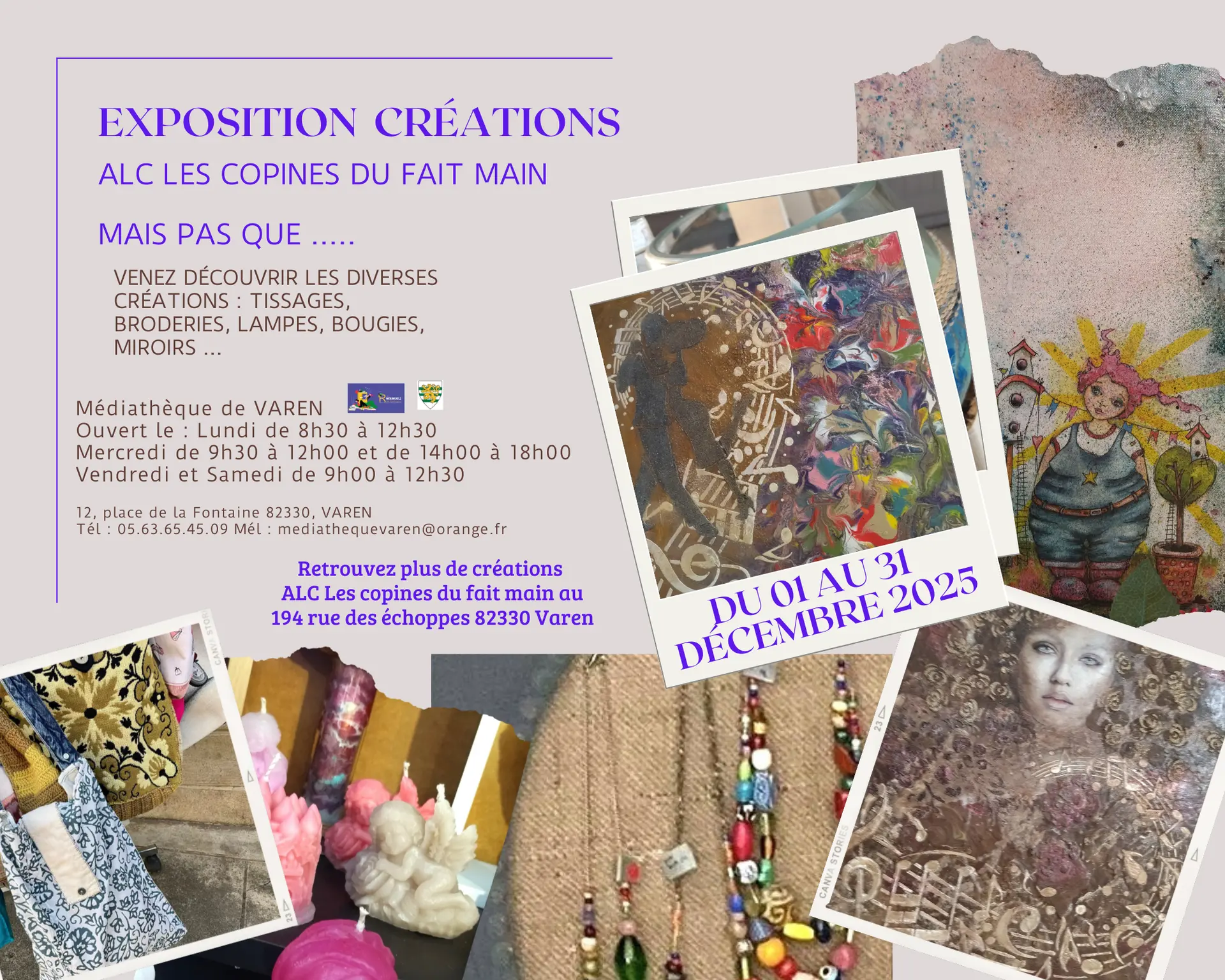 Exposition de créations de la boutique ALC Les copines du fait mais aussi d'autres artistes : tissages, broderies, lampes, bougies, miroirs ..