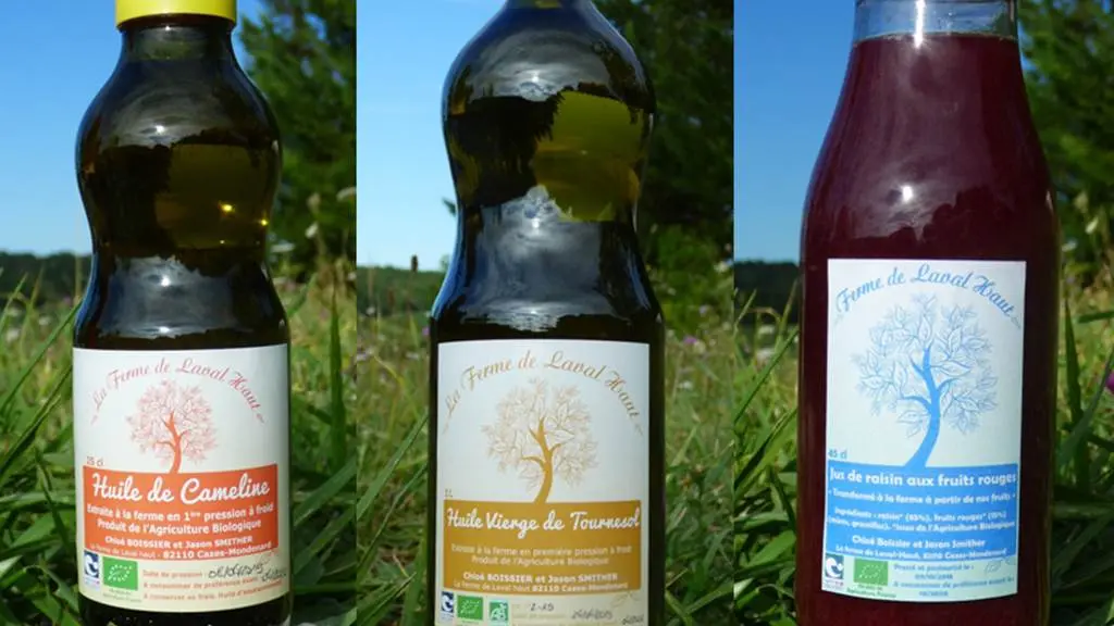 Toutes nos productions sont transformées à la ferme : les céréales sont moulues sur meules de pierre en farine fraiche (blé, petit épeautre et pois chiche), les oléagineux pressés à froid en huile (tournesol et cameline), et les fruits pressés en jus et confitures.