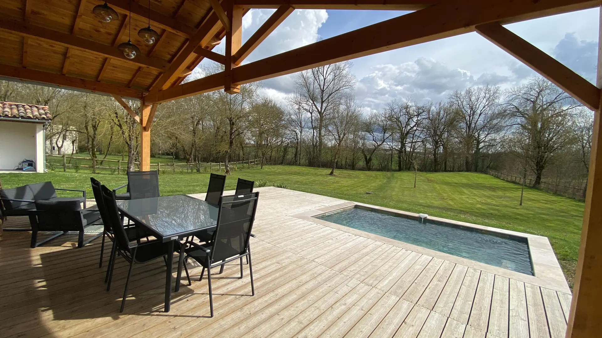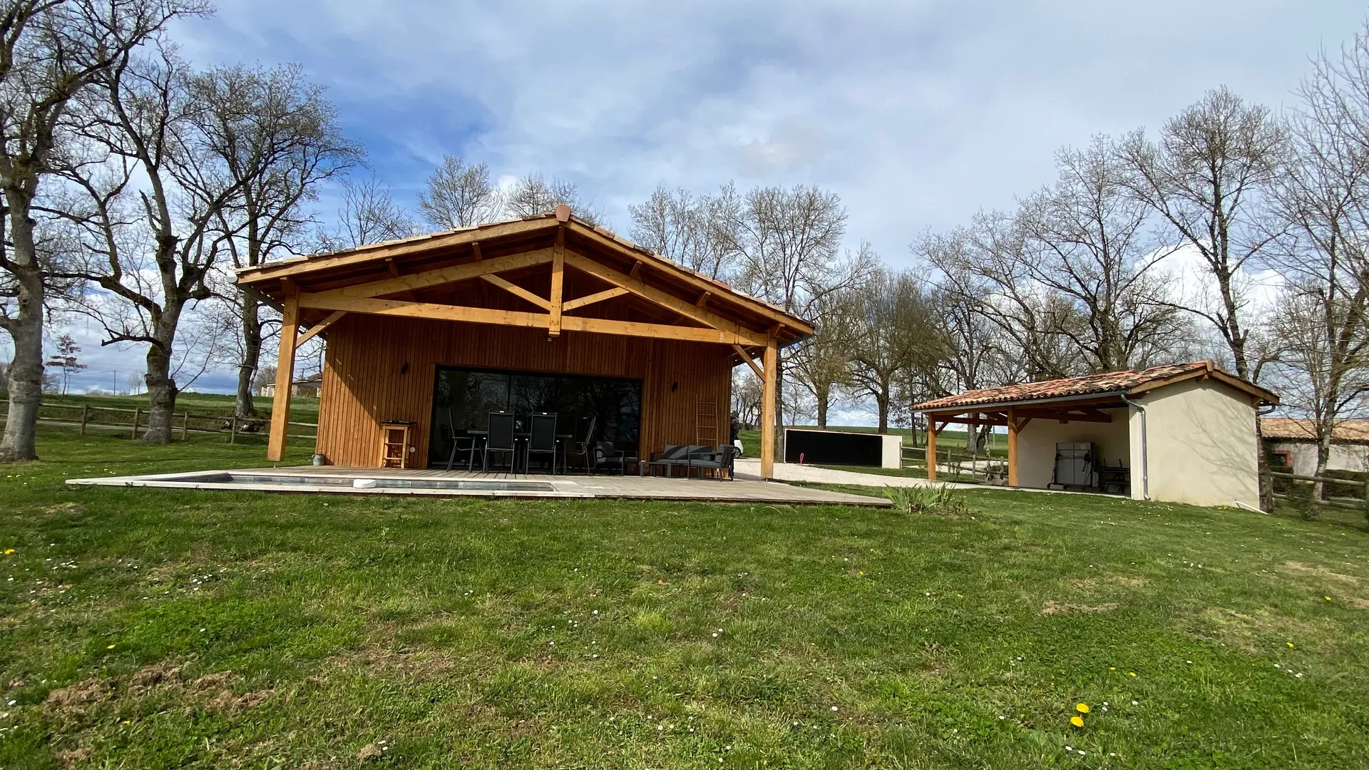A quelques mètres d'un petit ruisseau serpentant la campagne "le Candé", alors distancié par un joli pré arboré, découvrez cette maison de bois, aux lignes épurées, révélant par sa grande baie à galandage un intérieur tout en charme et élégance.