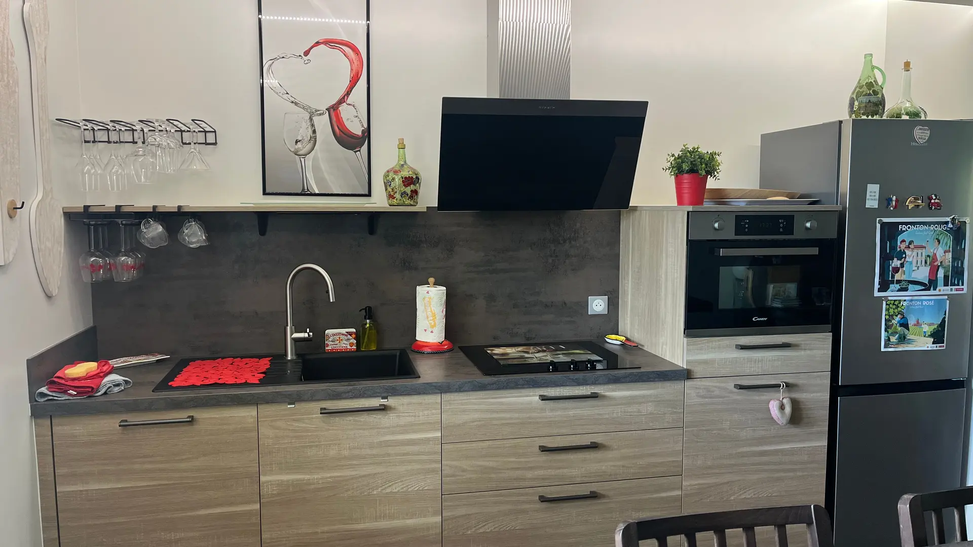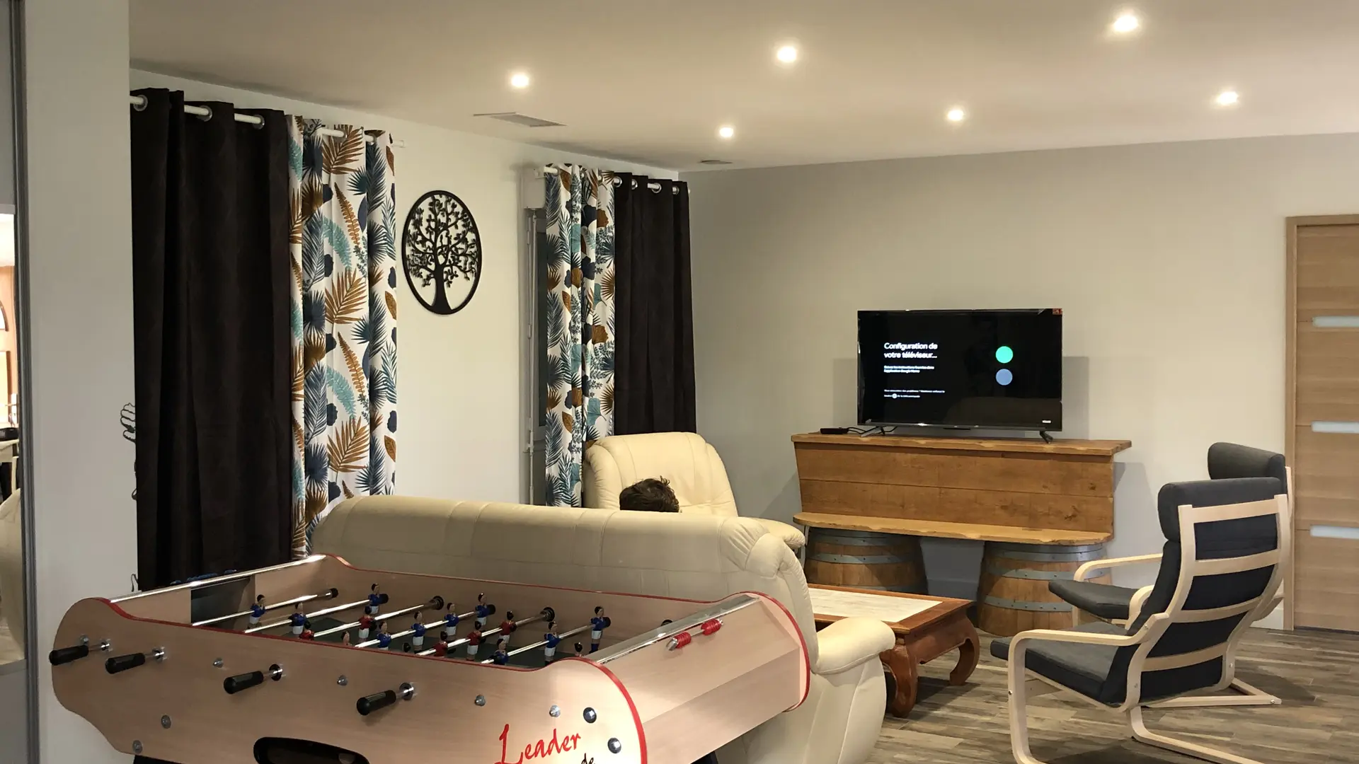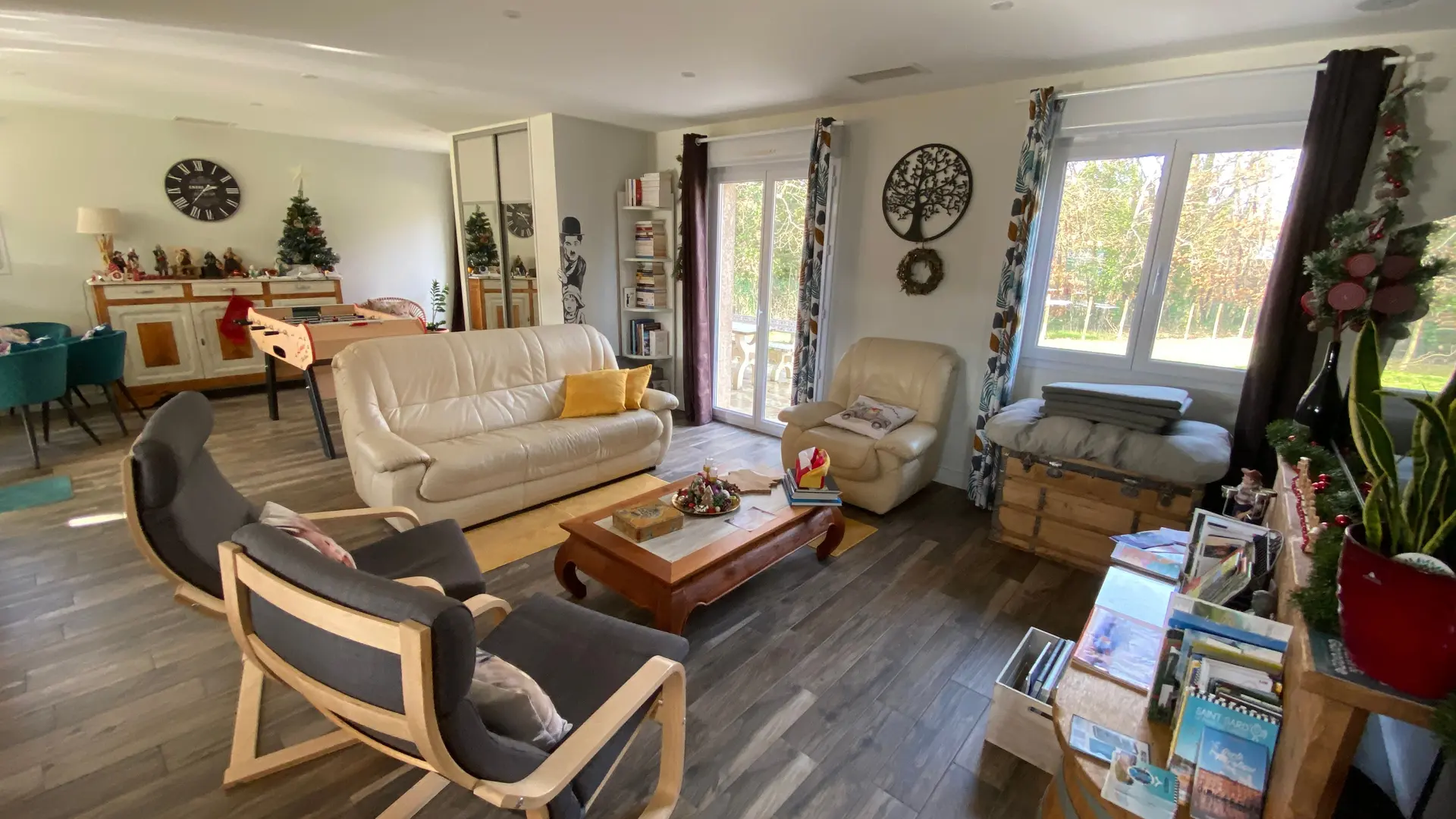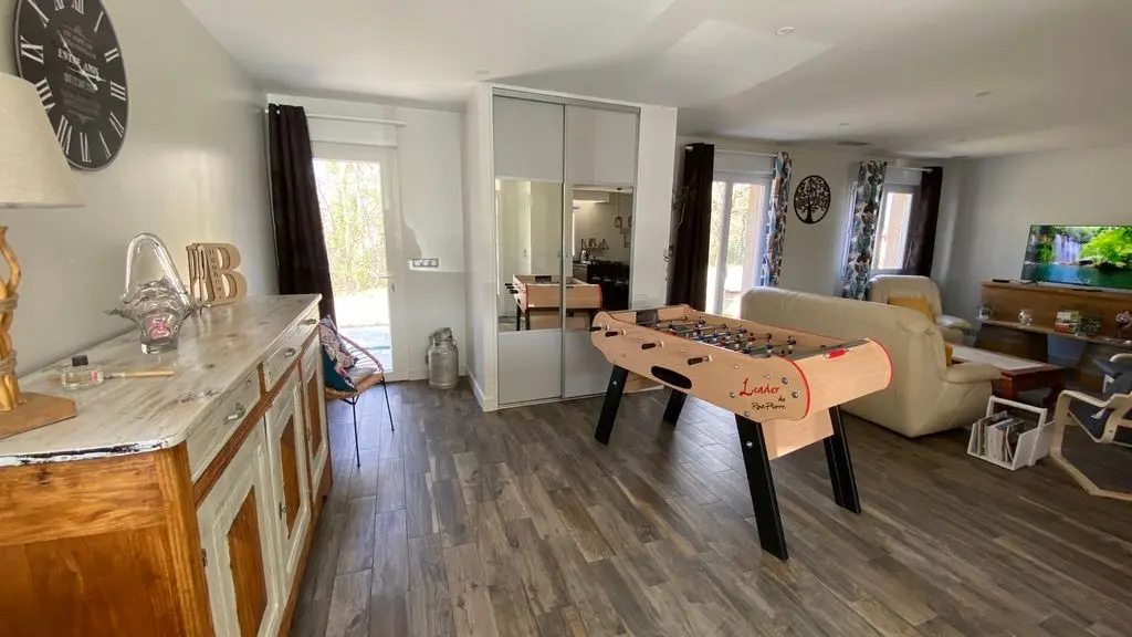 Entièrement en rez-de-chaussée, avec une cuisine ouverte sur une grande pièce à vivre et son coin salon TV, jeux de société, lecture et baby foot