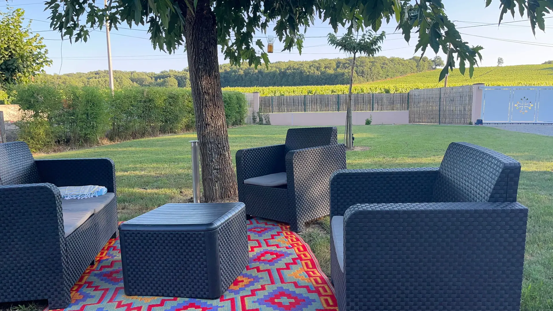 Salon de jardin sous les arbres, bains de soleil