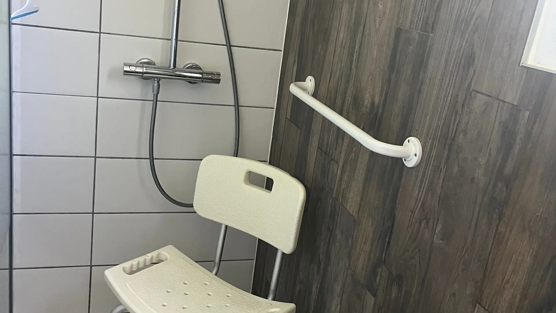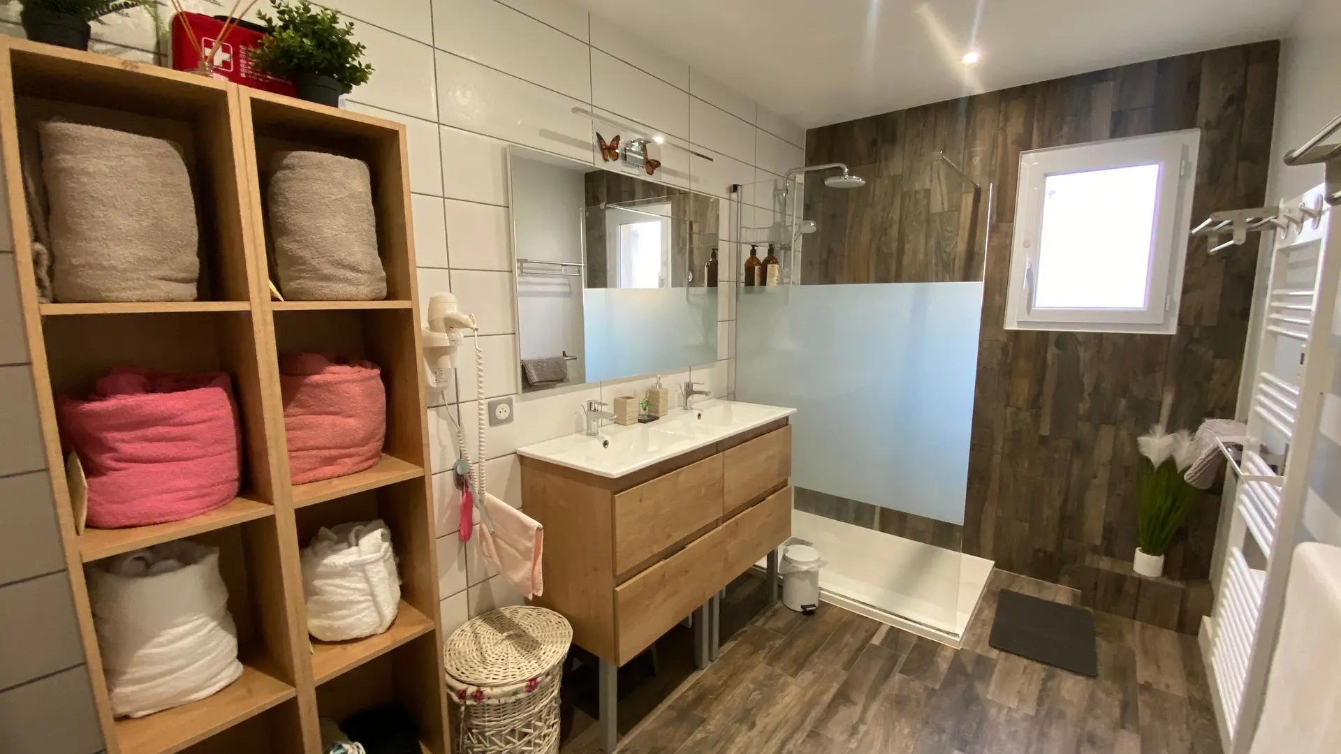 Une grande salle d’eau avec double vasque et douche spacieuse à l’italienne, WC séparé.