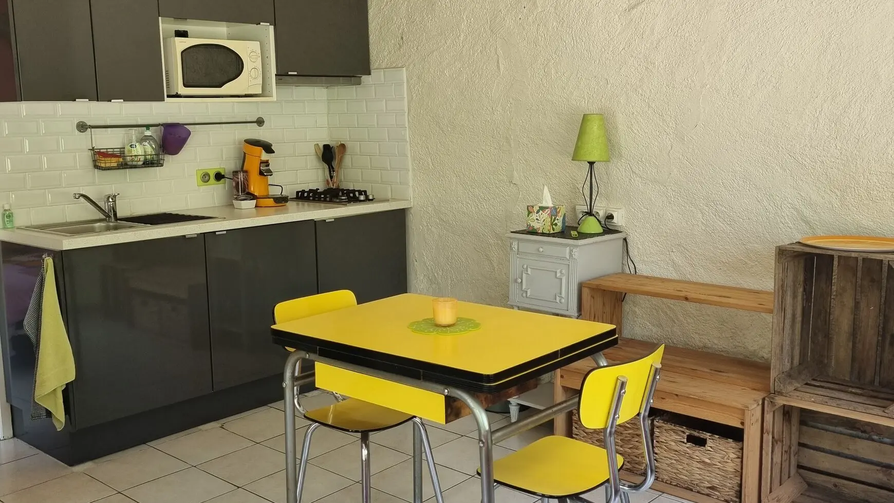 L'espace à vivre ouvert possède une kitchenette toute équipée (micro-ondes, cafetière, grille pain) un canapé, une TV, et des rangements.
