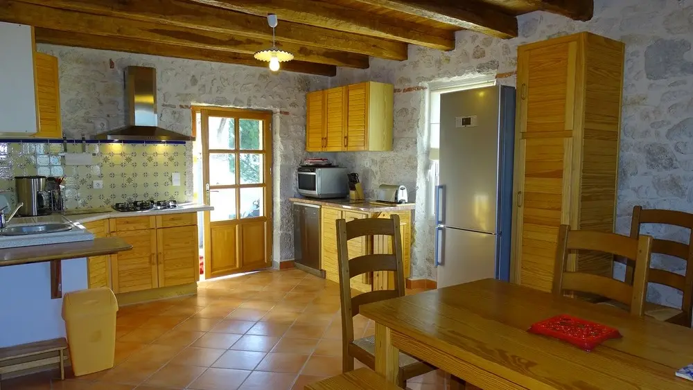 - un espace cuisine : mobilier intégré. Plan de travail. Évier 1 bac. Cuisinière 4 feux gaz. Hotte aspirante. Micro- ondes multi-fonctions. Combiné congélation. Lave-vaisselle. Cafetière électrique. Bouilloire. Grille pain. Espace séjour : table avec chaises et un banc. Bahut bas. TV écran plat + lecteur DVD.