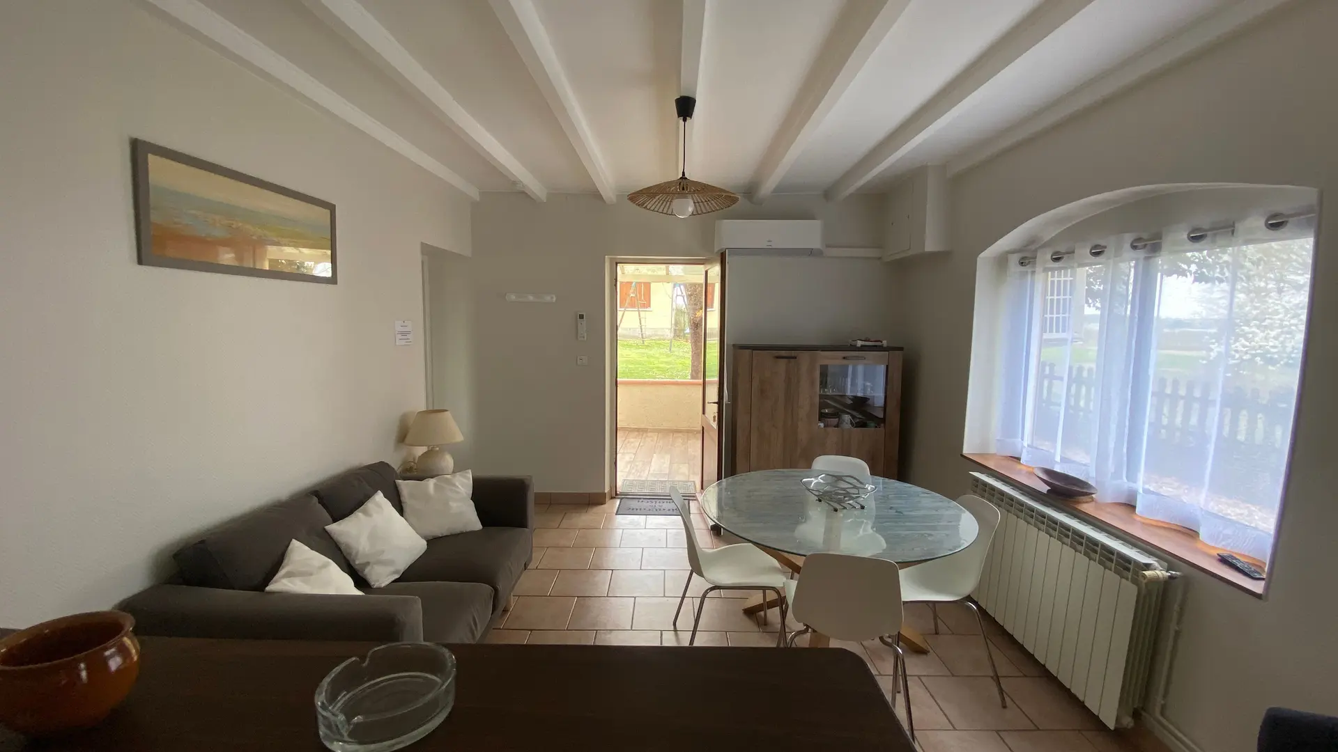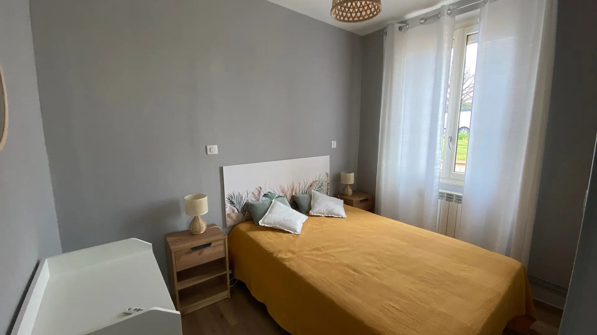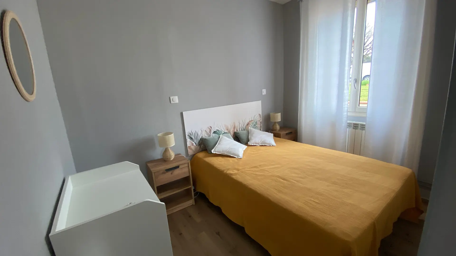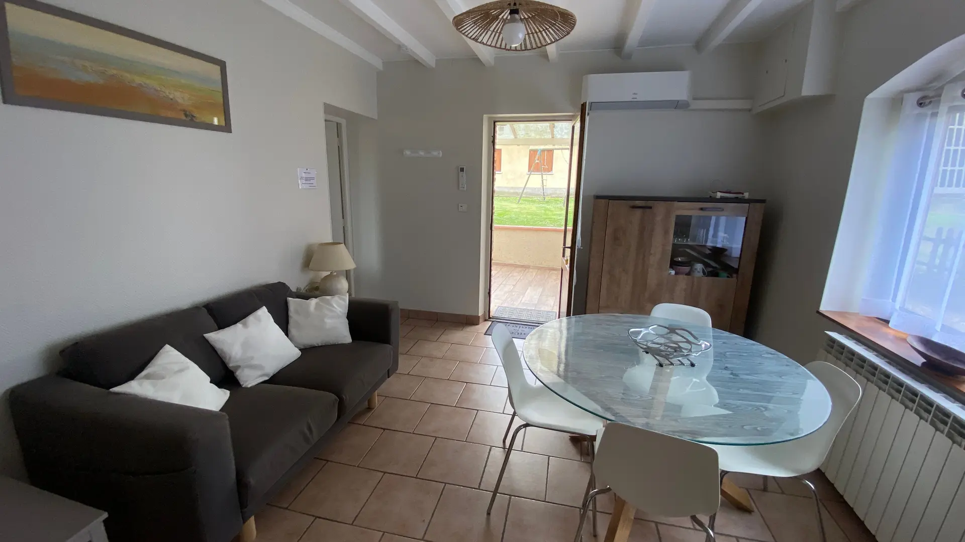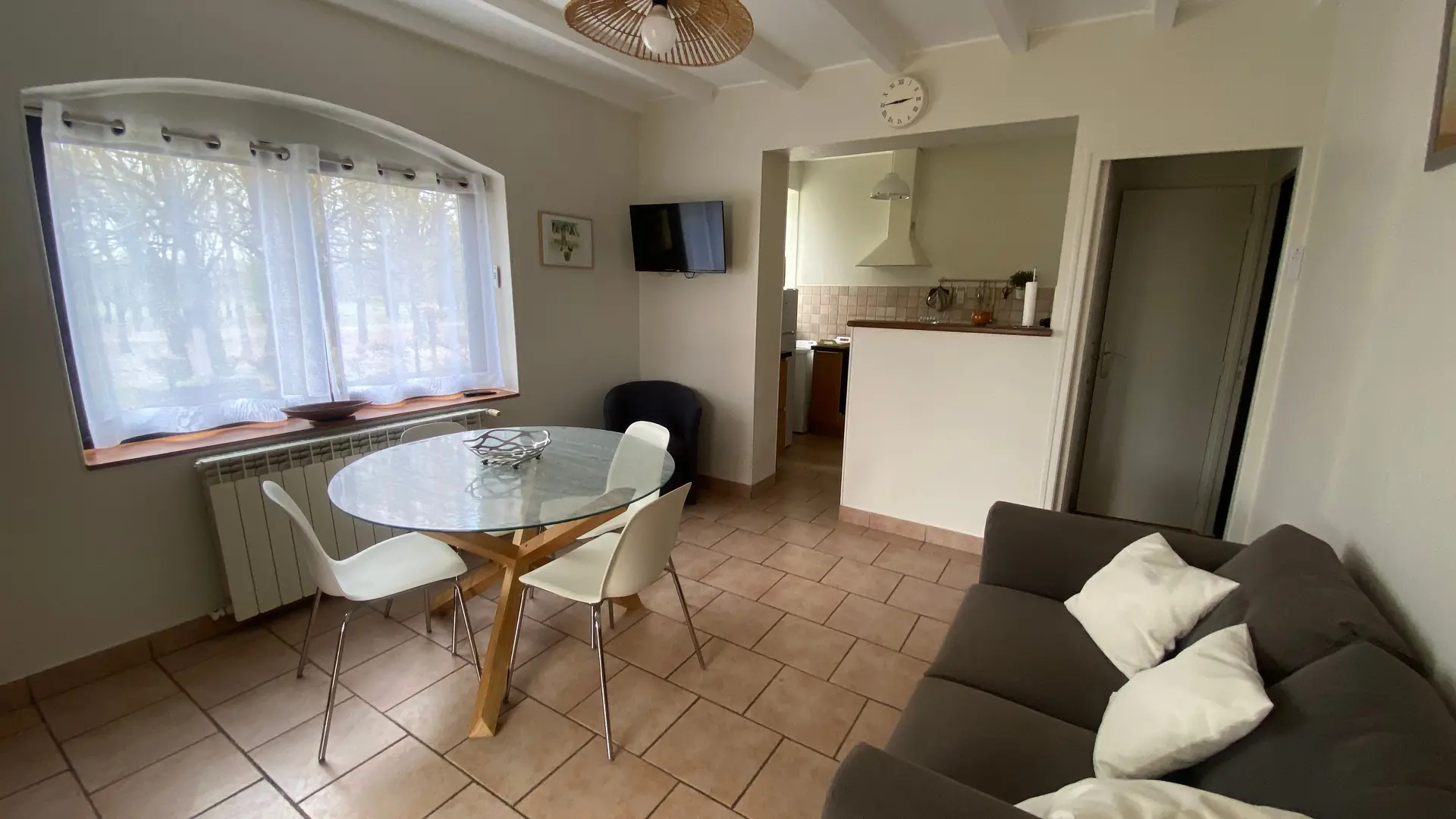 1 pièce à vivre (canapé), cuisine avec éléments intégrés ( four,micro-onde réfrigérateur avec congélateur, machine à laver, lave vaisselle ...), 1 ch (1 lit 140, un canapé clic clac) communicant avec 1 ch (1 lit 140), 1 salle d'eau, WC indépendant. Terrasse avec salon de jardin et barbecue, - Lit parapluie bébé à disposition.. Gîte non fumeur. Location de draps et linge de toilette en option et sur demande. Le prix comprend : la taxe de séjour, le chauffage, l'accès internet wifi. En option : ménage. Animaux acceptés et gratuit. Accès libre à la piscine. Jardin non clos