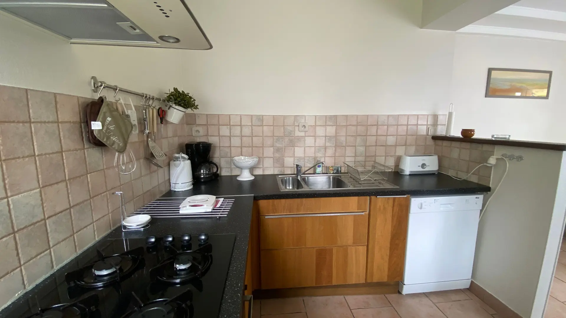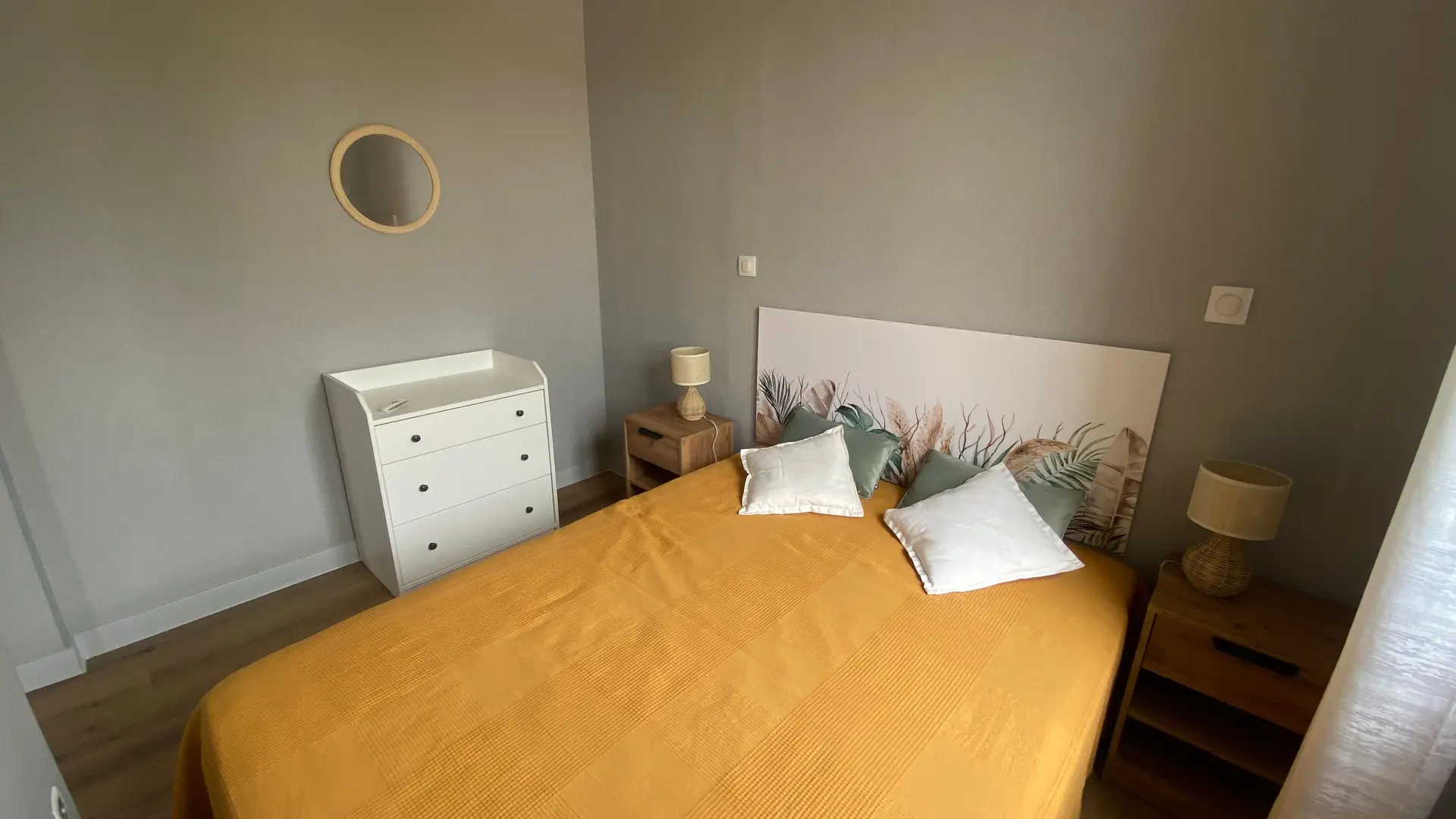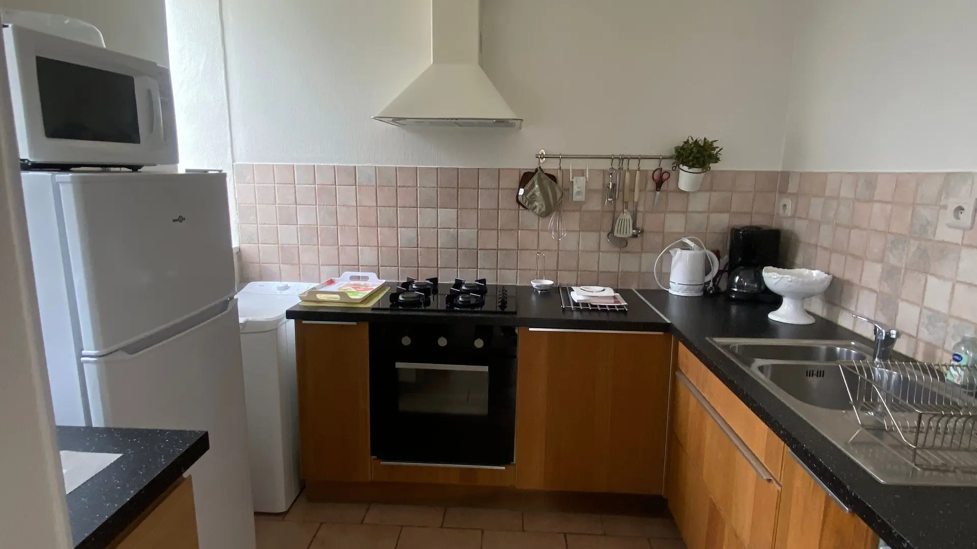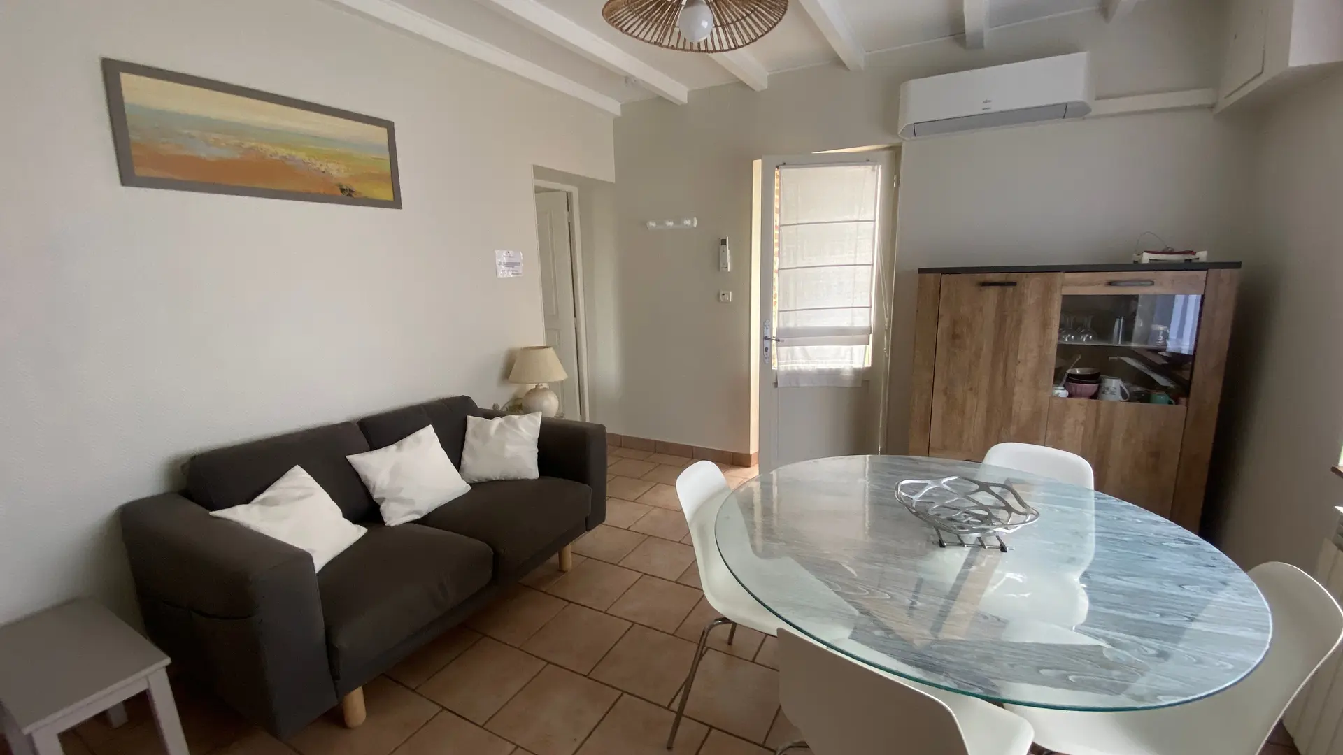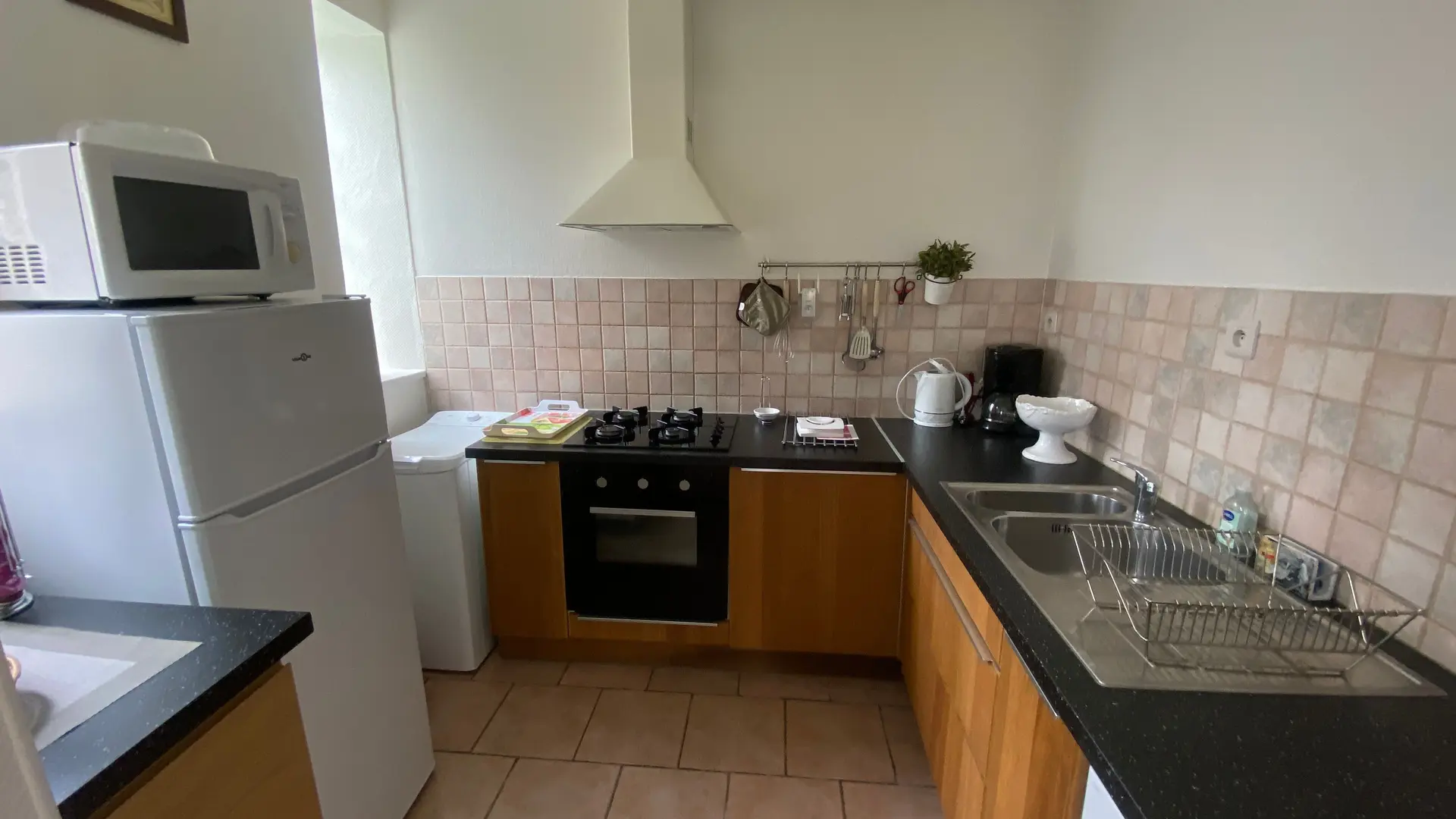 1 pièce à vivre (canapé), cuisine avec éléments intégrés ( four,micro-onde réfrigérateur avec congélateur, machine à laver, lave vaisselle ...), 1 ch (1 lit 140, un canapé clic clac) communicant avec 1 ch (1 lit 140), 1 salle d'eau, WC indépendant. Terrasse avec salon de jardin et barbecue, - Lit parapluie bébé à disposition.. Gîte non fumeur. Location de draps et linge de toilette en option et sur demande. Le prix comprend : la taxe de séjour, le chauffage, l'accès internet wifi. En option : ménage. Animaux acceptés et gratuit. Accès libre à la piscine. Jardin non clos
