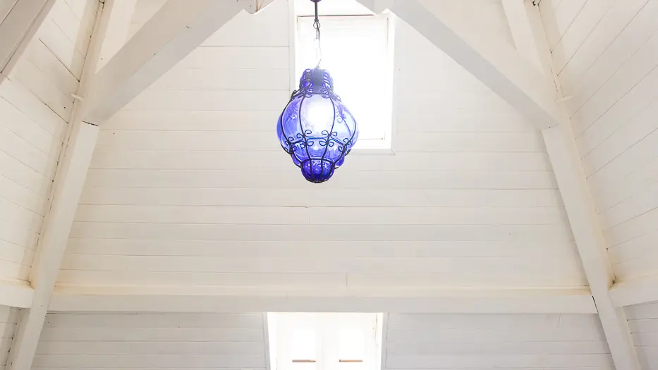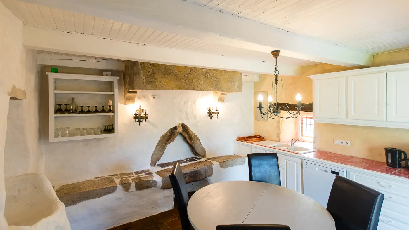 Atmosphère douce et romantique avec son carrelage bleu d’époque, ses murs en pierre, en bois et enduits chaux.