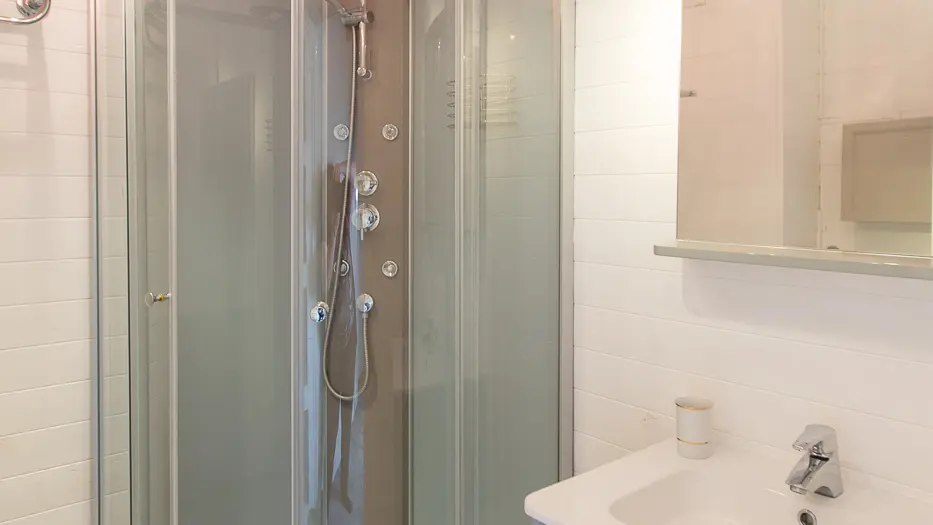 Salle d’eau avec WC, douche et vasque.