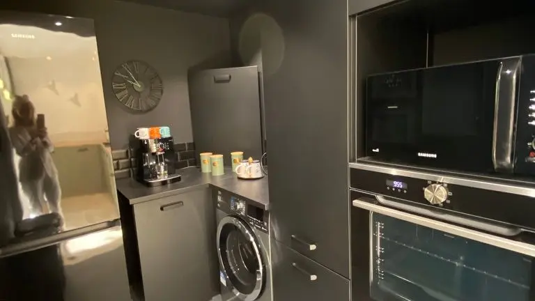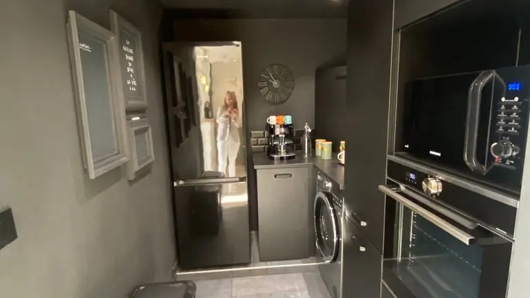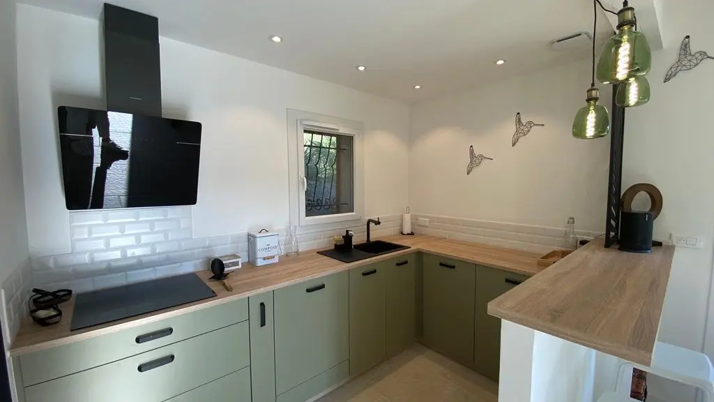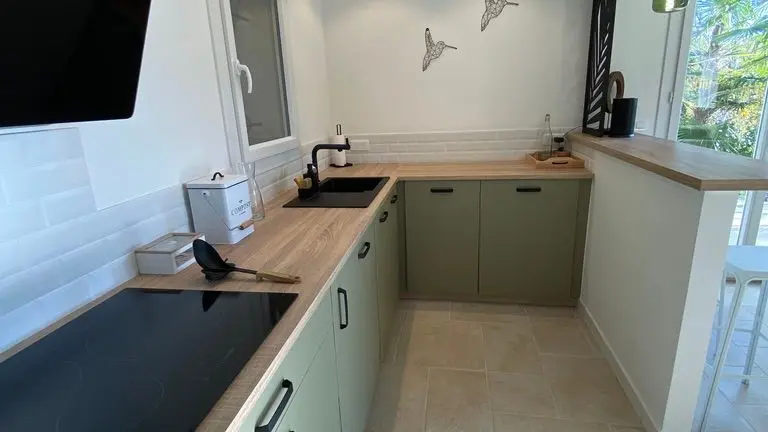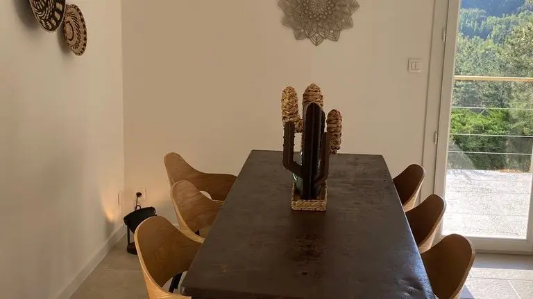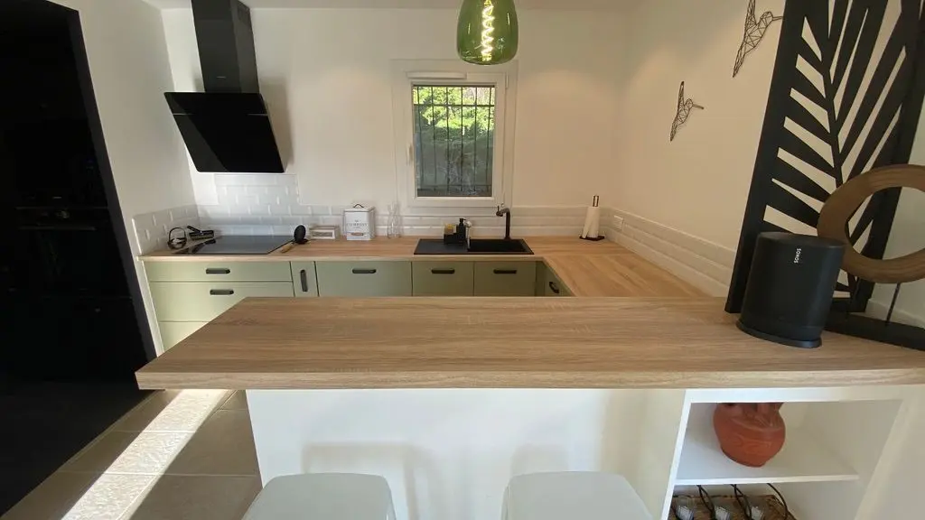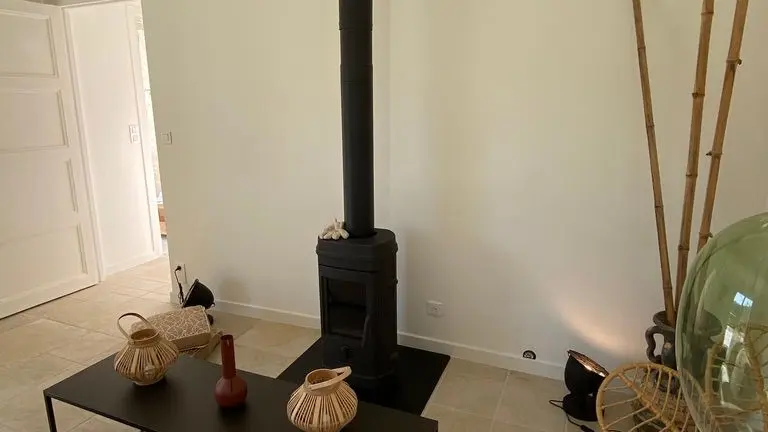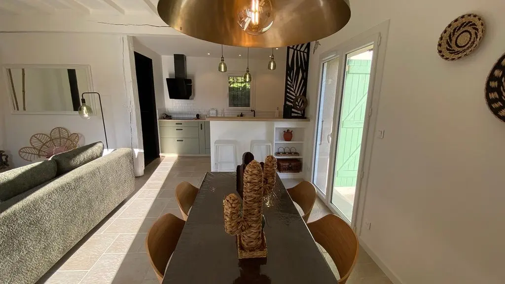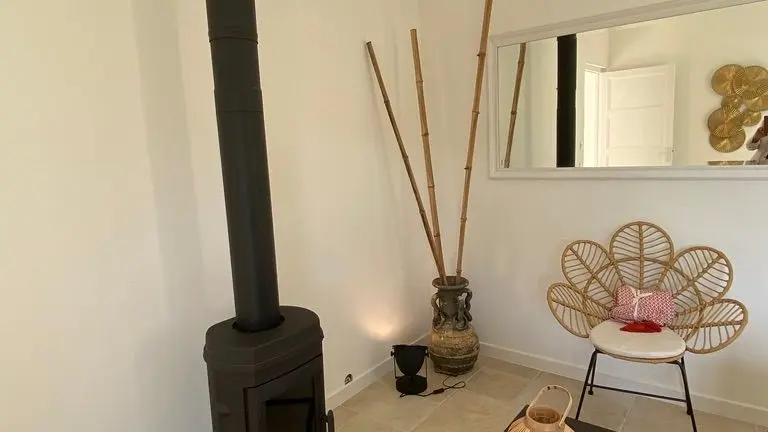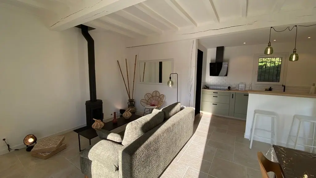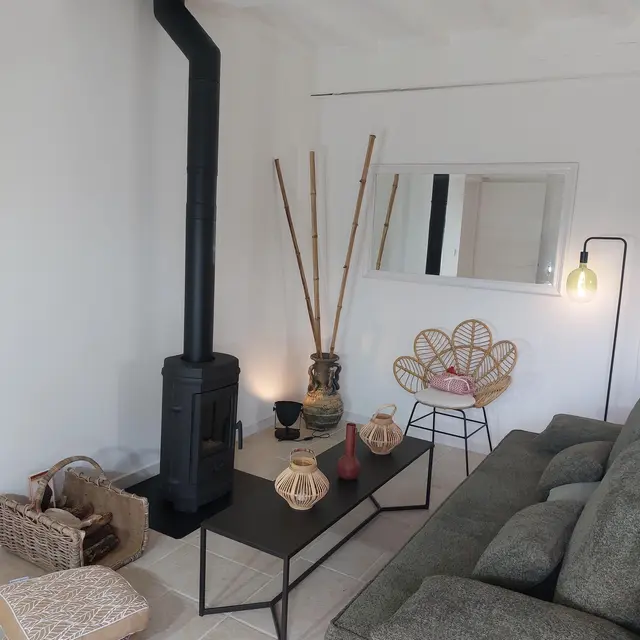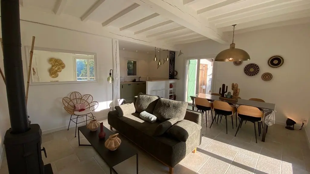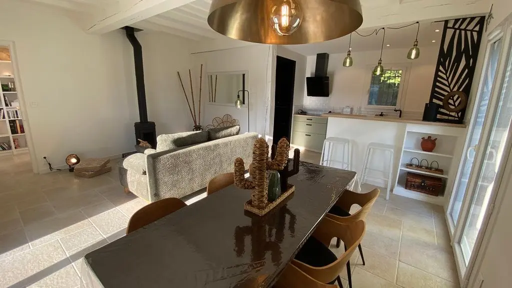 - une pièce à vivre avec salon (canapé, table basse, poêle à bois (fourniture du bois compris dans le prix) fauteuil, table de salle à manger avec 6 chaises), cuisine ouverte toute équipée avec bar et tabourets (lave-vaisselle intégré, plaque à induction, hotte, robots) et sa zone technique (four, micro-ondes, combiné lave-linge, sèche-linge, réfrigérateur, congélateur),