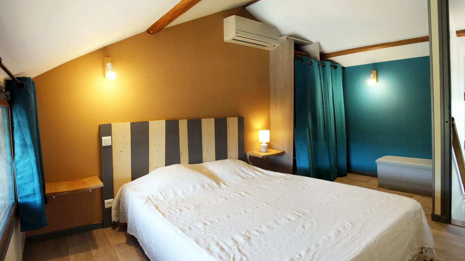 Au rez-de-chaussée : séjour (canapé), cuisine (micro-onde, lave vaisselle), salle d'eau (lavabo, douche, lave linge) et WC, 1 chambre (1 lit 140), 1 chambre (2 lits 90). Au 1er : 1 chambre mansardée (1 lit 140, climatisation réversible). Terrasse avec pergola. Vélos.