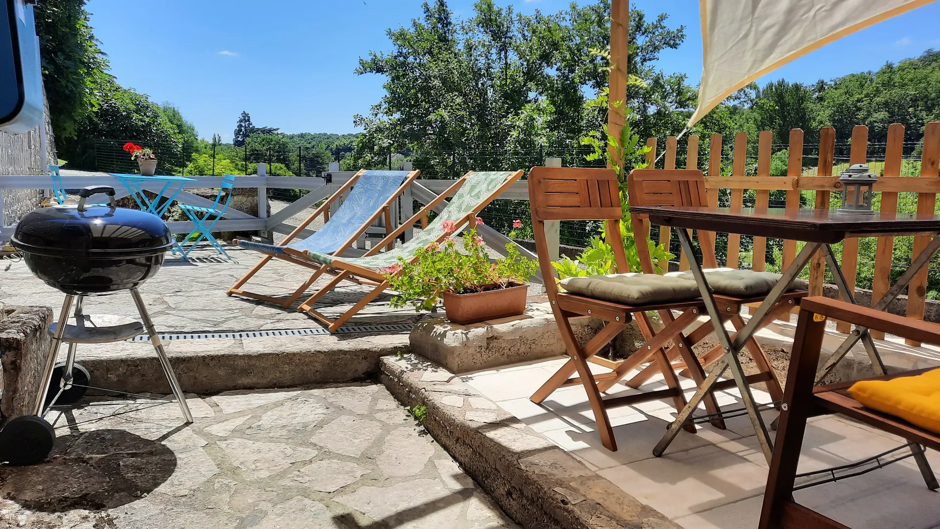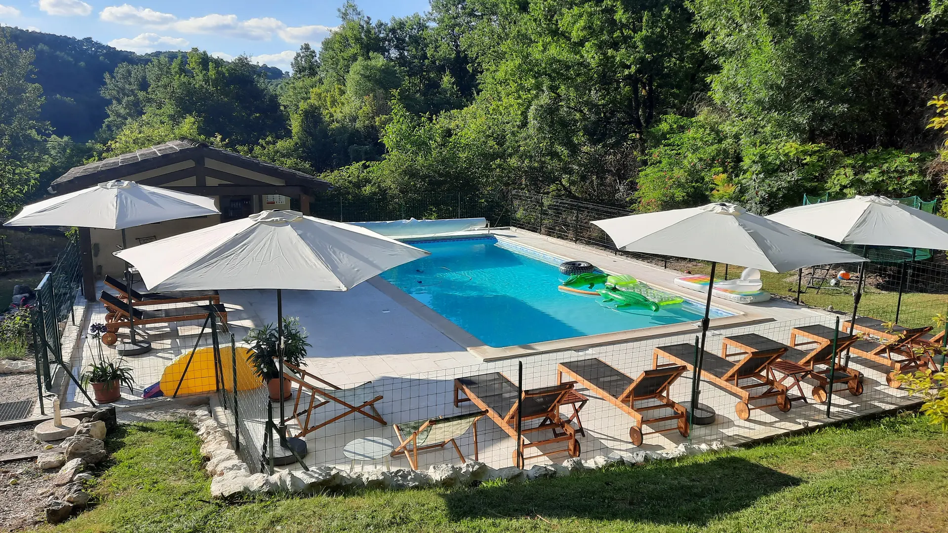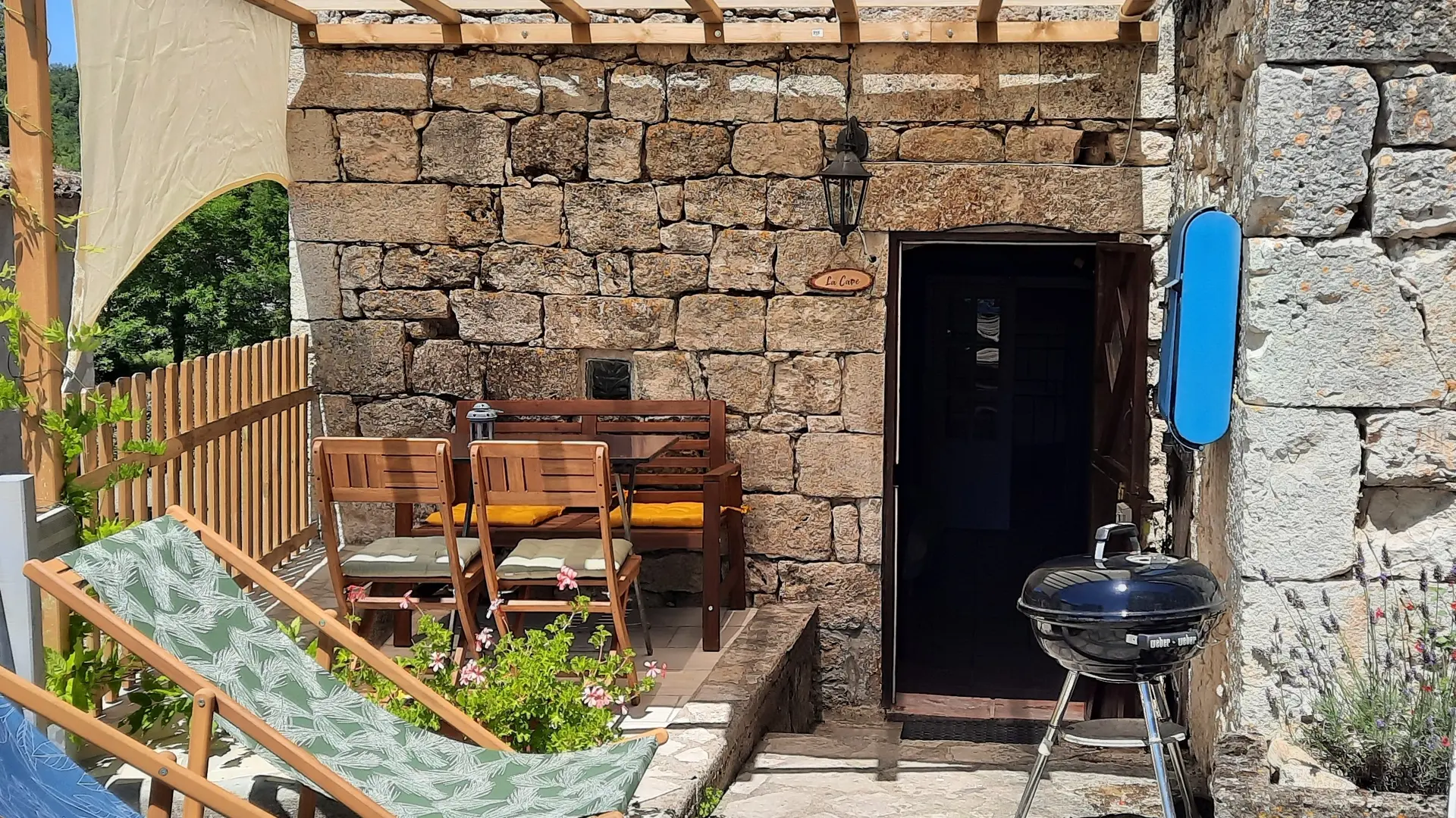 A l'extérieur, vous disposez d'une jolie terrasse. Sur place, vous trouverez de nombreux coins aménagés pour que vous puissiez vous relaxer ou profiter de la nature. Un barbecue est à votre disposition. L'usage de la piscine (5x10 m) est partagé avec les locataires des autres gîtes et les propriétaires.