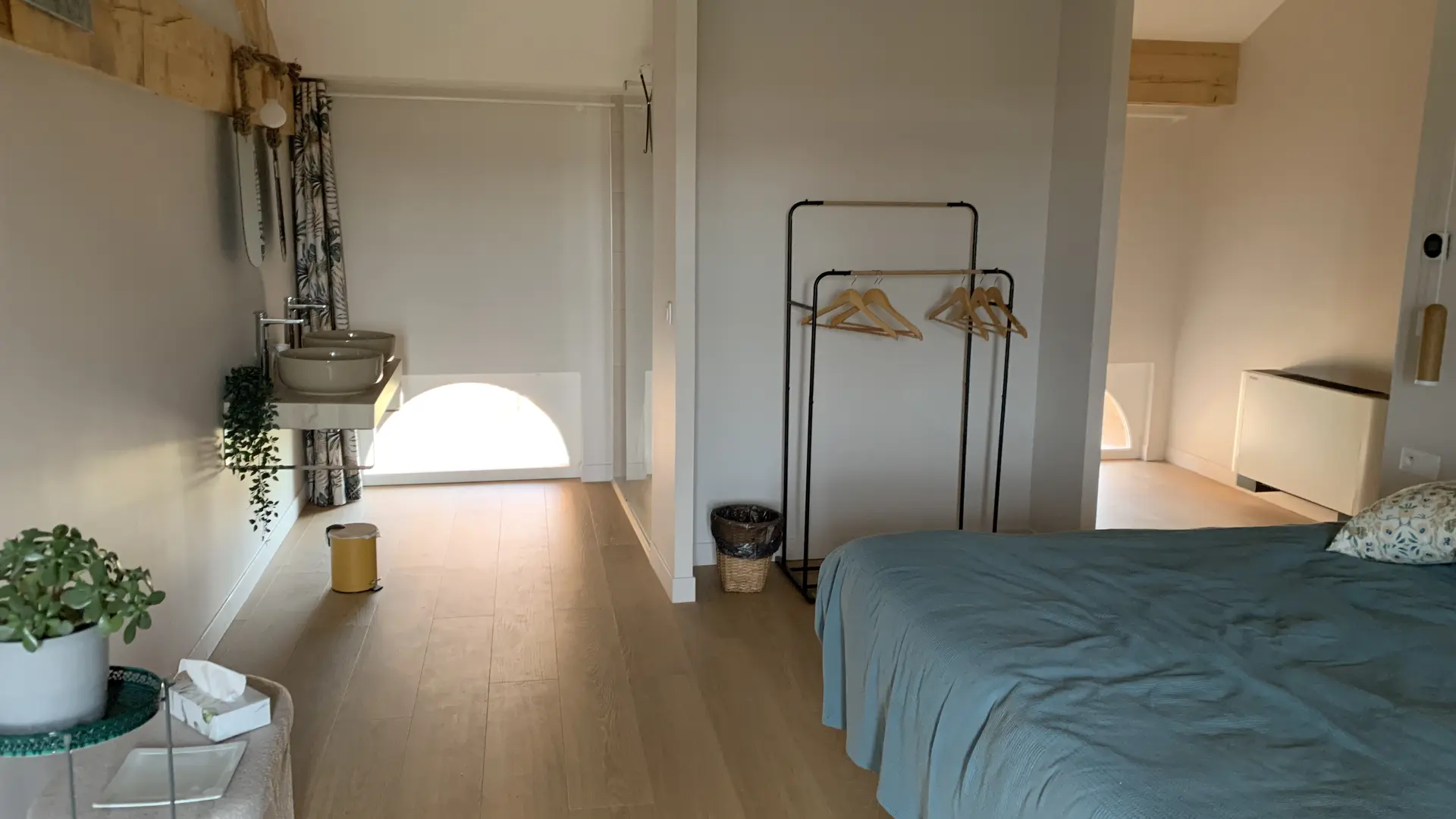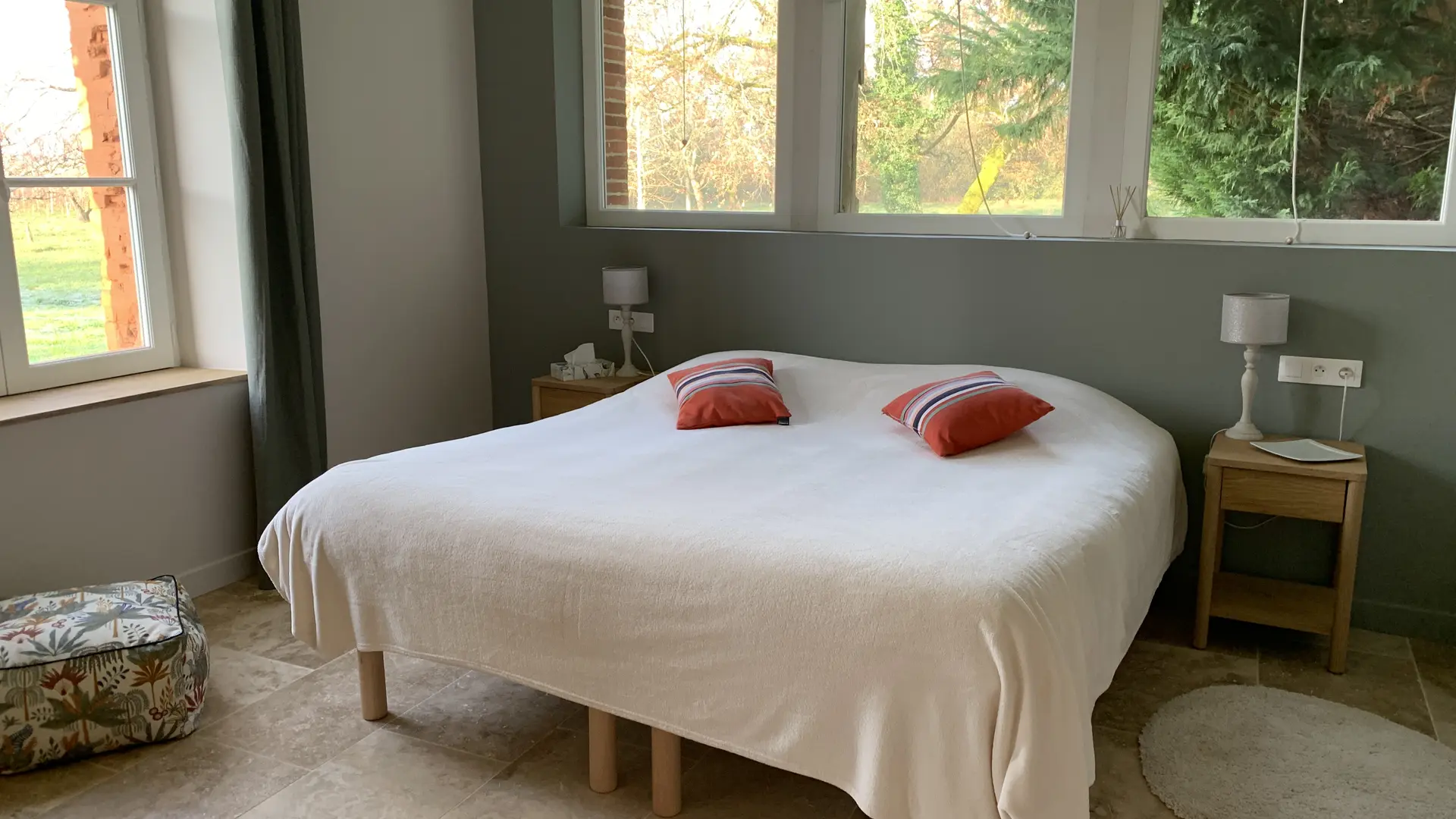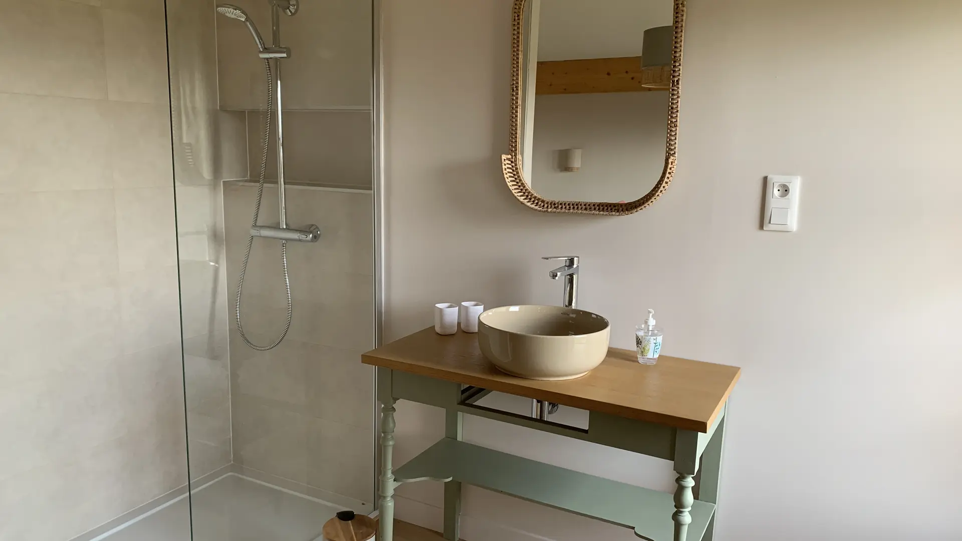 1 chambre est aménagée en rdc pour recevoir 1 / 2 personnes en fauteuil roulant. La salle d'eau et le wc sont privés dans la chambre. La douche italienne est adaptée.