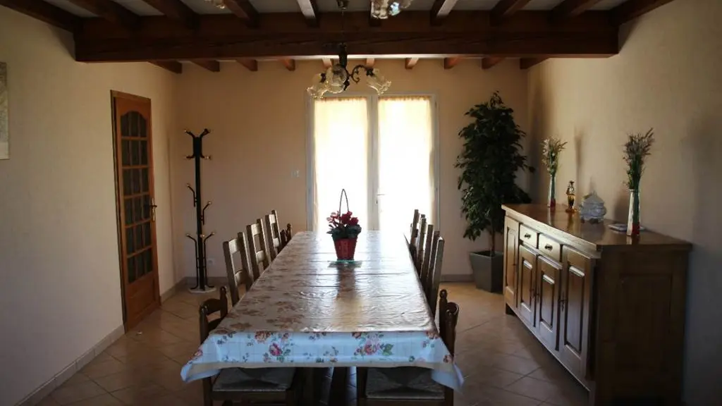 Ce gîte comprend une cuisine équipée, une salle à manger donnant sur la terrasse avec coin salon (canapé clic-clac, TV), 3 ch (1 lit 140 chacune), une salle d’eau, WC indépendant. Lit bébé et chaise haute. Garage. Espace vert en partie clos avec salon de jardin et barbecue. Charges en sus en basse saison.