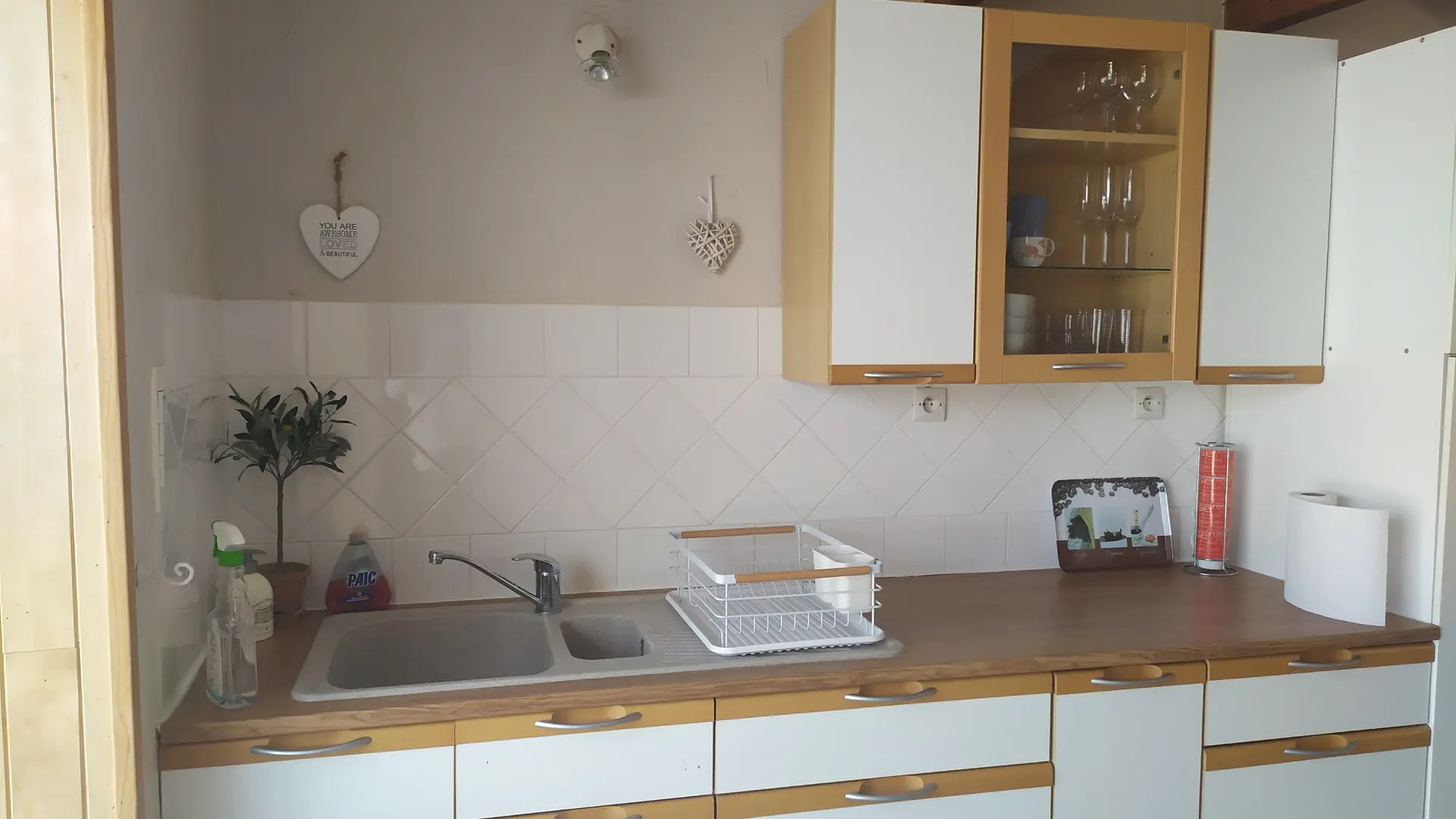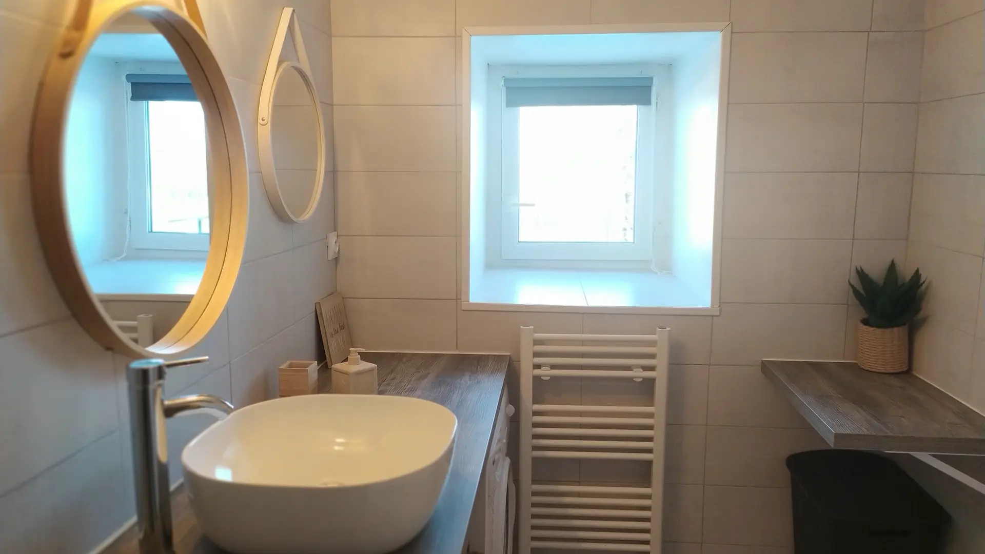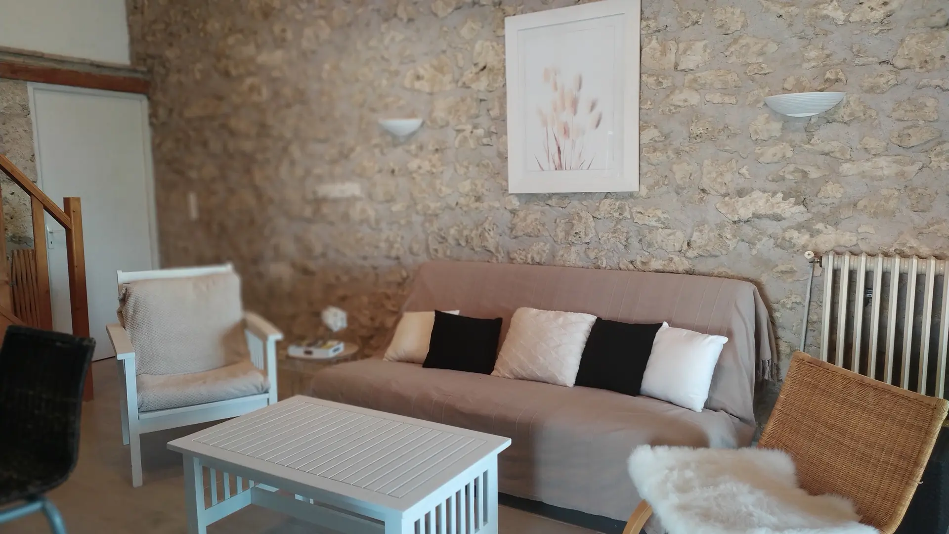 Maison de campagne pour 4 personnes composée de : 2 chambres (lit deux personnes, 2 lits superposés) 1 cuisine américaine équipée (four, four micro onde), d'un salon avec clic clac (TV) , sdb avec douche et WC séparé.