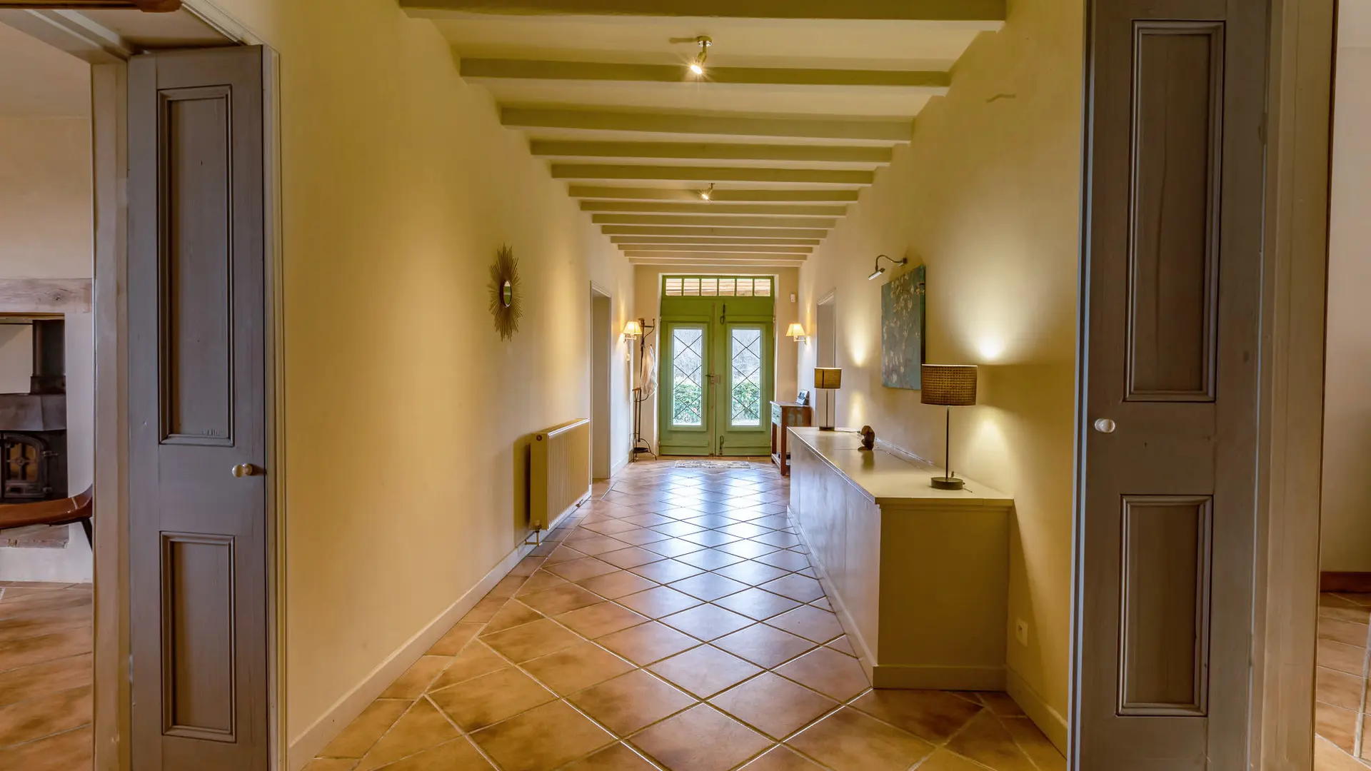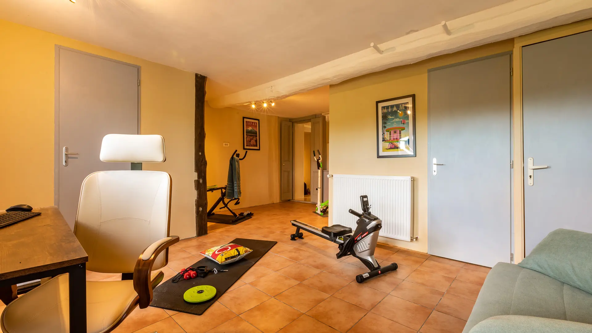 Typique des maisons gasconnes, l’entrée principale ouvre sur un couloir central distribuant les différentes pièces du rez de chaussée : une cuisine toute équipée ouverte sur la salle à manger avec un poêle à bois à double foyer, un salon ouvert sur la piscine, avec cheminée, smart TV écran plat de 60 pouces et barre de son, ainsi qu’une pièce de indépendante avec bureau, ordinateur, imprimante et équipements sportifs (rameur, stepper, appareil d’abdos, vélo elliptique).