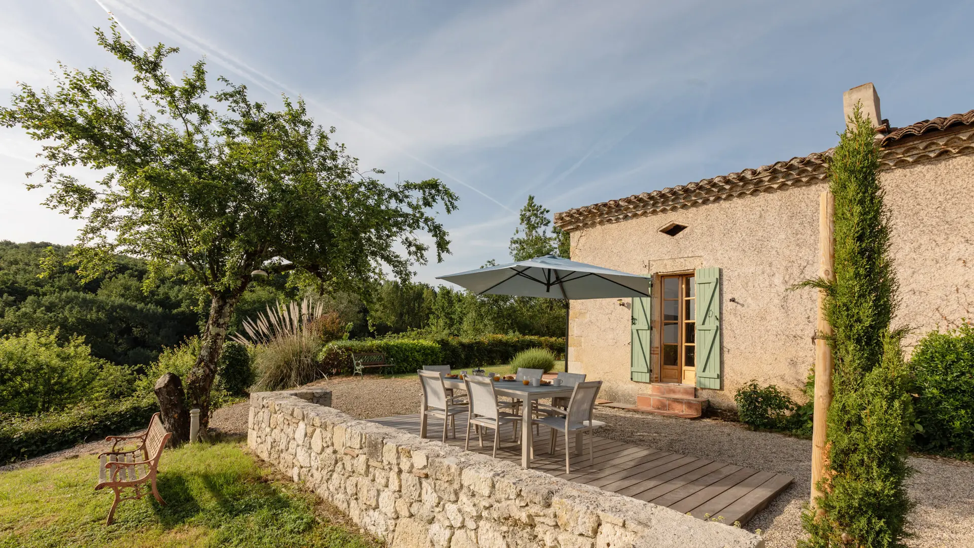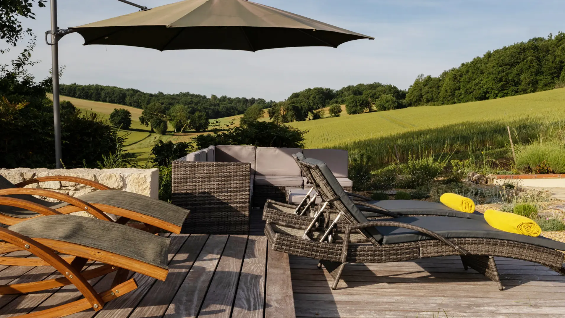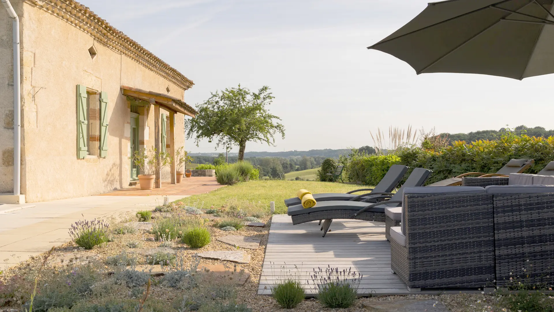 A l’extérieur, c’est l’enchantement. Une vue sans nuisance, ni vis à vis et un calme absolu pour profiter des différentes terrasses avec mobilier de jardin et parasols : une terrasse avec vue sur le soleil levant prés de la cuisine pour le petit déjeuner (un régal!), une terrasse solarium avec bains de soleils et coussins, chiliennes, salons de jardin en résine avec coussins, parasols...