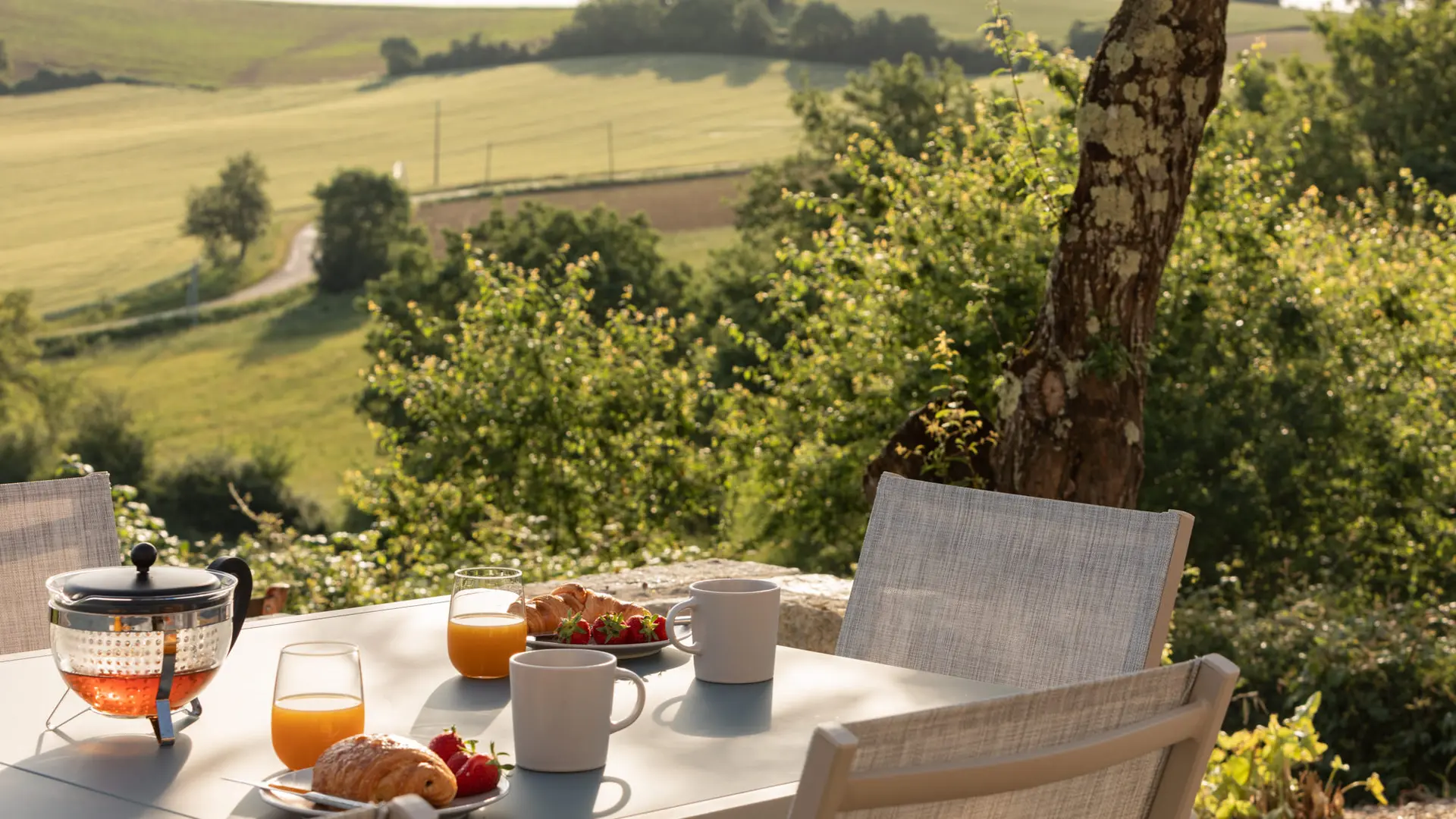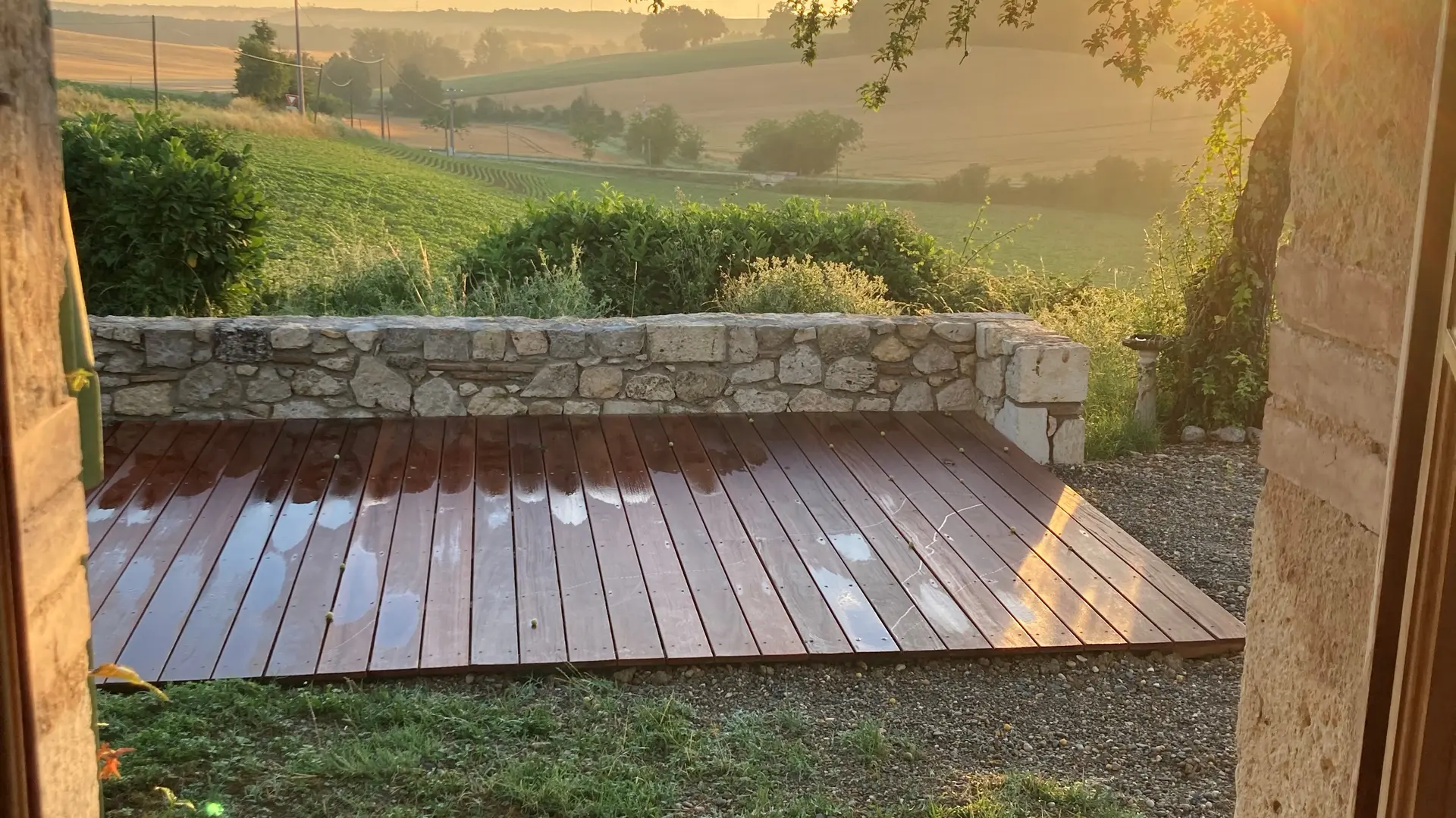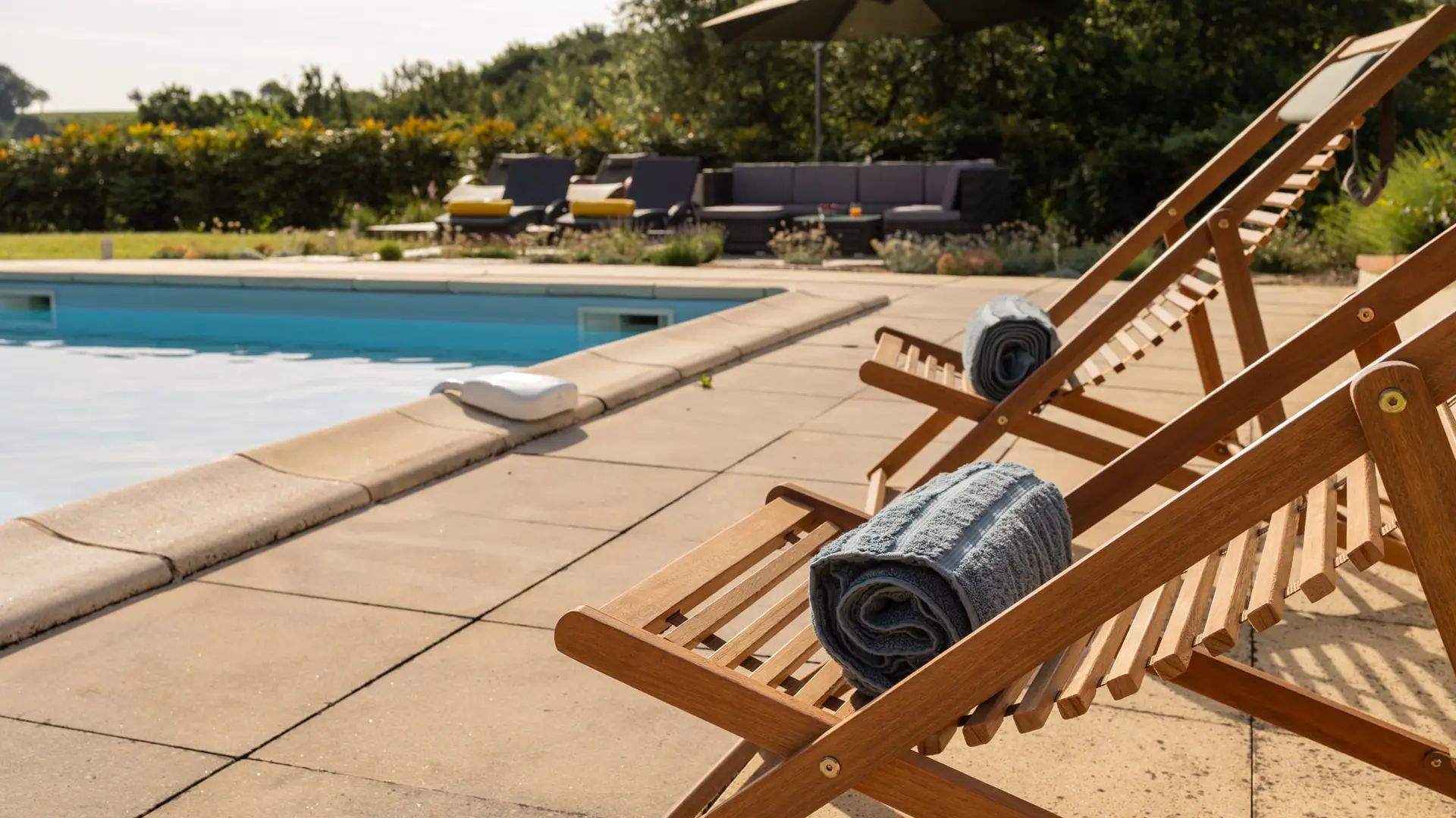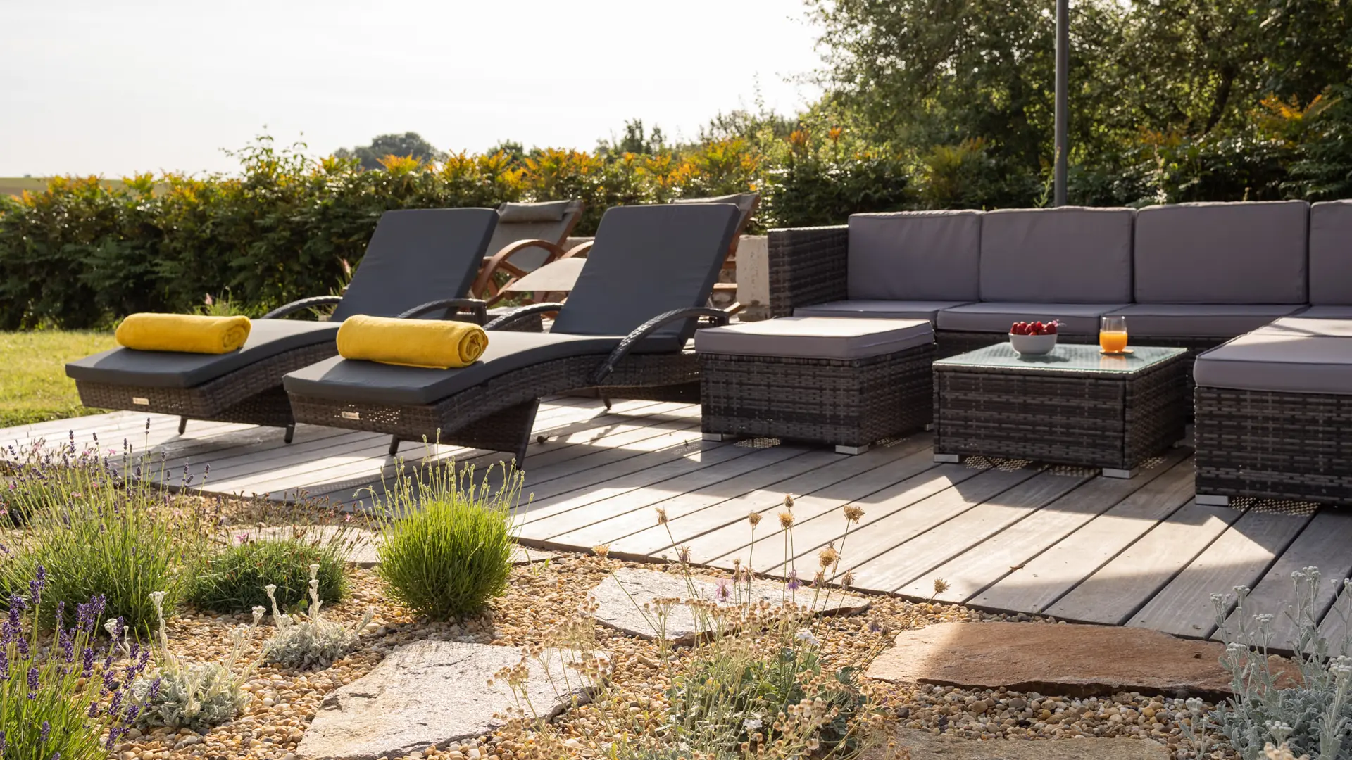 A l’extérieur, c’est l’enchantement. Une vue sans nuisance, ni vis à vis et un calme absolu pour profiter des différentes terrasses avec mobilier de jardin et parasols : une terrasse avec vue sur le soleil levant prés de la cuisine pour le petit déjeuner (un régal!), une terrasse solarium avec bains de soleils et coussins, chiliennes, salons de jardin en résine avec coussins, parasols...