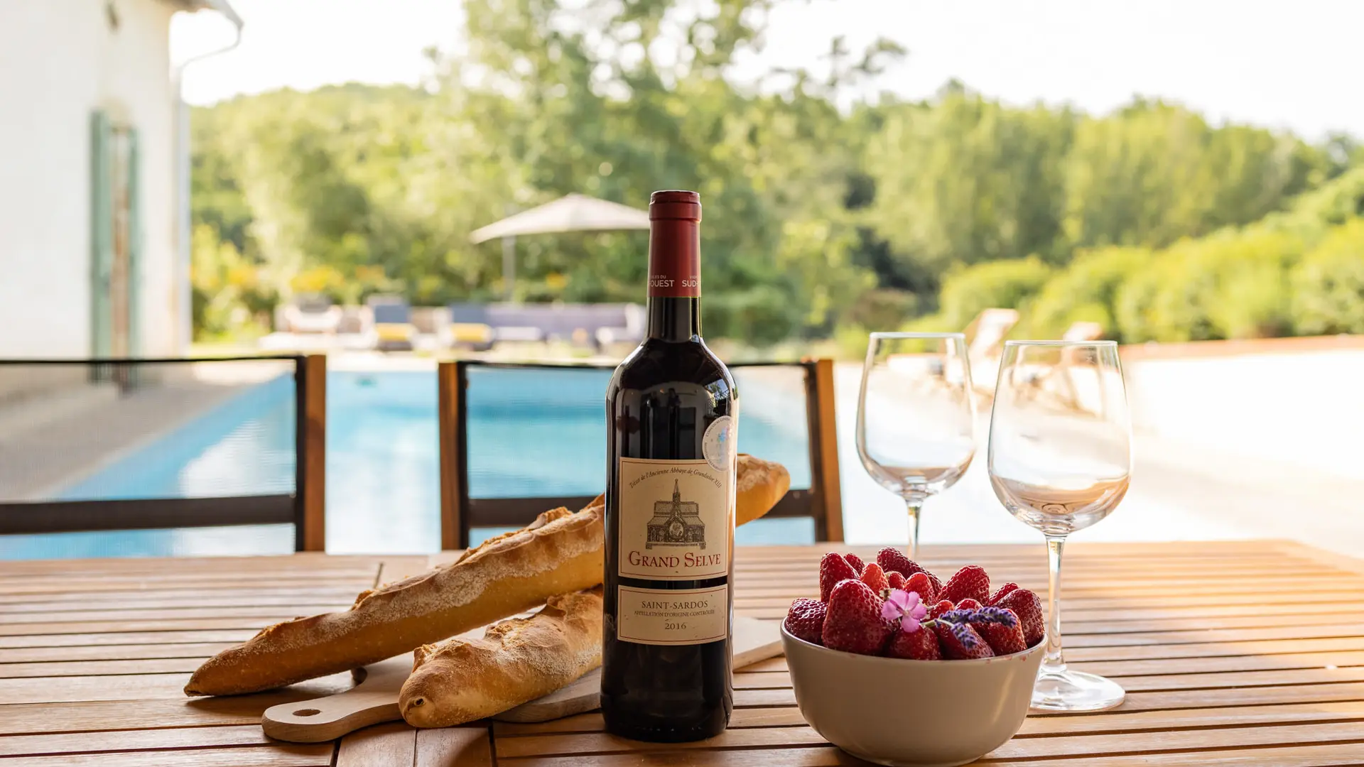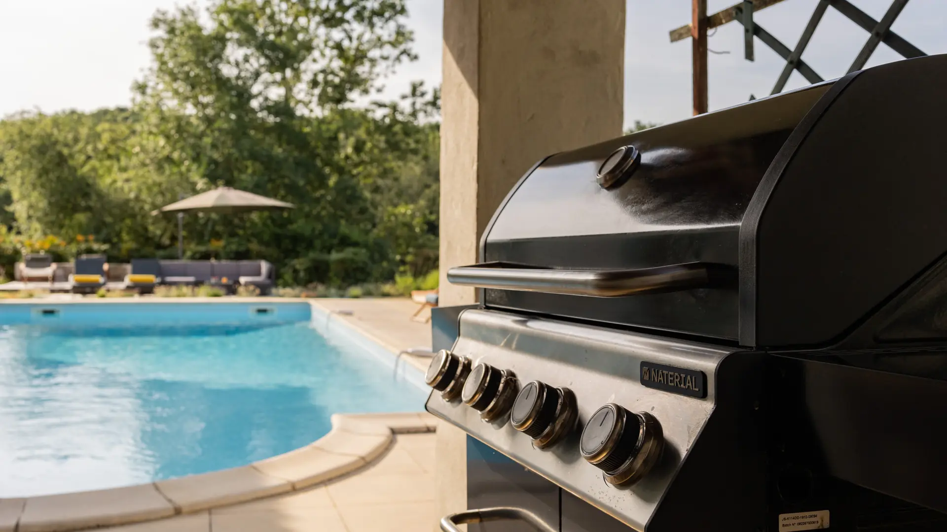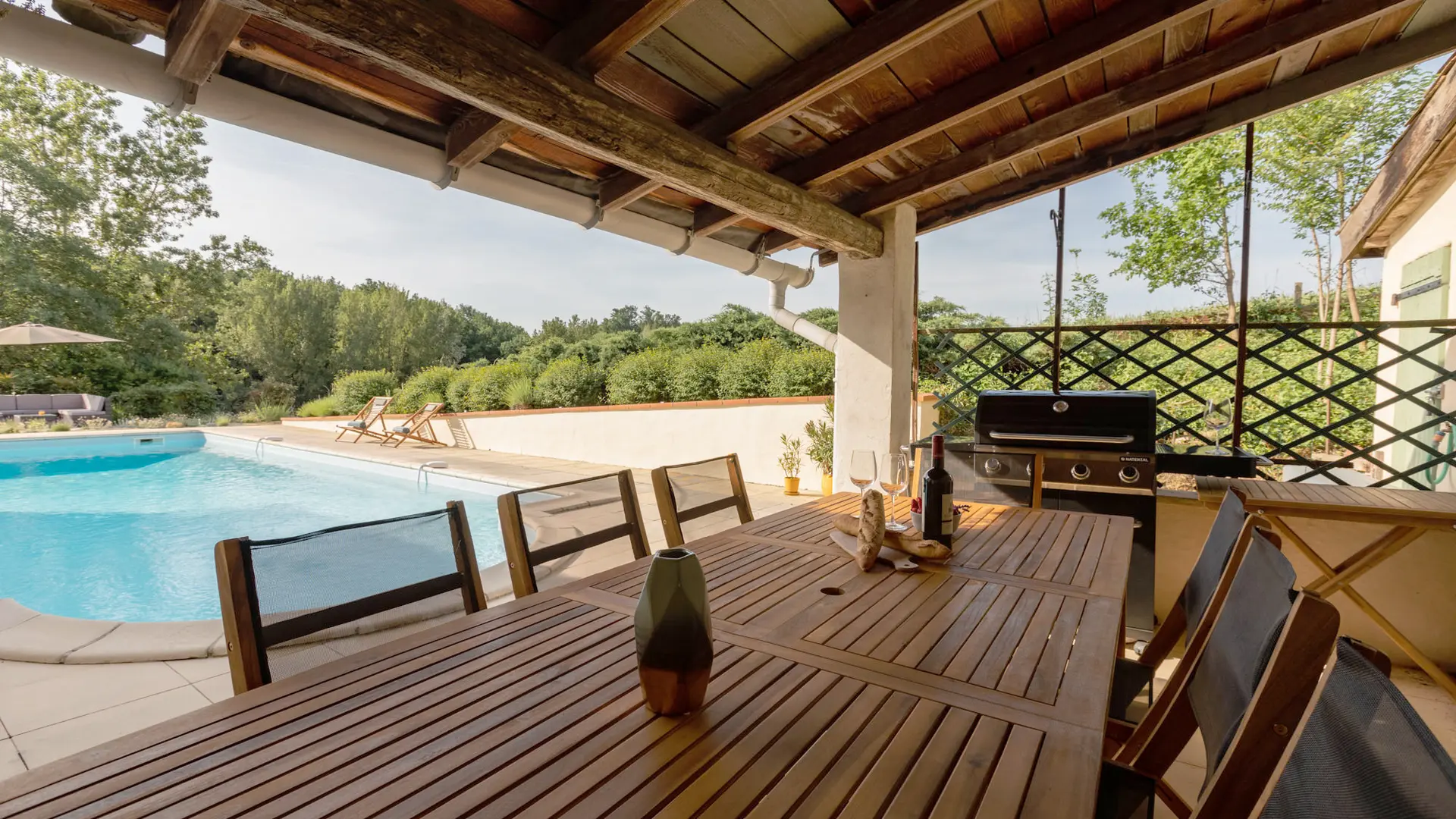 Et enfin, la terrasse abritée prés de la piscine. Le centre nevralgique d’un séjour aux beaux jours, avec une table de repas extérieure, un barbecue et un accès direct à la cuisine d’été incluant plaque de gaz 4 feux, frigo, plan de travail avec évier et machine à glaçons !