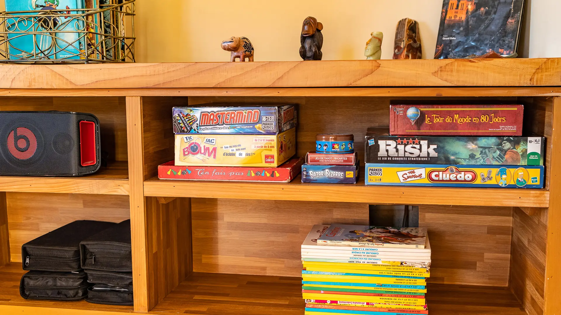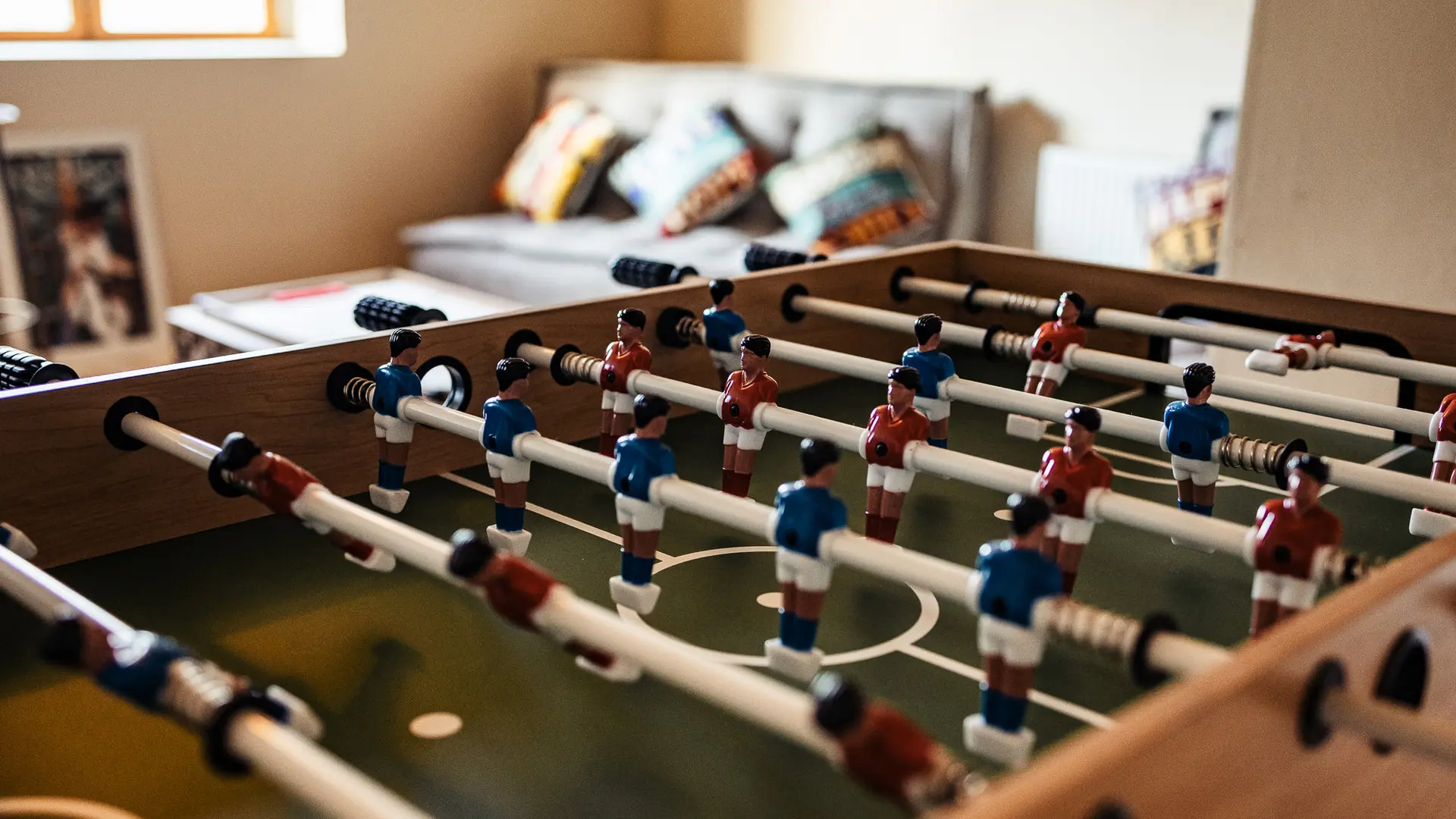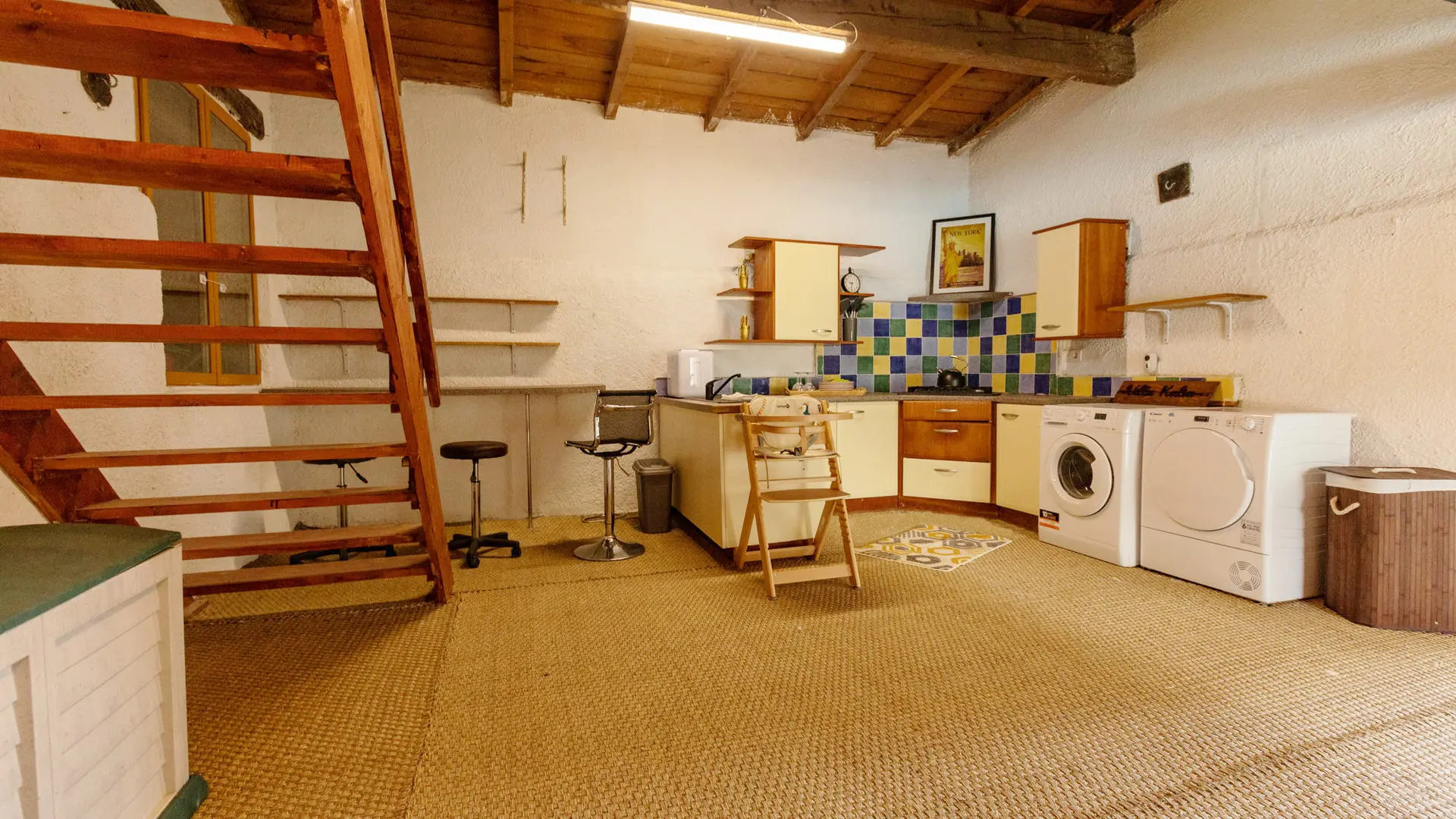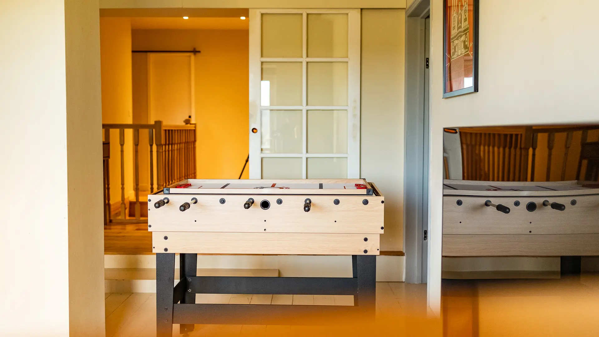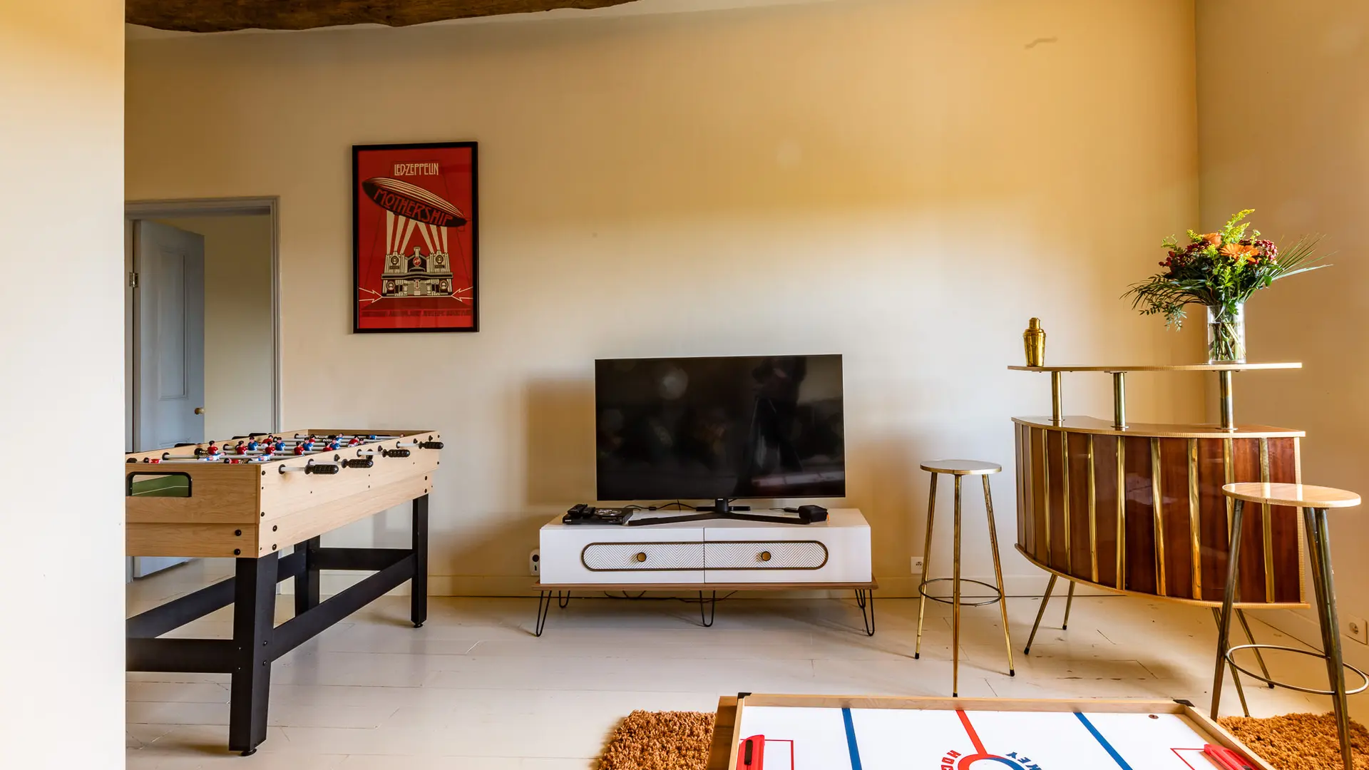A l'étage se situe le salon de repos avec une console WII, une autre TV écran de plat de 55 pouces, une table multi-jeux pour enfants ( baby-foot, air-hockey…) et un bar vintage avec tabourets.