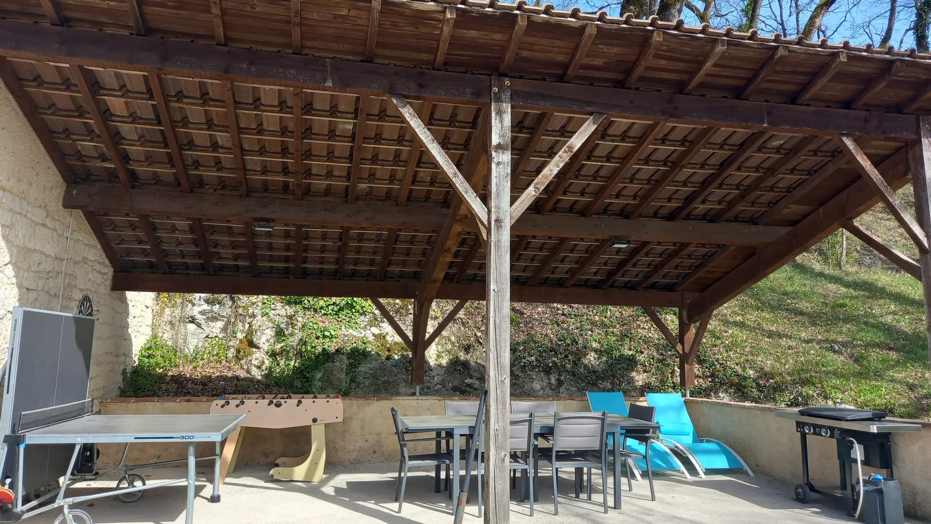 Grande terrasse couverte avec salon de jardin, plancha, baby-foot, jeux de fléchettes et table de ping-pong.