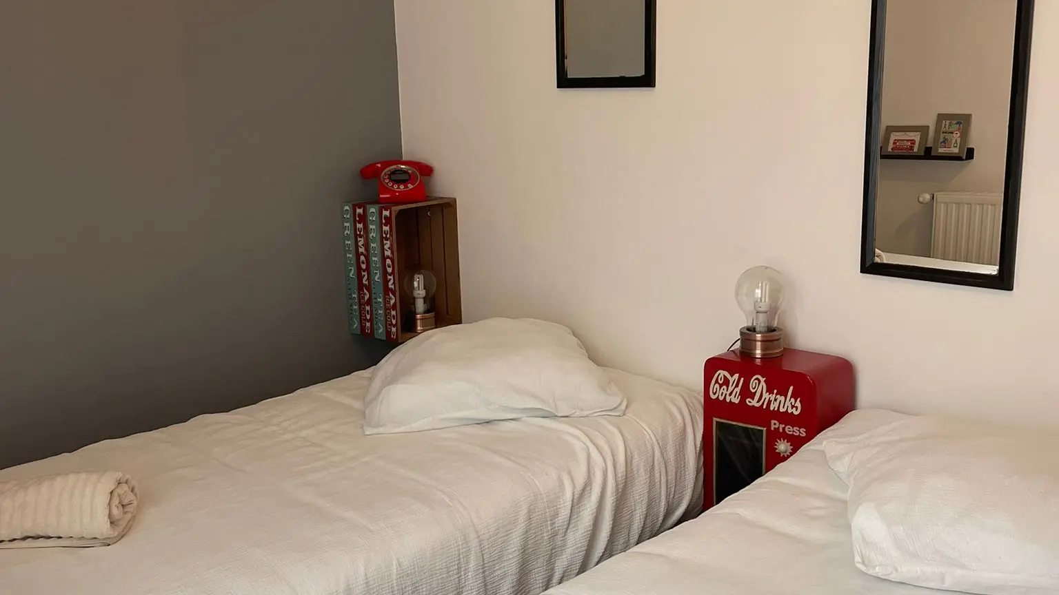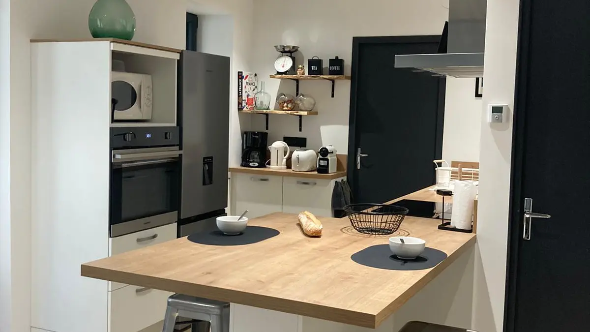 Le logement comprend : au rez-de-chaussée, une cuisine entièrement équipée (plaque à induction, fours, lave-vaisselle, îlot central), un séjour (table et 8 chaises), un salon TV (bureau, canapé, fauteuil, smart TV, Wifi), une salle d'eau avec douche, vasque et WC. A l'étage, un palier dessert 4 chambres (3 chambres avec 1 lit en 160 et 1 chambre avec 2 lits en 90), une salle d'eau avec double vasque, grande douche et WC. Un placard penderie se situe dans le couloir. Un garage au rez-de-chaussée avec lave-linge et baby-foot.