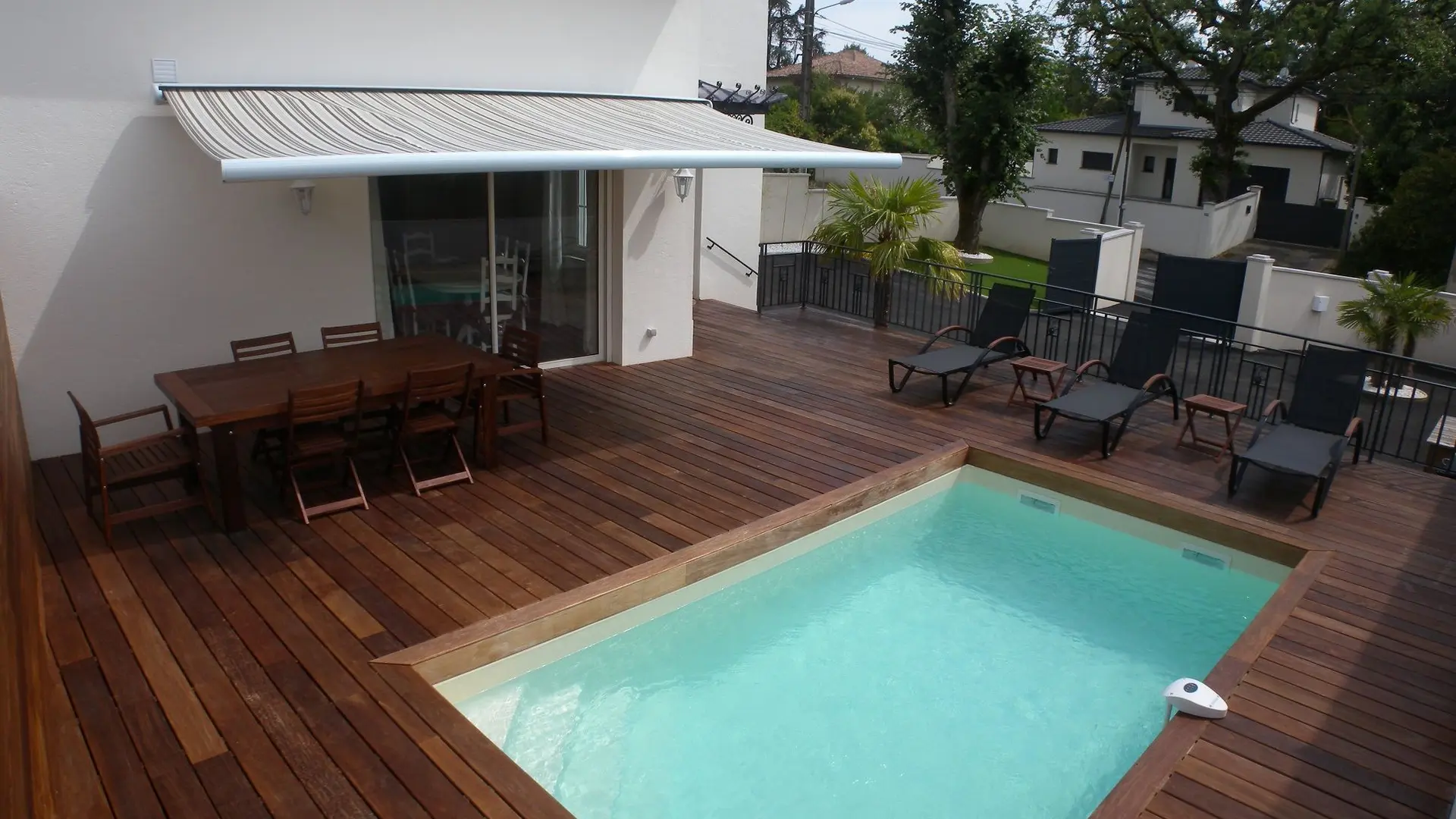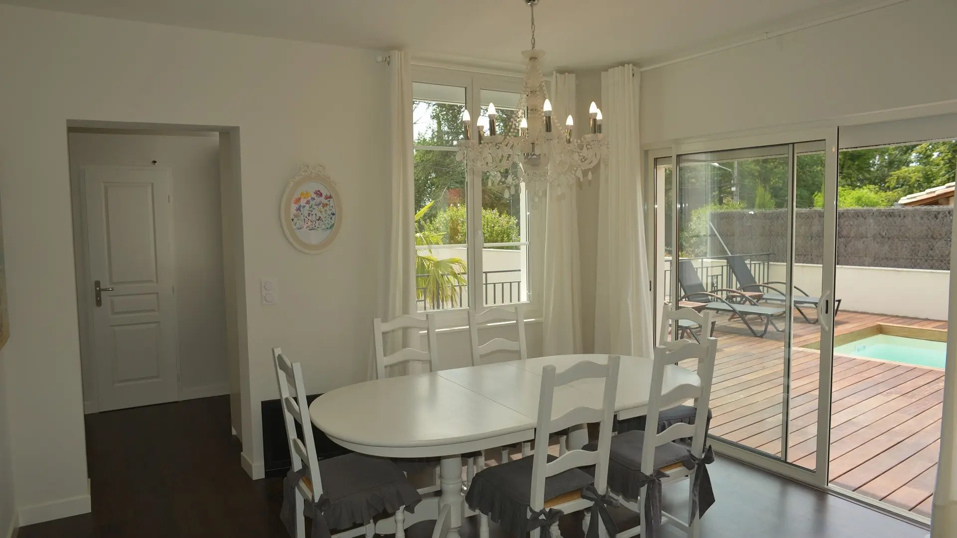 Une entrée. Un salon avec une télévision, une salle à manger pour 6 personnes et une cuisine entièrement équipée donnant sur la terrasse en bois avec sa piscine privée chauffée