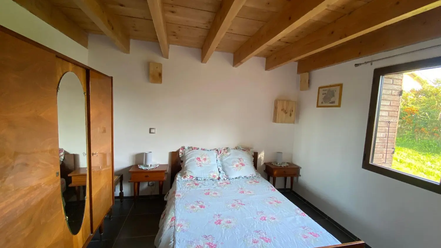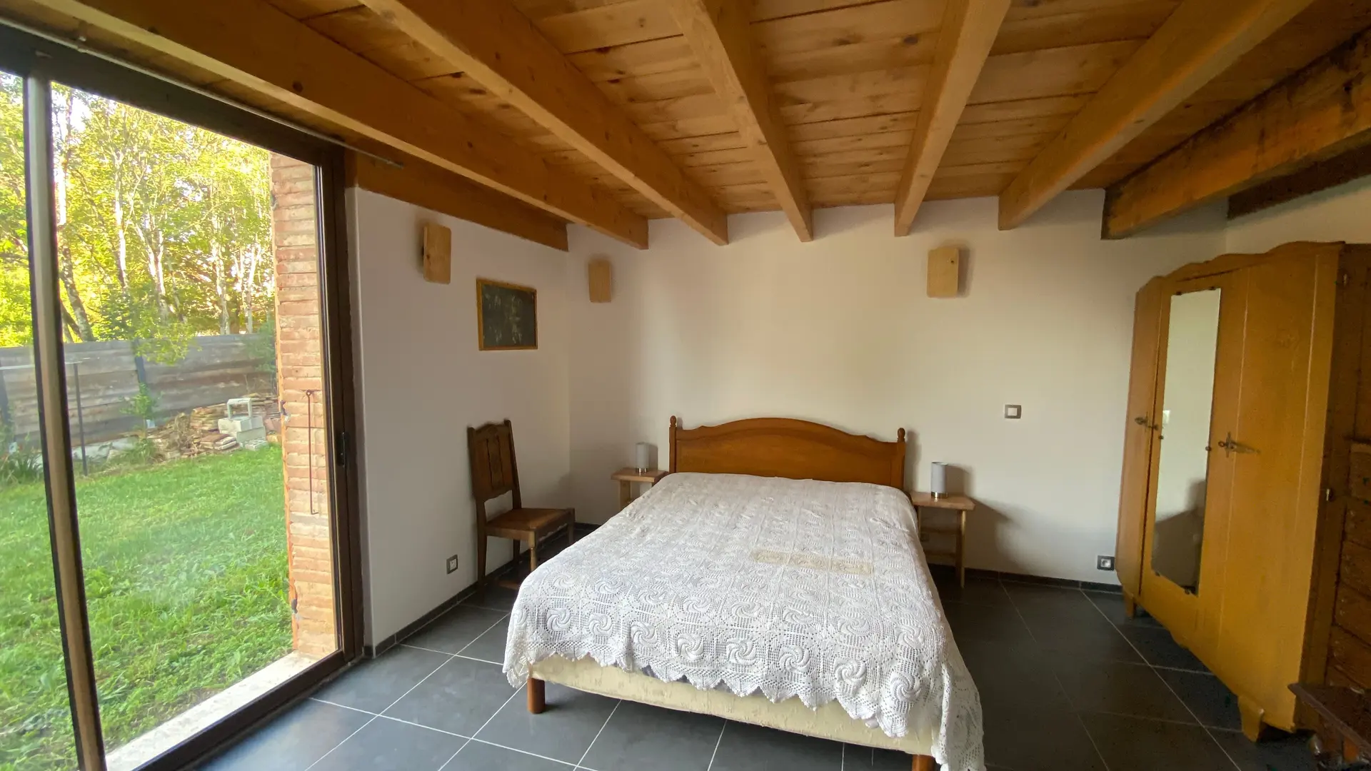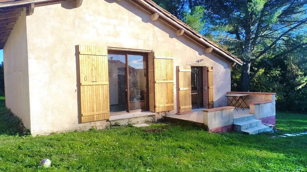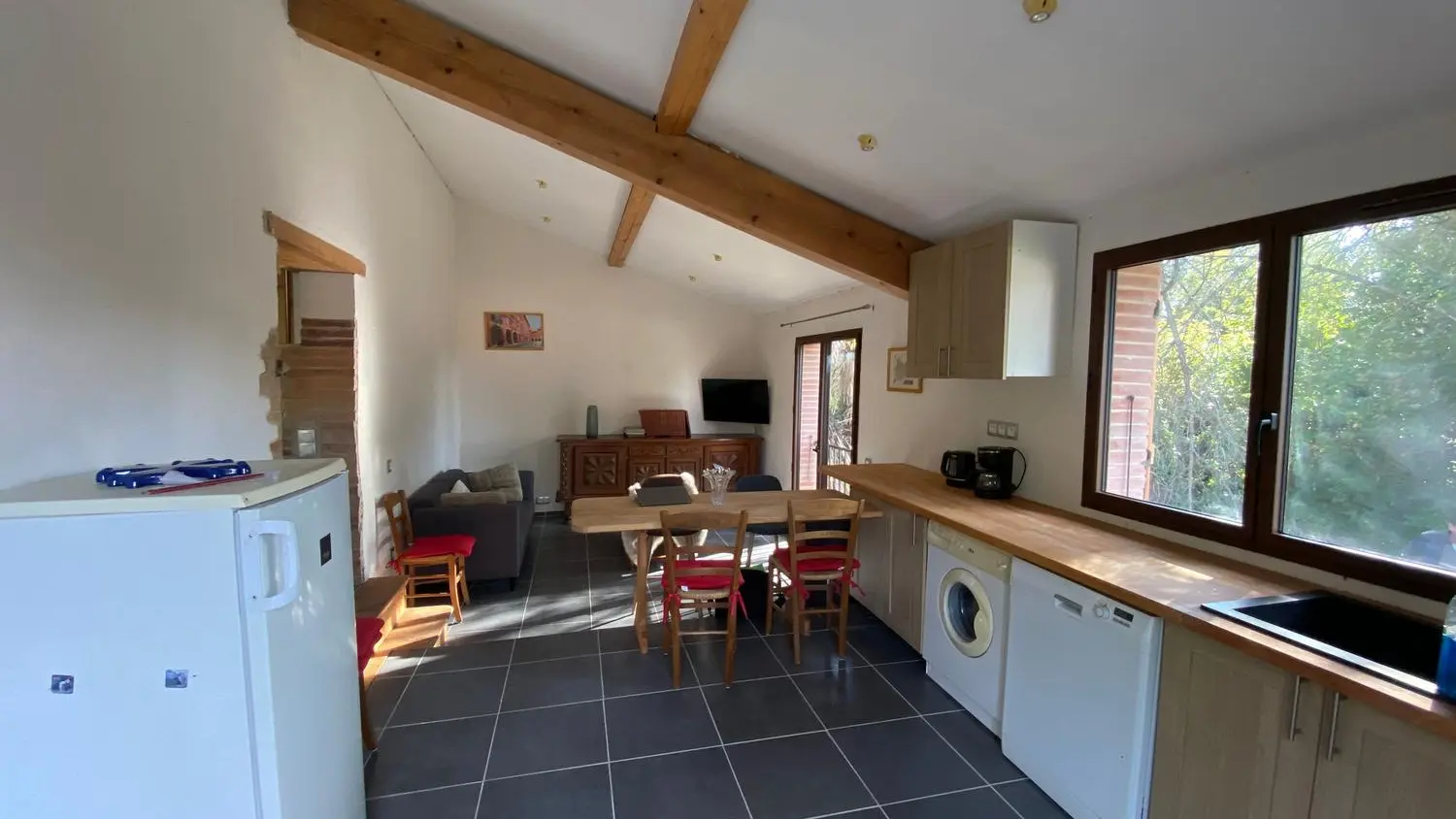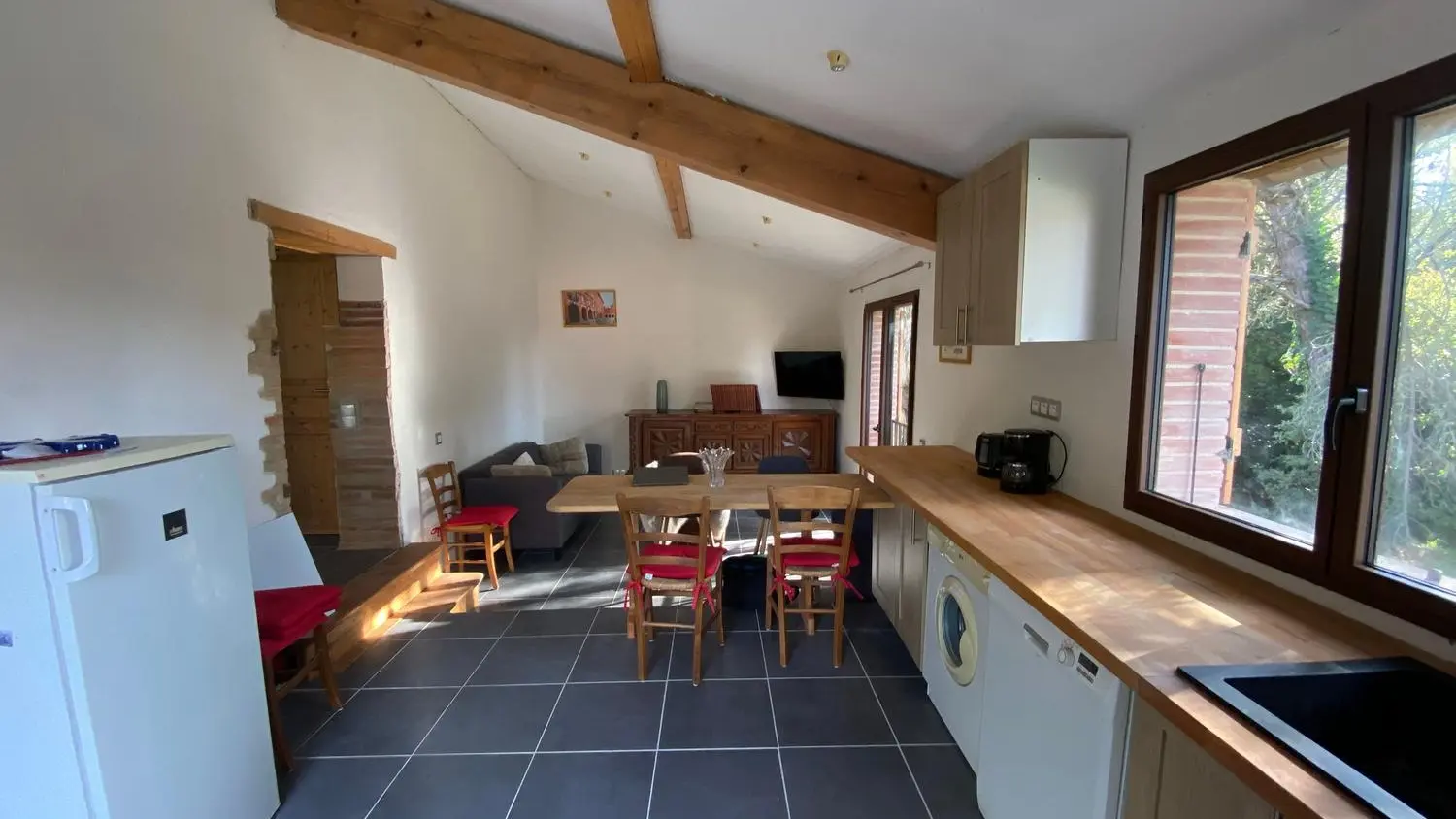 En accédant par la terrasse, découvrez la pièce à vivre avec l'espace cuisine (éléments intégrés avec lave-linge, lave-vaisselle, réfrigérateur, table induction, four et petits équipements, table avec 3 chaises et 3 tabourets hauts. 1 marche pour descendre à l'espace salon canapé 1 fauteuil, TV, meuble de rangement. 2 marches pour accéder à la zone nuit avec 1 chambre (1 lit 2 personnes en 160) 1 chambre (1 lit 140). Wc indépendant. Salle d'eau avec douche à l'italienne et lavabo. Terrasse avec barbecue et salon de jardin. Grand terrain arboré non clôturé. Draps linge de lit et de toilette fournis en supplément.