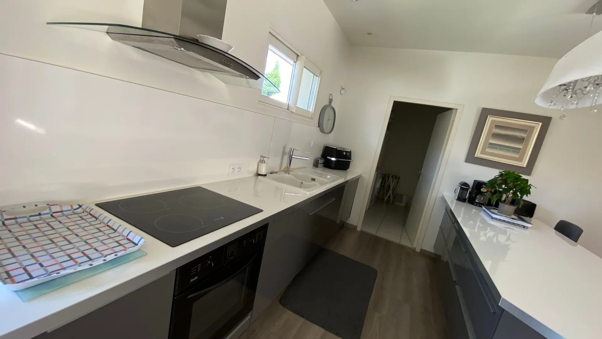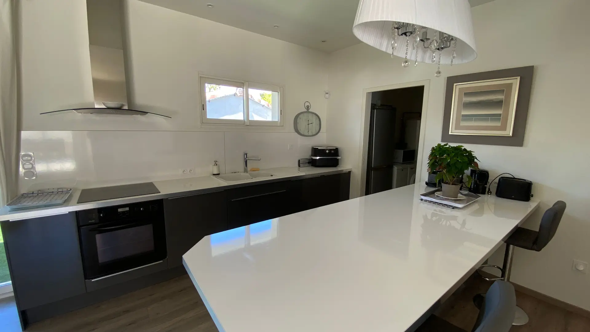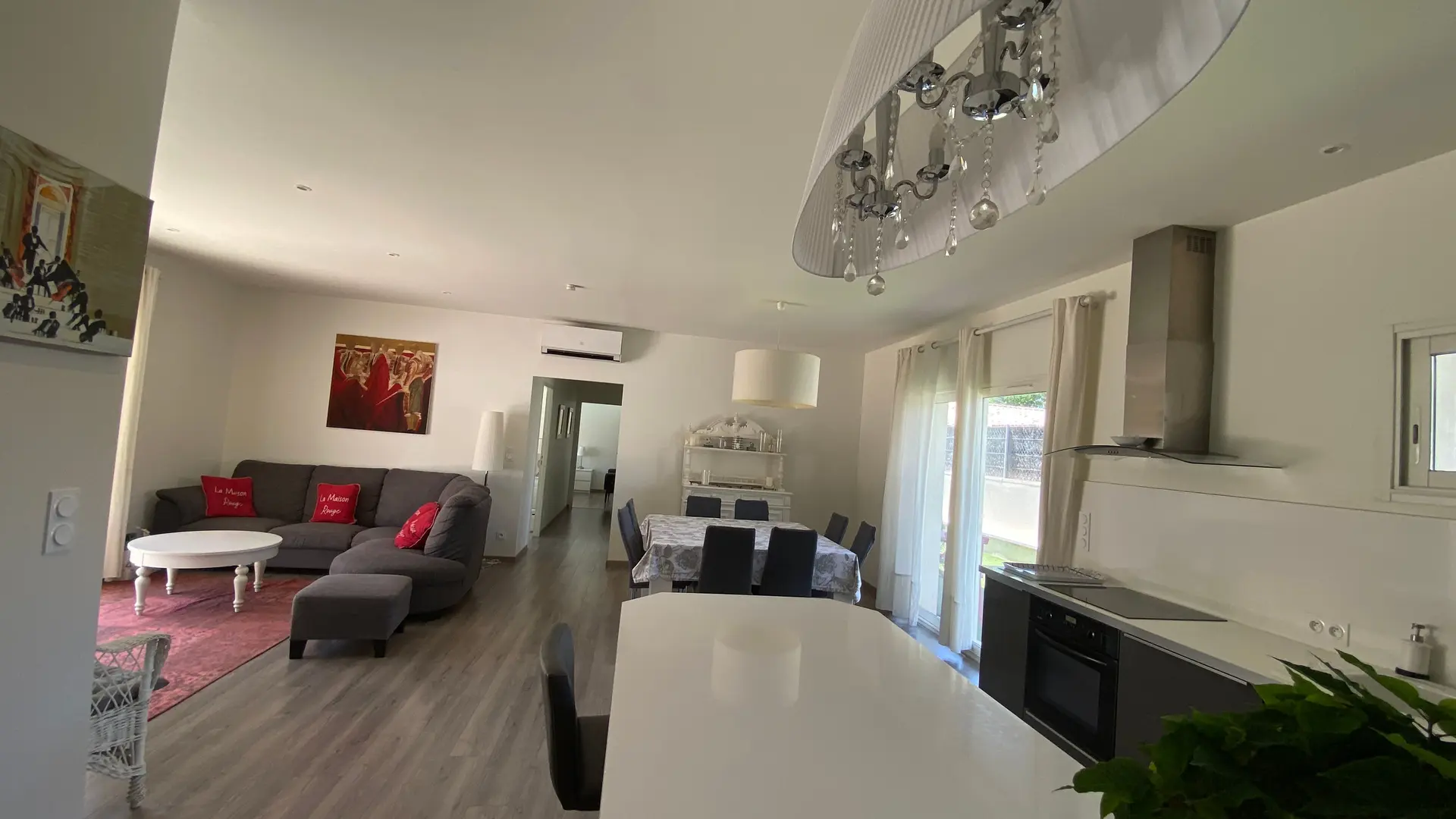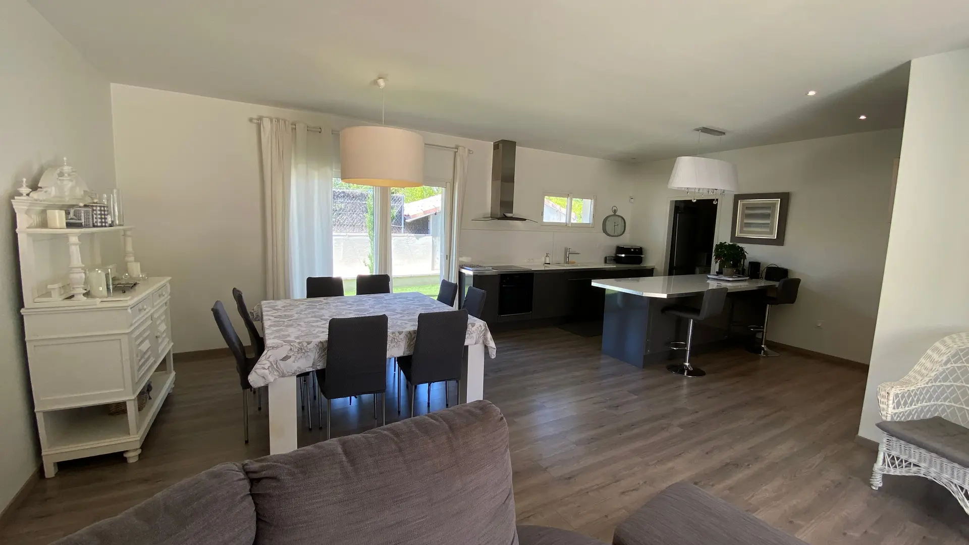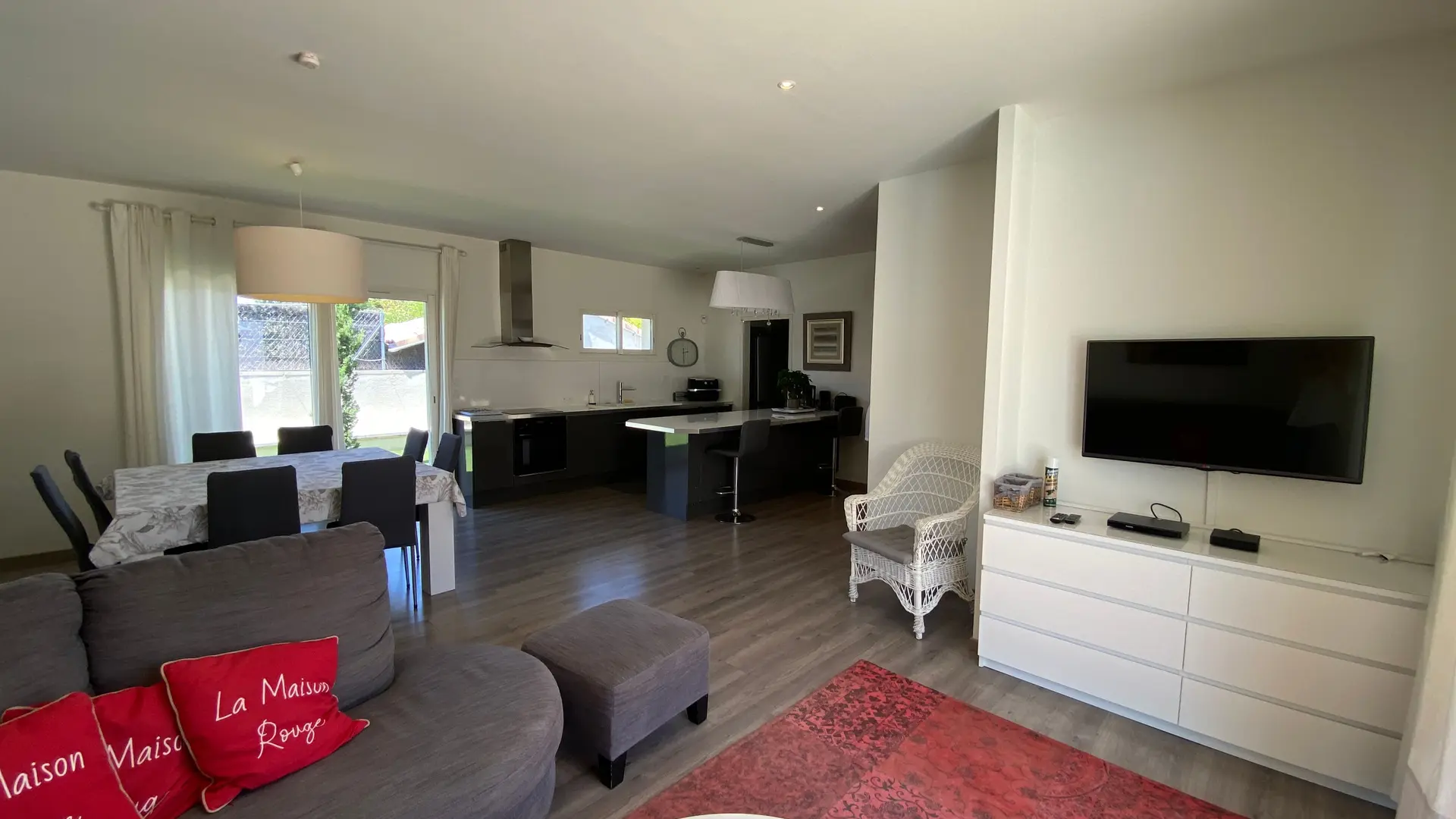 La maison comprend : Un grand séjour (canapé d'angle, TV écran plat), cuisine américaine entièrement équipée, coin repas pour 8 personnes.