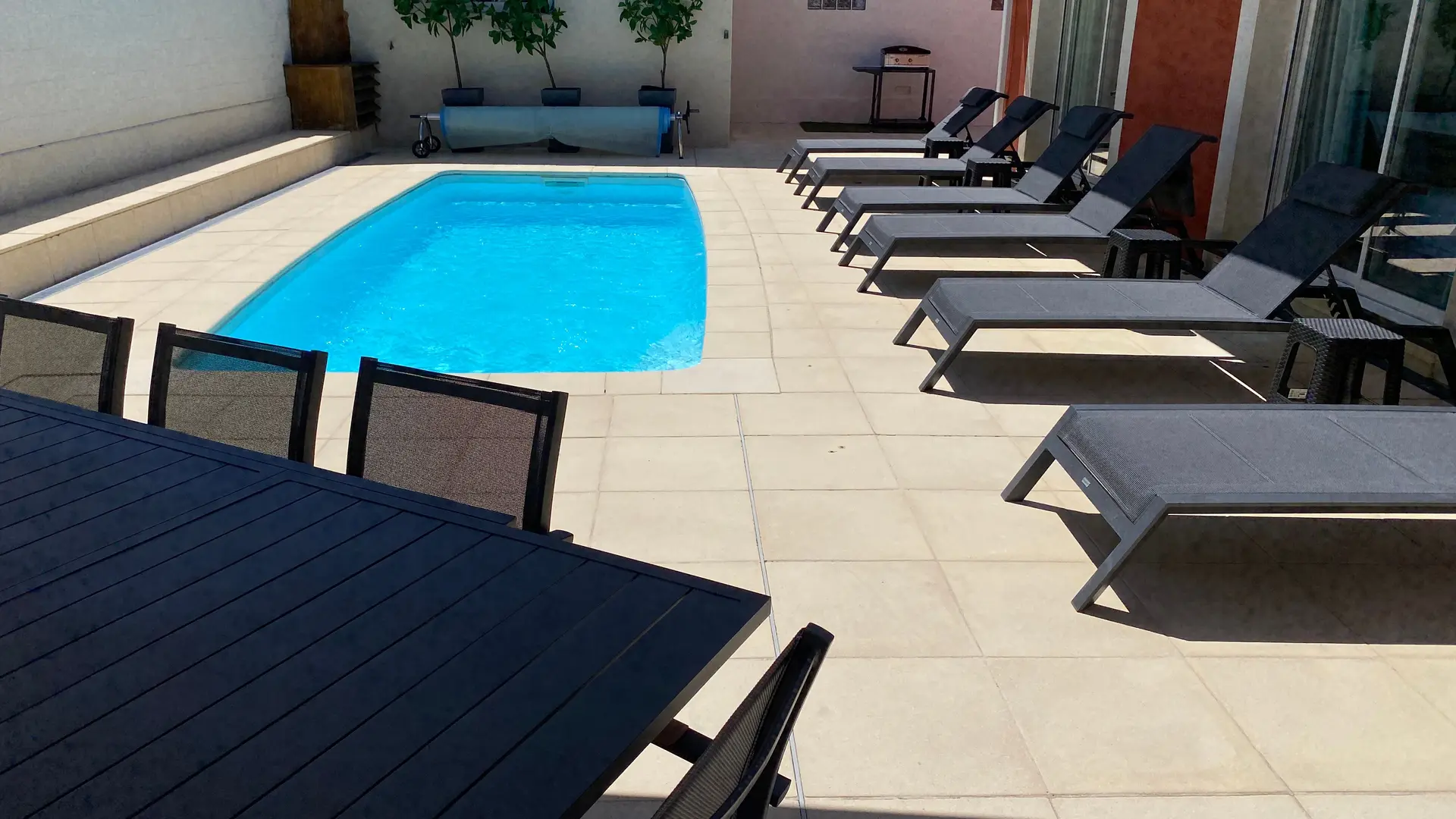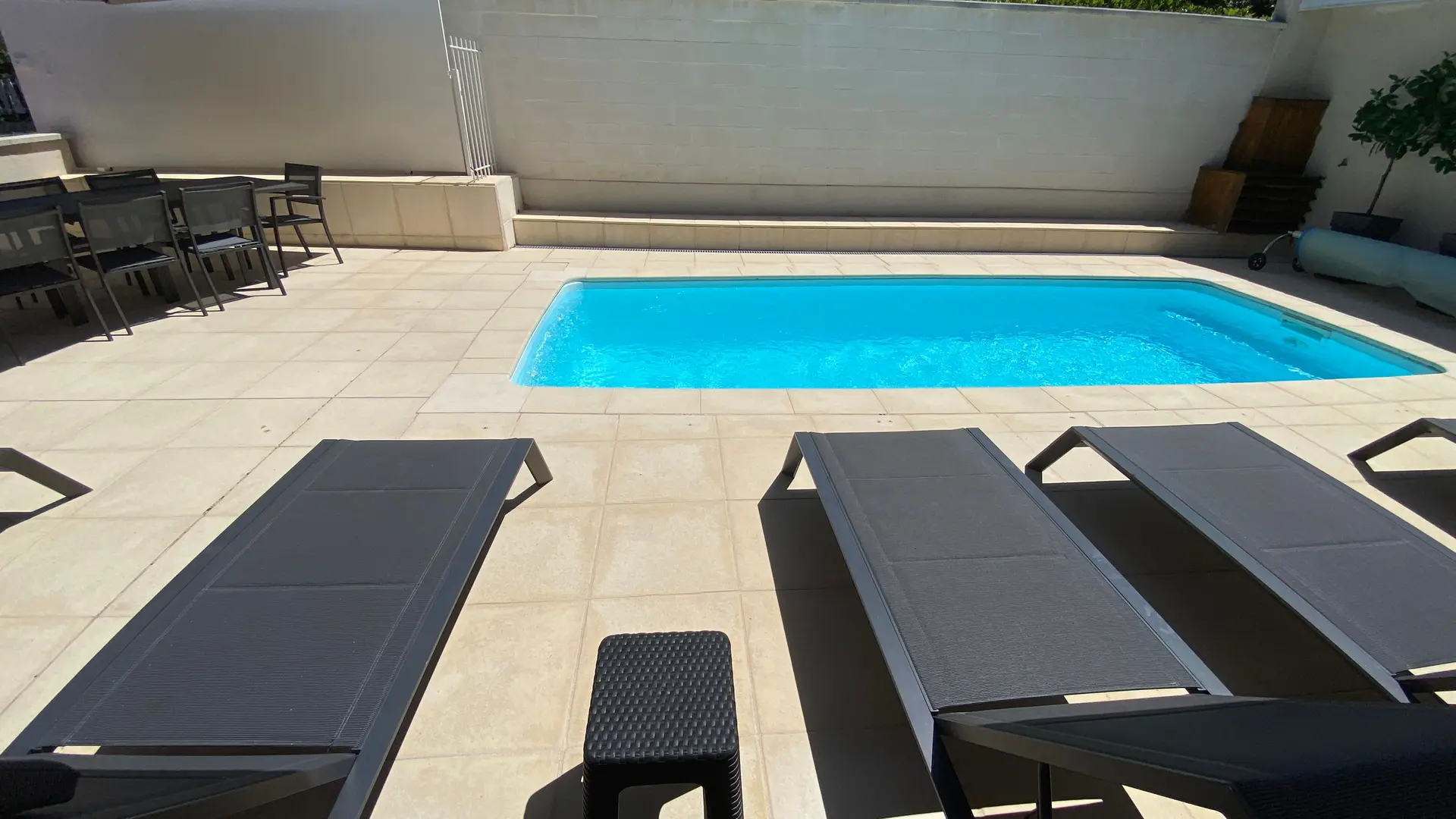 Grande terrasse autour de la piscine chauffée ( 6.20 x 2.60 m ).