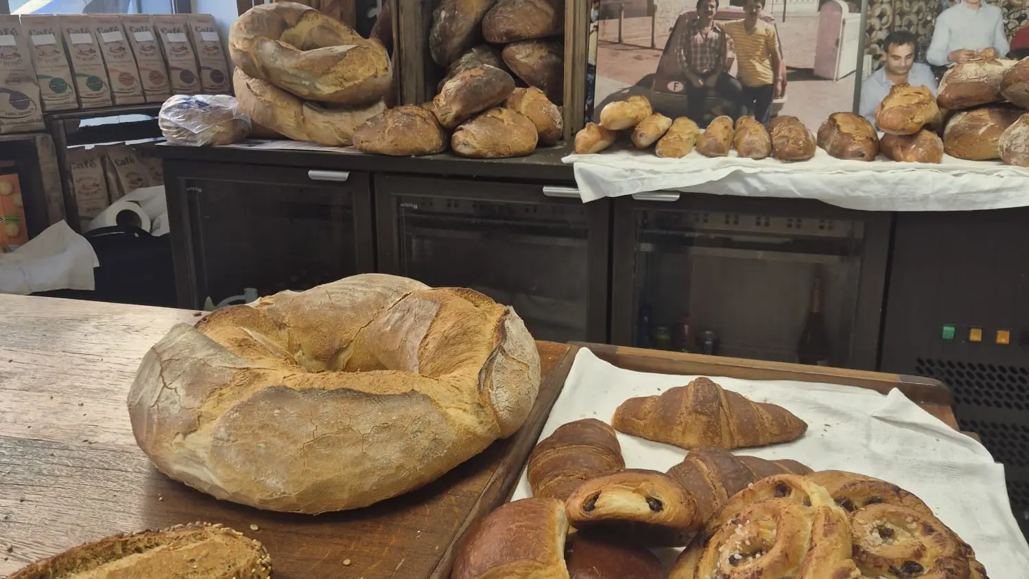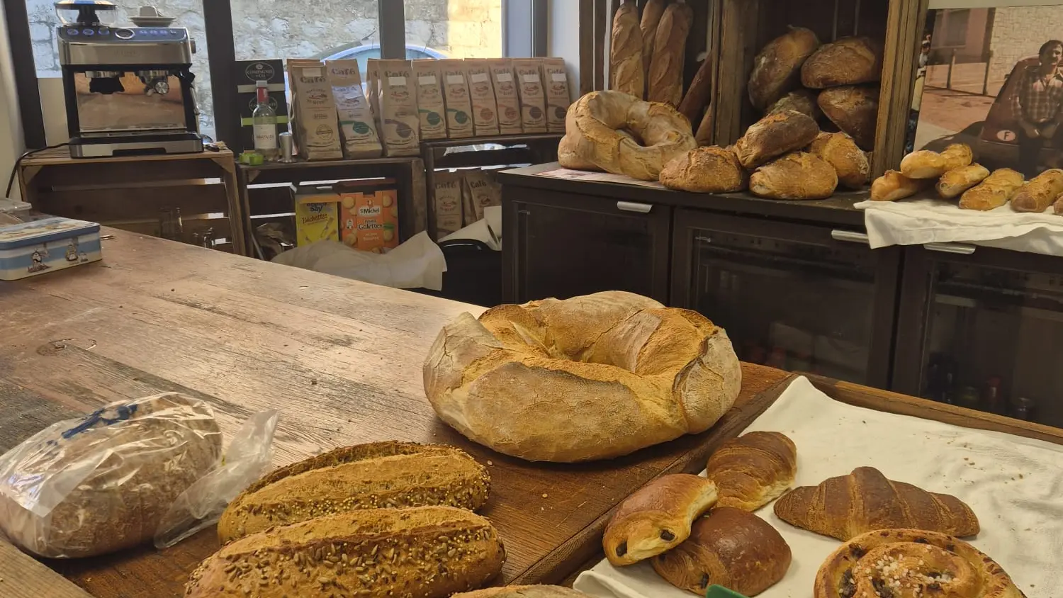 Dépôt de pain et viennoiseries venant de la boulangerie artisanale Loulou et Mat à Castelnau-Montratier : Baguettes traditionnelles, flûtes, miches de campagne, pains de seigle, pains aux céréales, croissants, chocolatines, et pains aux raisins, tous préparés avec des ingrédients de qualité.