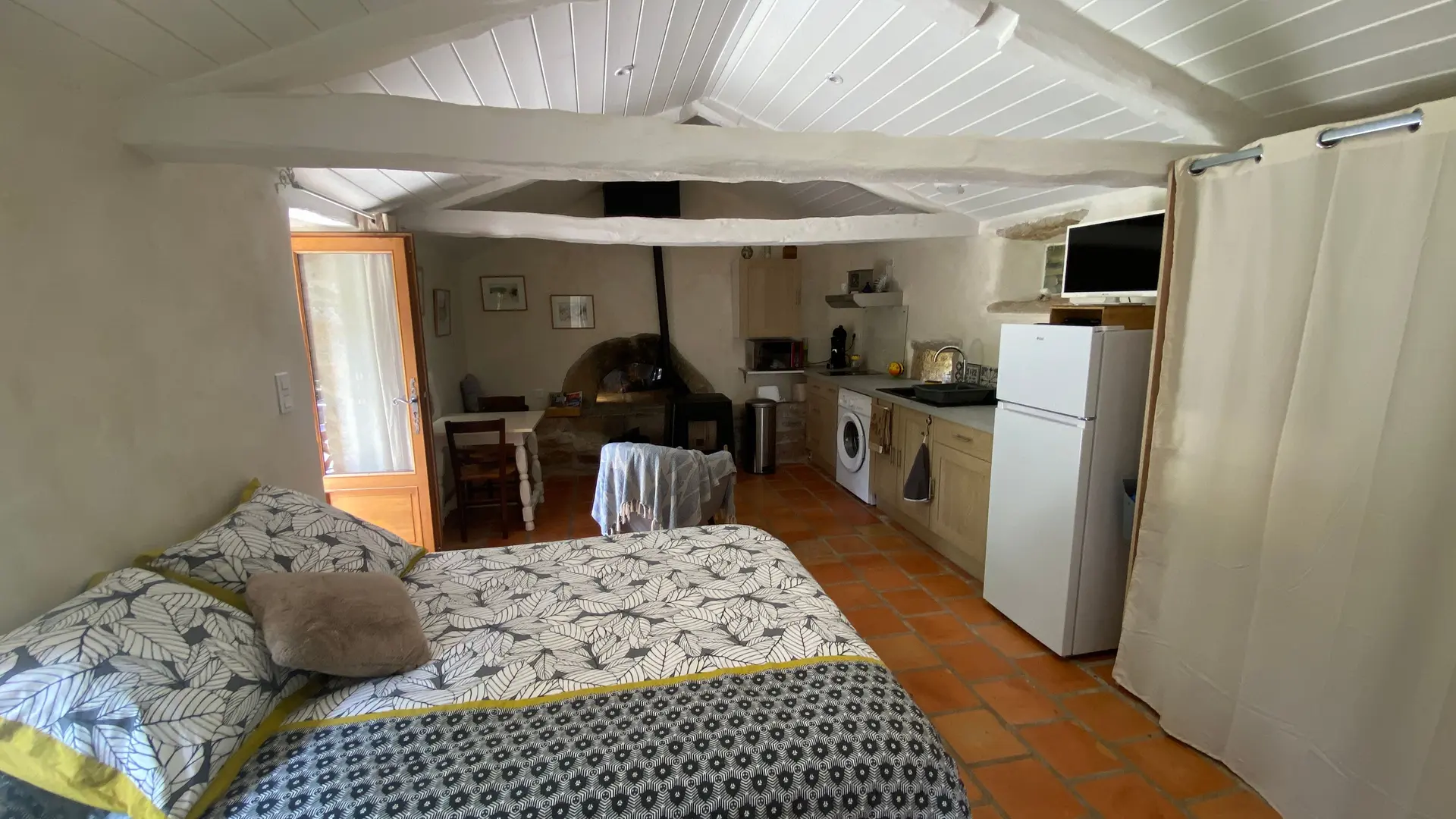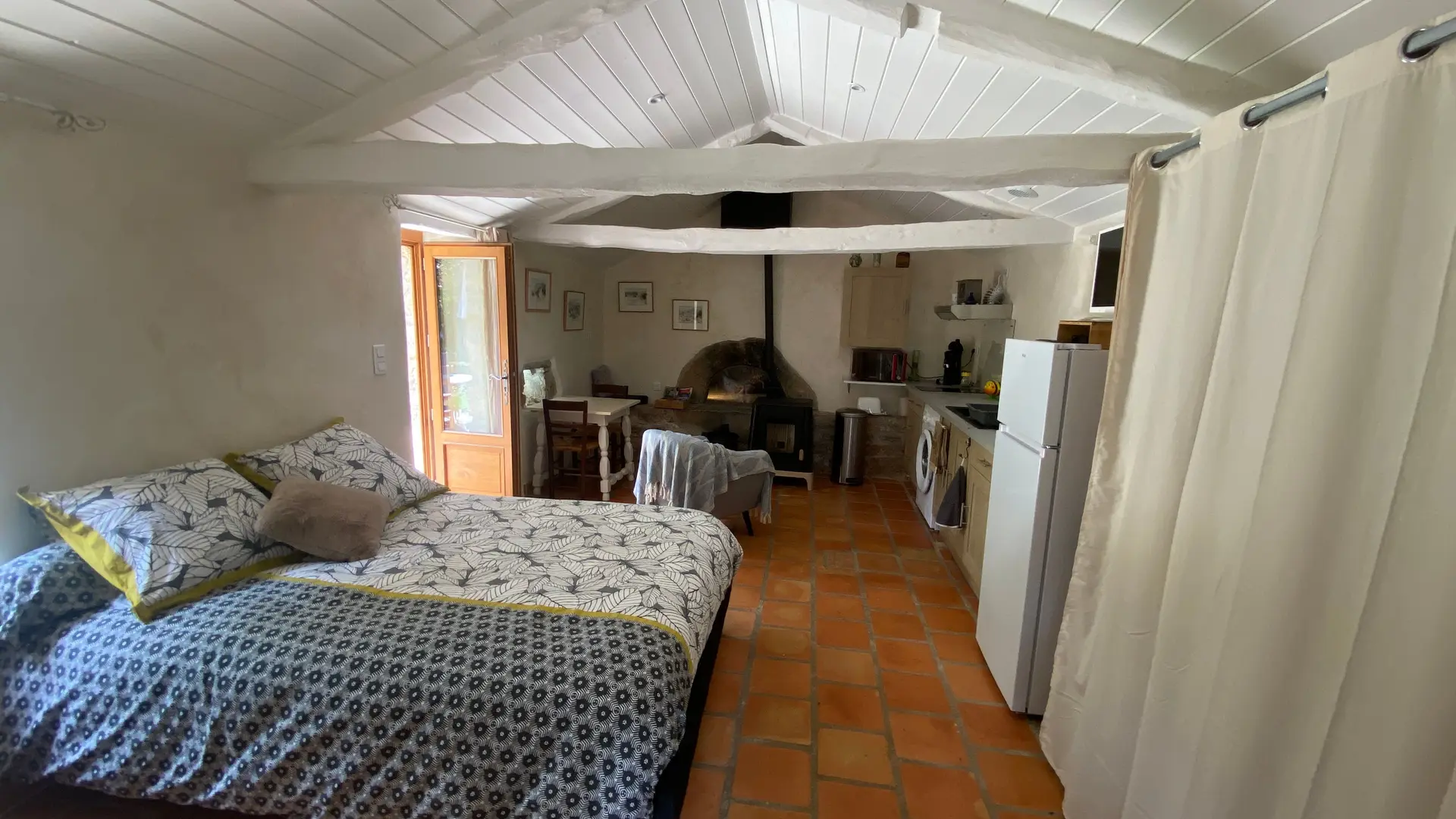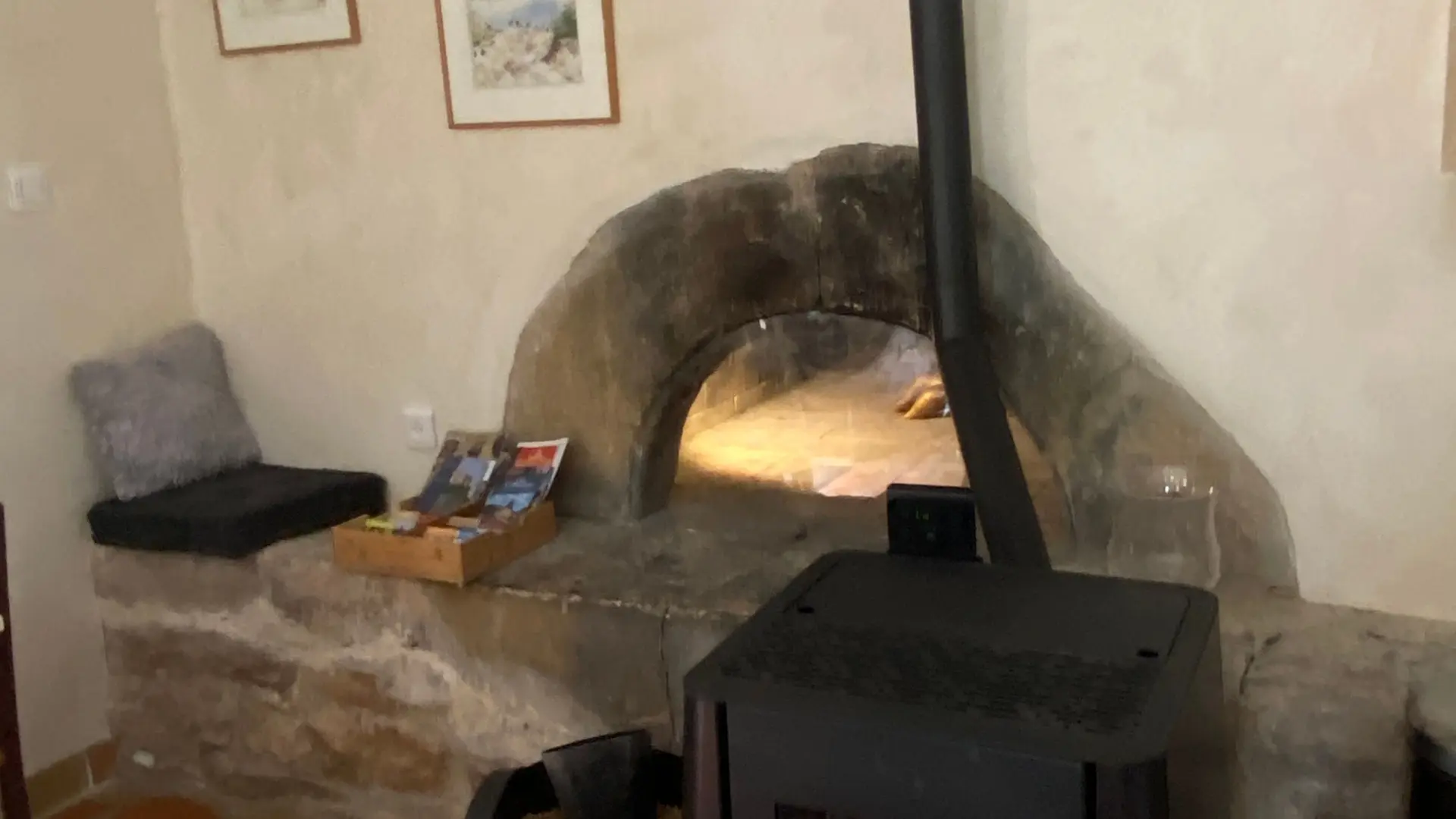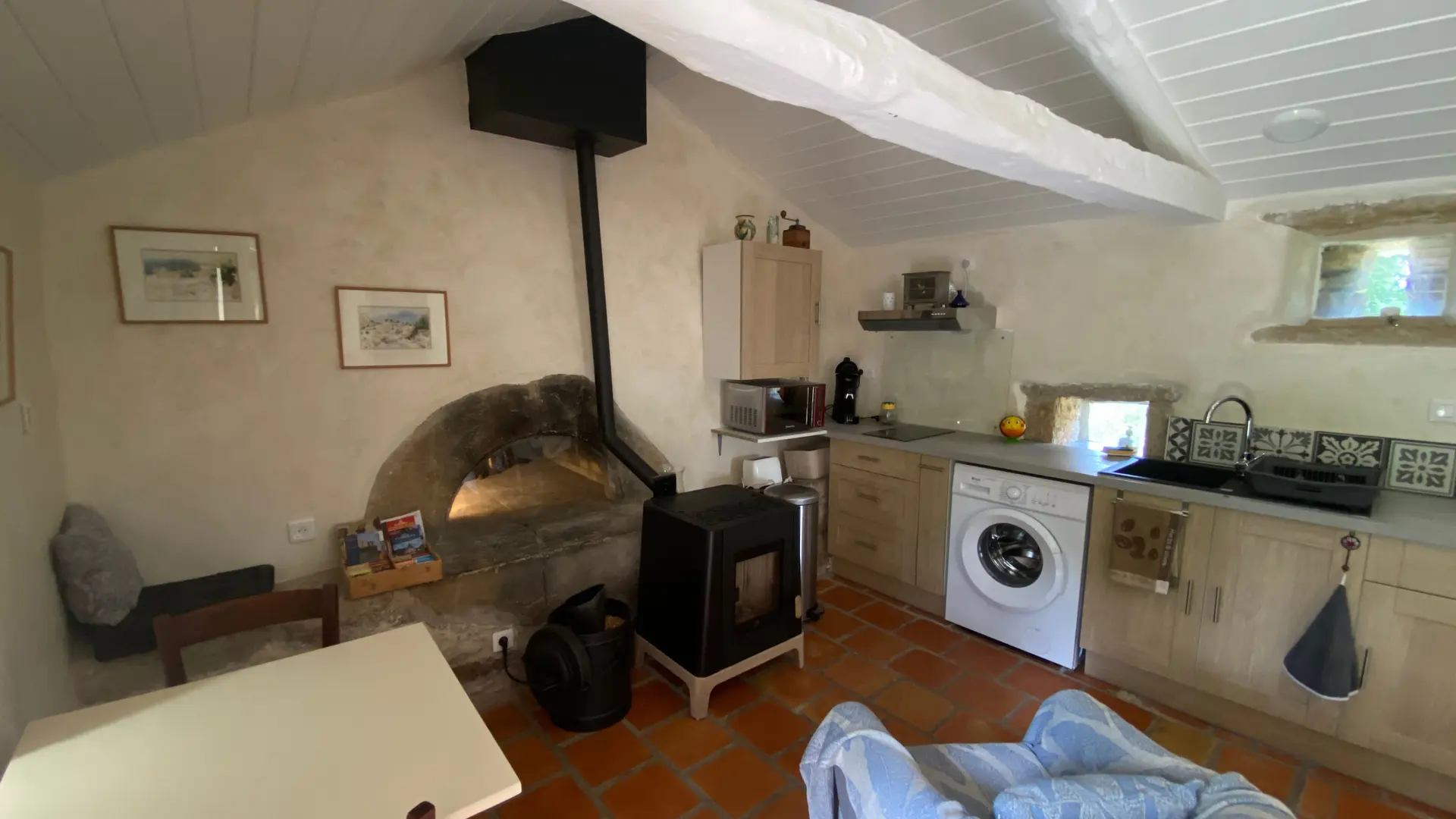 L'ancien four constitué d'une seule pièce vous propose : un espace cuisine (éléments intégrés avec plaque, four grill, lave-linge, réfrigérateur, congélateur, table, chaises) Un espace nuit ( 1 lit 140), et un coin salon devant le poêle à granulés (2 fauteuils), accès internet/wifi. Une salle d'eau fermée (douche, lavabo, sèche serviettes chauffant). Un wc indépendant. TV. Rangement dans penderie. Terrasse avec salon de jardin et salon de détente, barbecue fixe. Linge de lit et de toilette fournis compris dans le prix.