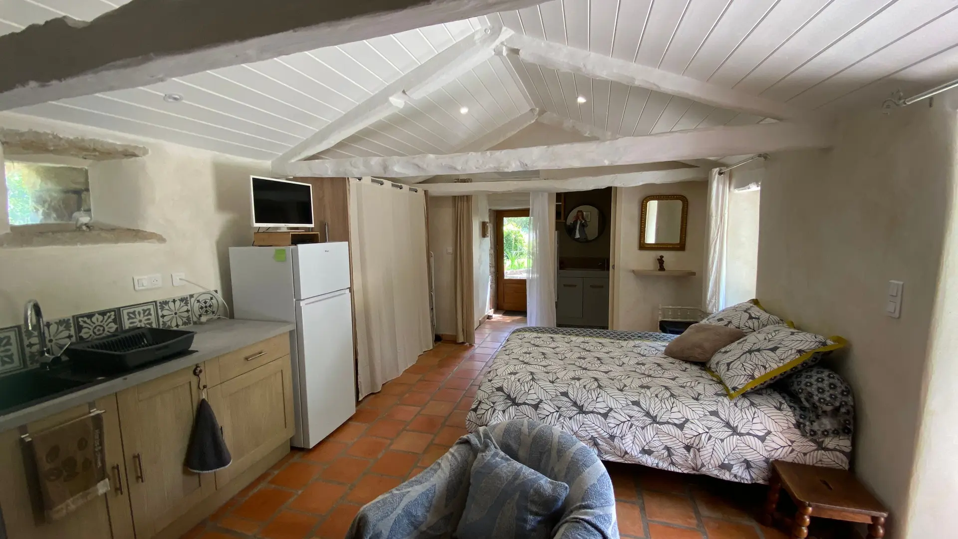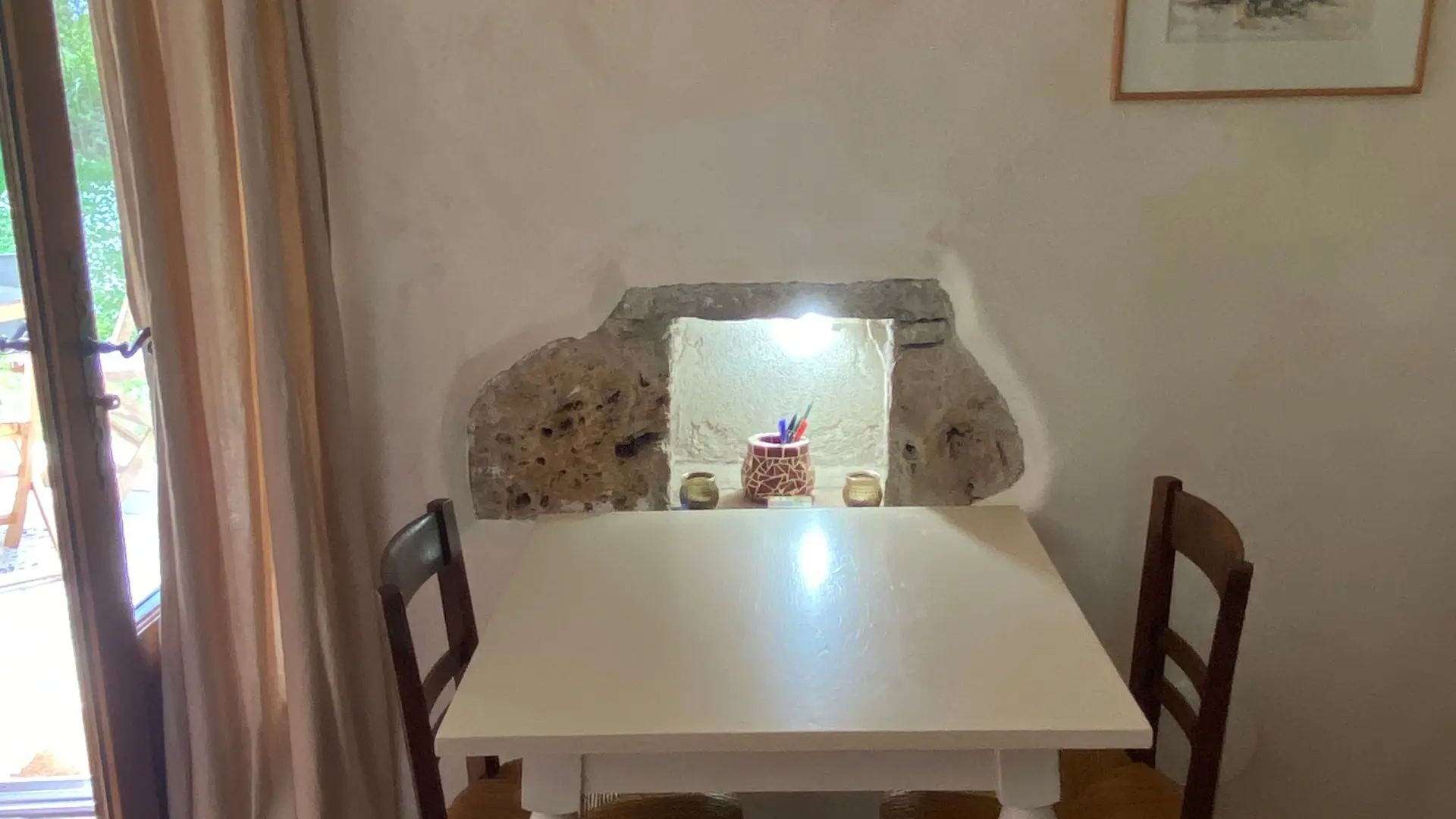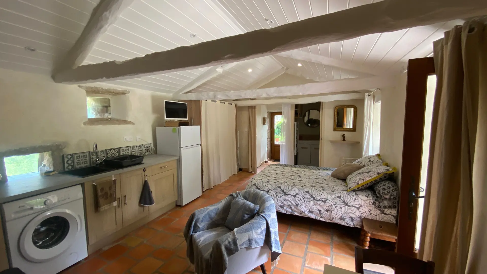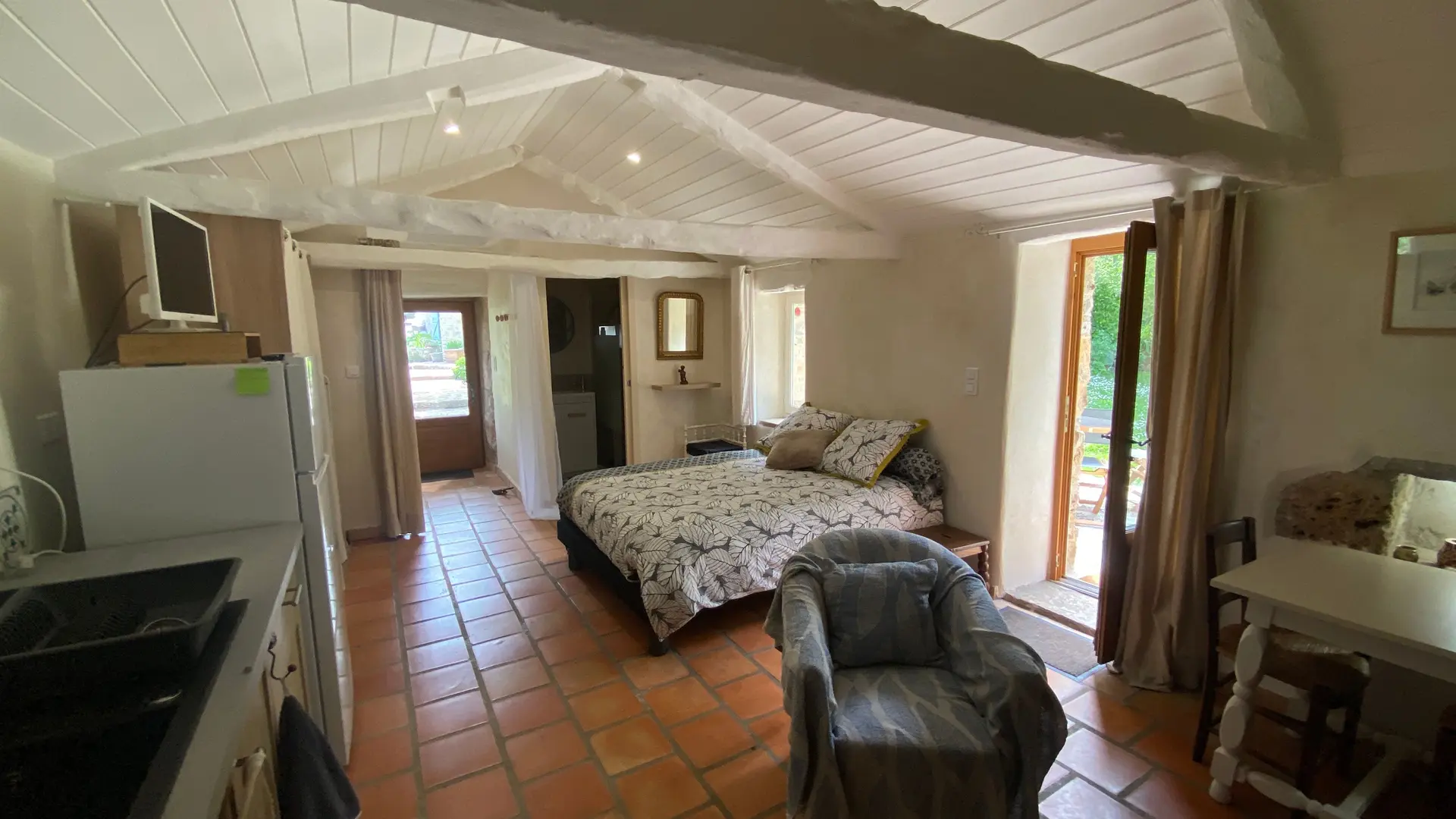 L'ancien four constitué d'une seule pièce vous propose : un espace cuisine (éléments intégrés avec plaque, four grill, lave-linge, réfrigérateur, congélateur, table, chaises) Un espace nuit ( 1 lit 140), et un coin salon devant le poêle à granulés (2 fauteuils), accès internet/wifi. Une salle d'eau fermée (douche, lavabo, sèche serviettes chauffant). Un wc indépendant. TV. Rangement dans penderie. Terrasse avec salon de jardin et salon de détente, barbecue fixe. Linge de lit et de toilette fournis compris dans le prix.