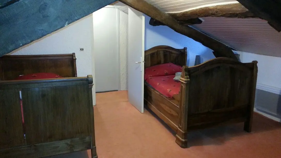 Dans un hameau, gîte indépendant. Au rdc : séjour (cheminée, 1 canapé, 2 fauteuils) avec coin-cuisine (éléments intégrés, MO, LV, LL), 1 ch (1 lit 140), 1 ch (1 lit 90), salle d'eau, wc. A l'étage 1 ch mansardée (2x120). Jardin privé clos (500 m2), barbecue, salon de jardin, 5 relax de jardin. Chauffage électrique.