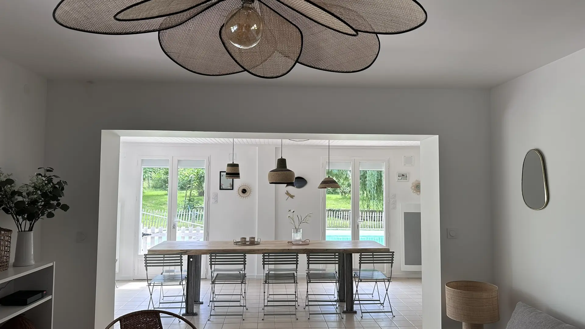 A l'extérieur : grand jardin arboré et clos avec piscine privée 10x4m sécurisée par alarme et ganivelle. Terrasse avec salon de jardin.