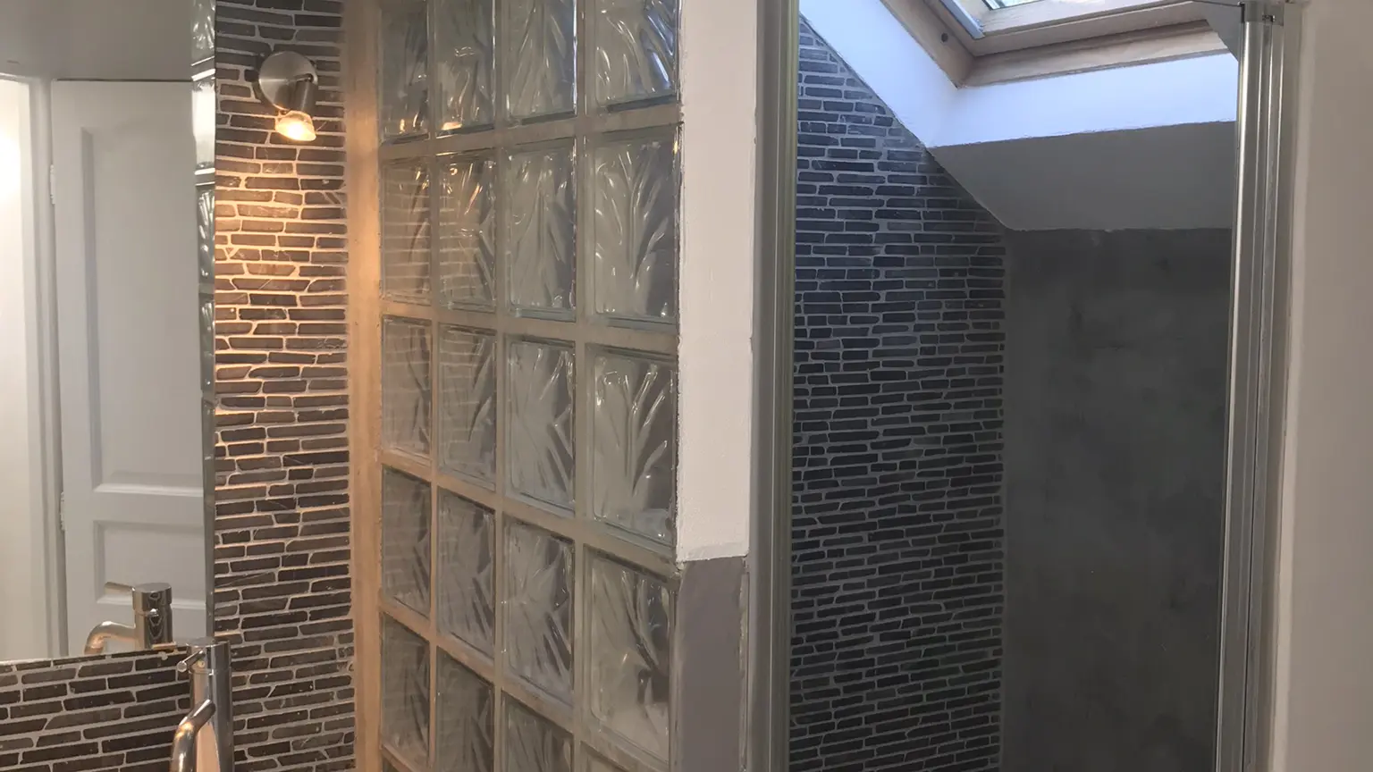 Salle d’eau avec douche ouverte sur le ciel, lavabo et WC