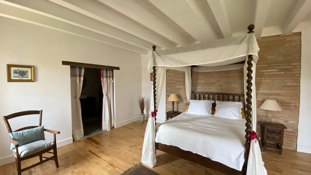 Les deux chambres se trouvent au 1er étage : La chambre baldaquin avec 1 lit baldaquin en 140, un coin salon avec plateau de courtoisie, une salle d'eau avec douche à l'italienne et wc. La chambre printemps avec 1 lit 180, un bureau, un petit coin salon avec plateau de courtoisie, une grande salle de bains avec baignoire, douche à l'italienne, et wc. Dans les deux chambres, possibilité de rajouter un lit d'appoint 1 personne. Wifi dans la maison et dans les chambres. Cour gravillonnée et parc avec point de vue sur les Pyrénées. Le matin, vous pourrez savourer un copieux petit-déjeuner avec des produits maison. Le soir, sur réservation, vous pourrez partager un moment de convivialité en table d'hôtes dans la grande salle à manger. Louis vous régalera avec les bons produits de notre région et les vins du terroir devant la grande cheminée.