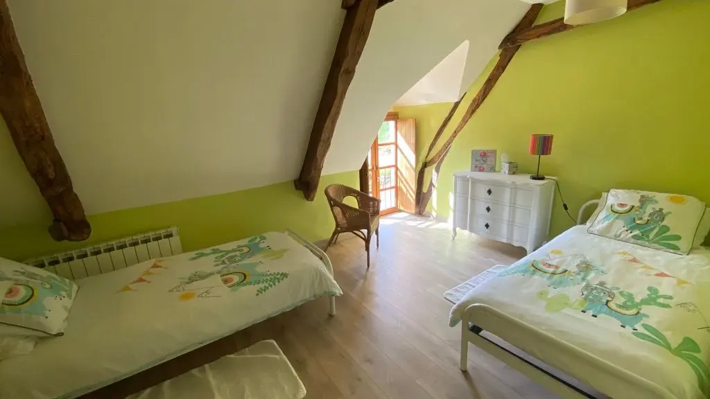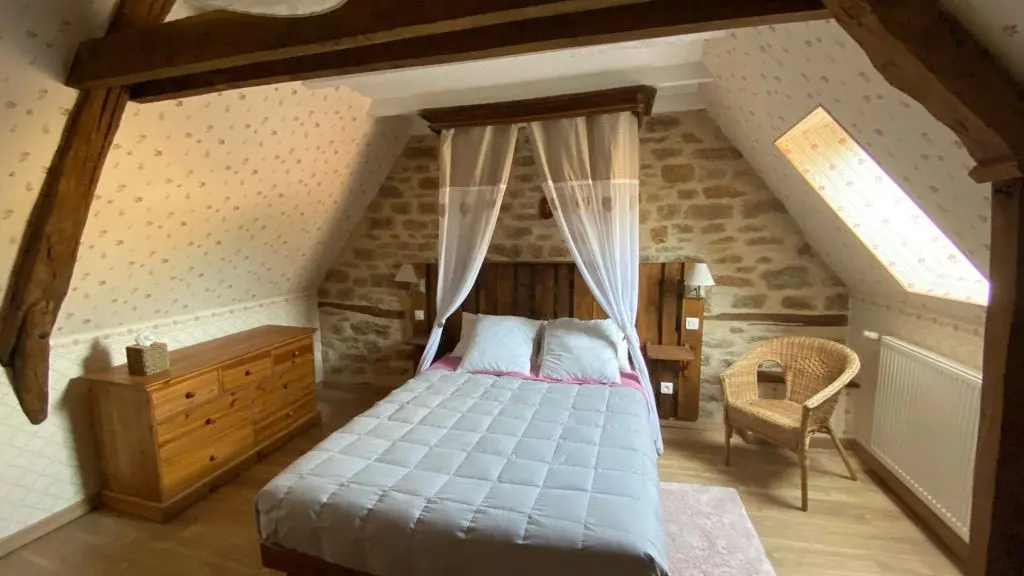 Tourné vers la campagne, le Cottage comprend une belle pièce à vivre (1 canapé d'angle 6 places, 1 fauteuil, poêle à bois, TV, table repas), une cuisine de grand confort aménagée avec éléments intégrés (lave-vaisselle, réfrigérateur, congélateur, micro-ondes, four), un placard avec lave-linge. A l'étage, une chambre (1 lit 2 personnes en 140), une chambre (1 lit 2 personnes en 160), une chambre (2 lits en 0,90) salle de bains avec wc. 1 grande terrasses couverte avec salon de jardin, barbecue, qui donne accès à une salle d'eau fermée avec wc douche à l'italienne. Piscine privée avec alarme devant la terrasse avec bains de soleil. Trampoline.