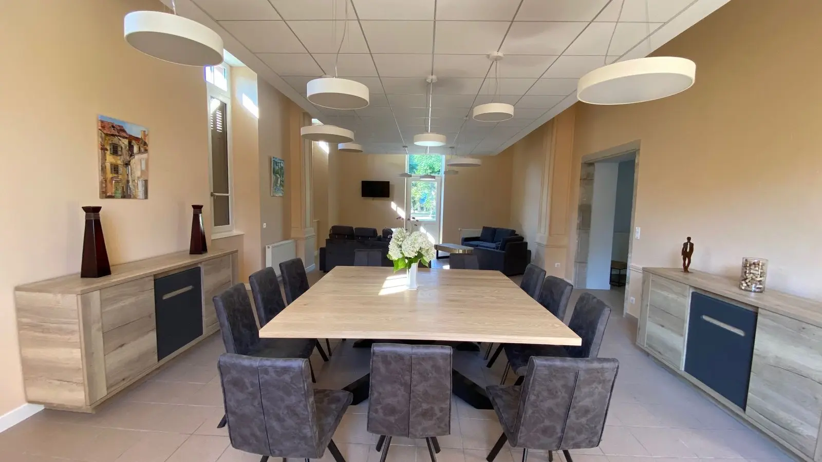 Au rez-de-chaussée, le logement comprend, un grand hall d'entrée, une très grande pièce à vivre (canapé, fauteuils table basse) table repas, chaises, TV. Une cuisine indépendante de type intégrée (micro ondes, lave vaisselle 2 réfrigérateurs, 1 congélateur, 2 plaques à induction), (wc indépendant dont 1 accessible personne à mobilité réduite avec lave-mains), buanderie avec sèche linget et lave linge). Au 1er étage avec ascenseur ou escalier 2 ch (2 lits 0,80 rapprochables avec salle d'eau privative et wc chacune), 1 chambre double (3 lits 0,80 dont 2 rapprochables), 1 salle d'eau privative avec wc. Au 2ème étage avec ascenseur ou escalier : 1 ch (2 lits 0,80 rapprochables avec salle d'eau privative et wc), 1 chambre double (3 lits 0,80 dont 2 rapprochables), 1 salle d'eau privative avec wc. 1 espace détente. Terrasse 85 m2 avec salon de jardin, Espaces extérieur avec salon de jardin. Possibilité d'accès à une aire pique-nique au bord de l'Aveyron , ombragée. Location possible de canoë sur place.