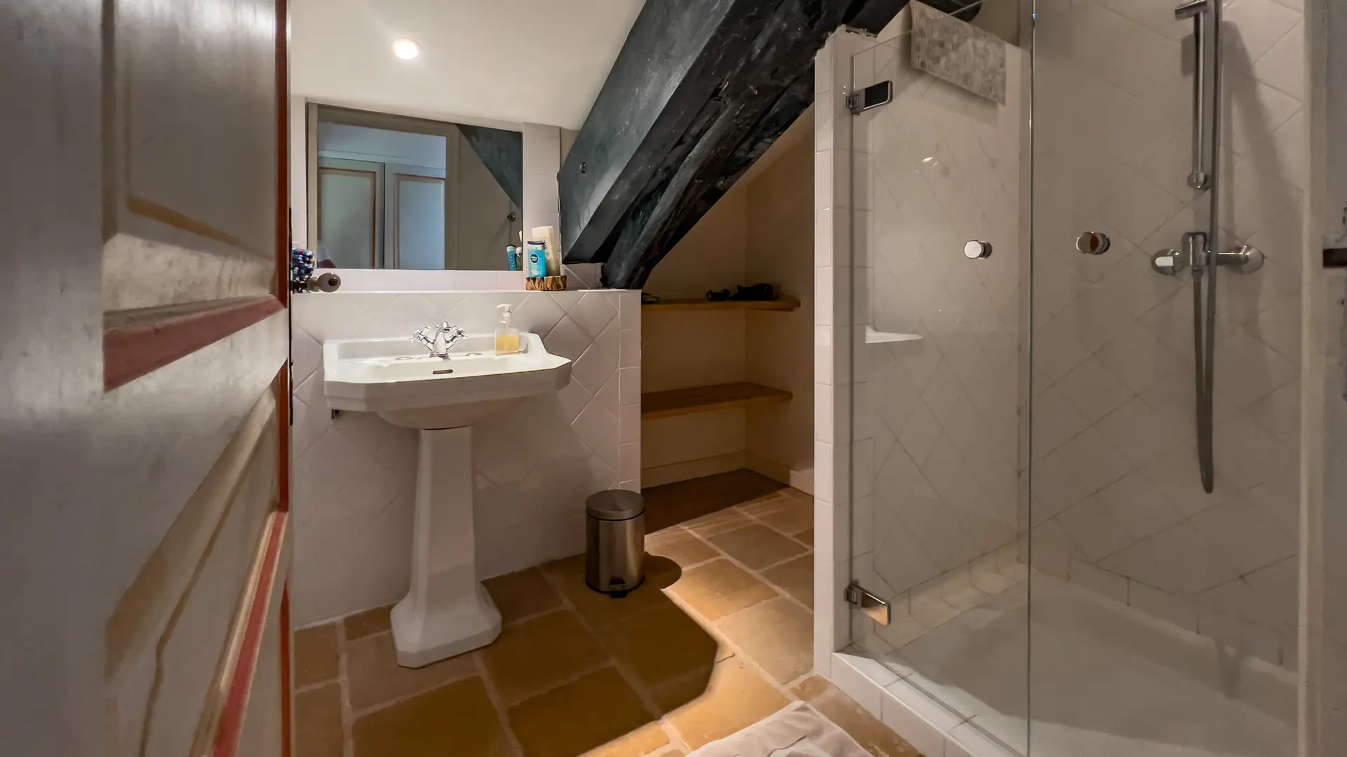 A l'étage, la chambre double surplombe la terrasse, tandis que la chambre voisine dispose de trois lits simples avec une vue splendide sur le jardin fleuri. La salle de bain et le deuxième WC se trouvent également à cet étage. Le chauffage électrique est disponible dans toutes les chambres.