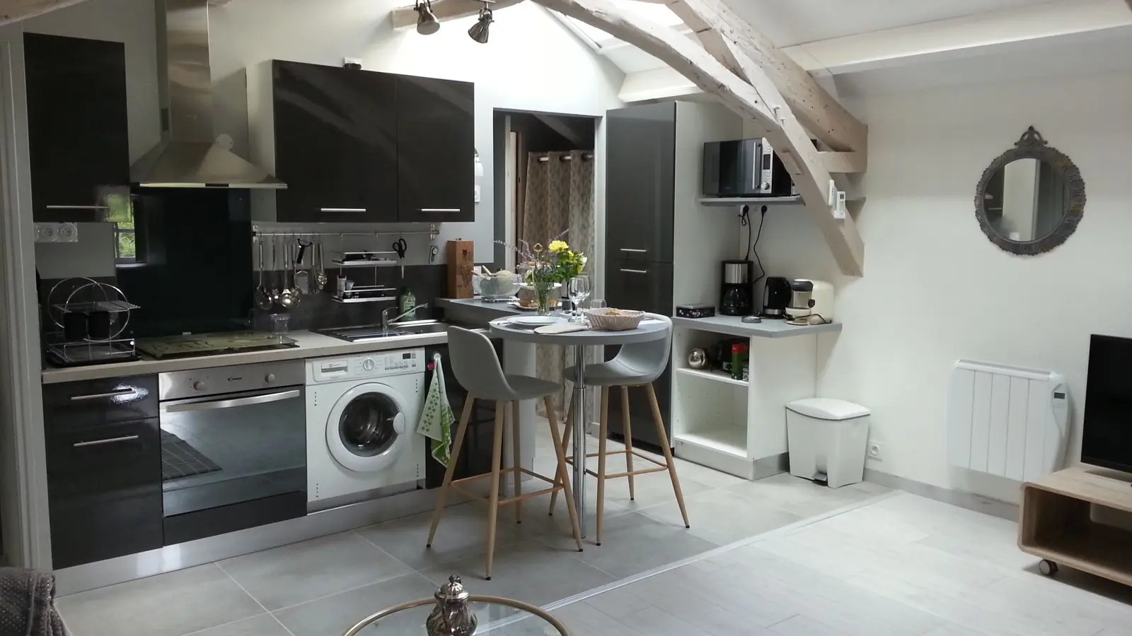 Entièrement au 1er étage, le studio comprend : une pièce à vivre avec espace cuisine (éléments intégrés LL MO Réfrigérateur, congélateur), et coin-salon (TV) ; un wc indépendant (lave-main) ; un espace chambre (1 lit 160 dressing) 1 salle d'eau privative. Wifi dans tout le logement.