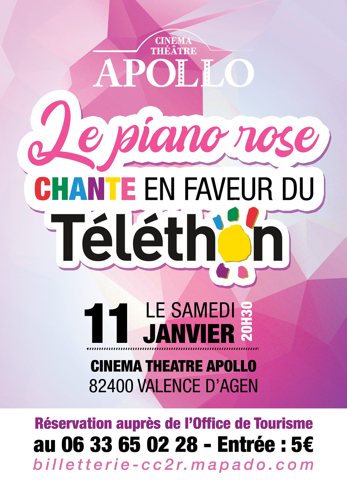 Venez vivre un moment musical inoubliable pour une noble cause le samedi 17 janvier à 20:30 au Cinéma Théâtre l'Apollo à Valence d'Agen (82440). Le Piano Rose chantera en faveur du Téléthon.